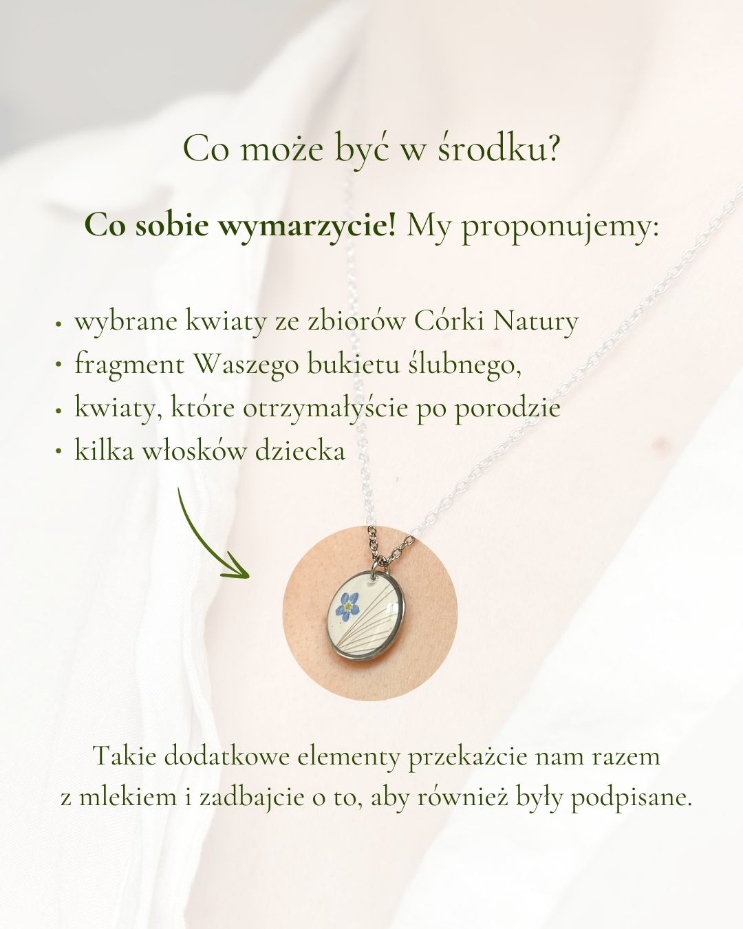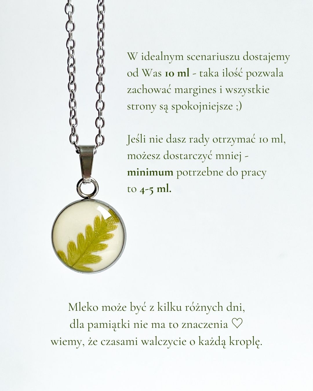 Prace trwały wiele miesięcy i wymagały ścisłej współpracy mądrych i twórczych głów 🙂 Dzięki temu udało nam się opracować formułę, w której zakonserwowane mleko staje się trwałą częścią biżuterii. Taką pamiątkę możemy też dodatkowo ozdobić wybranym przez Ciebie kwiatkiem, fragmentem bukietu, który dostałaś po porodzie czy włoskami dziecka. A to tylko kilka opcji! Ponieważ do każdej realizacji podchodzimy indywidualnie, Twoja biżuteria może być całkowicie spersonalizowana – od kształtu, przez dodatki, kolory, aż po długość łańcuszka.