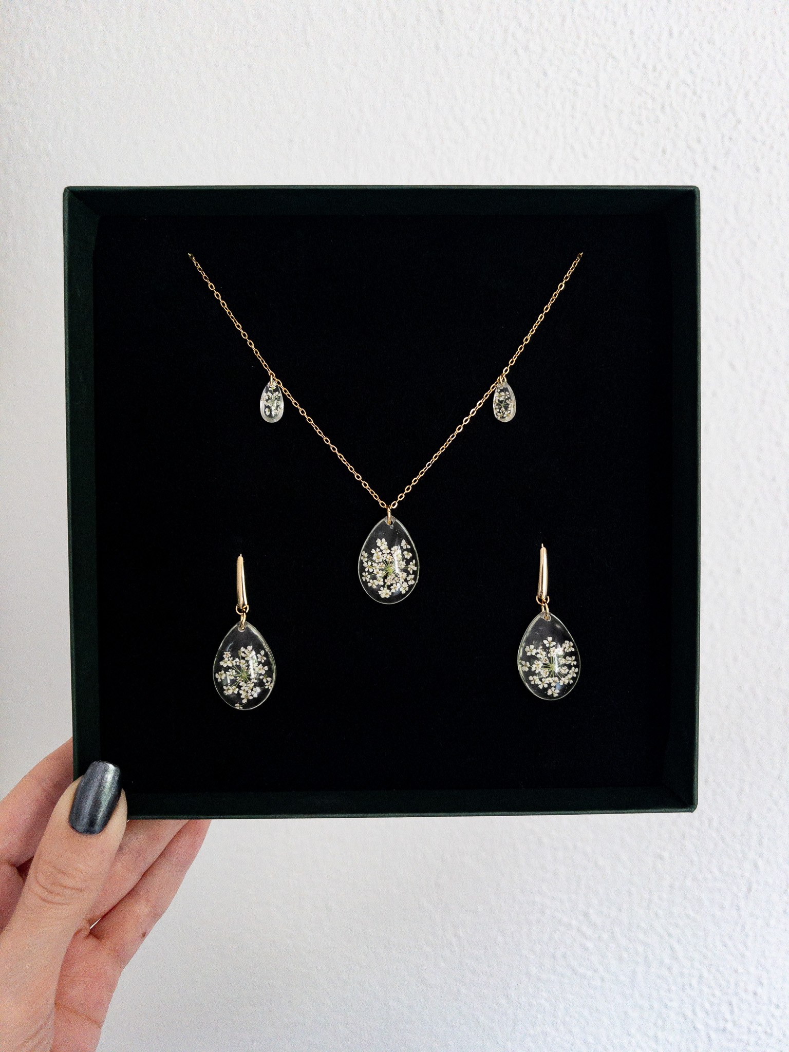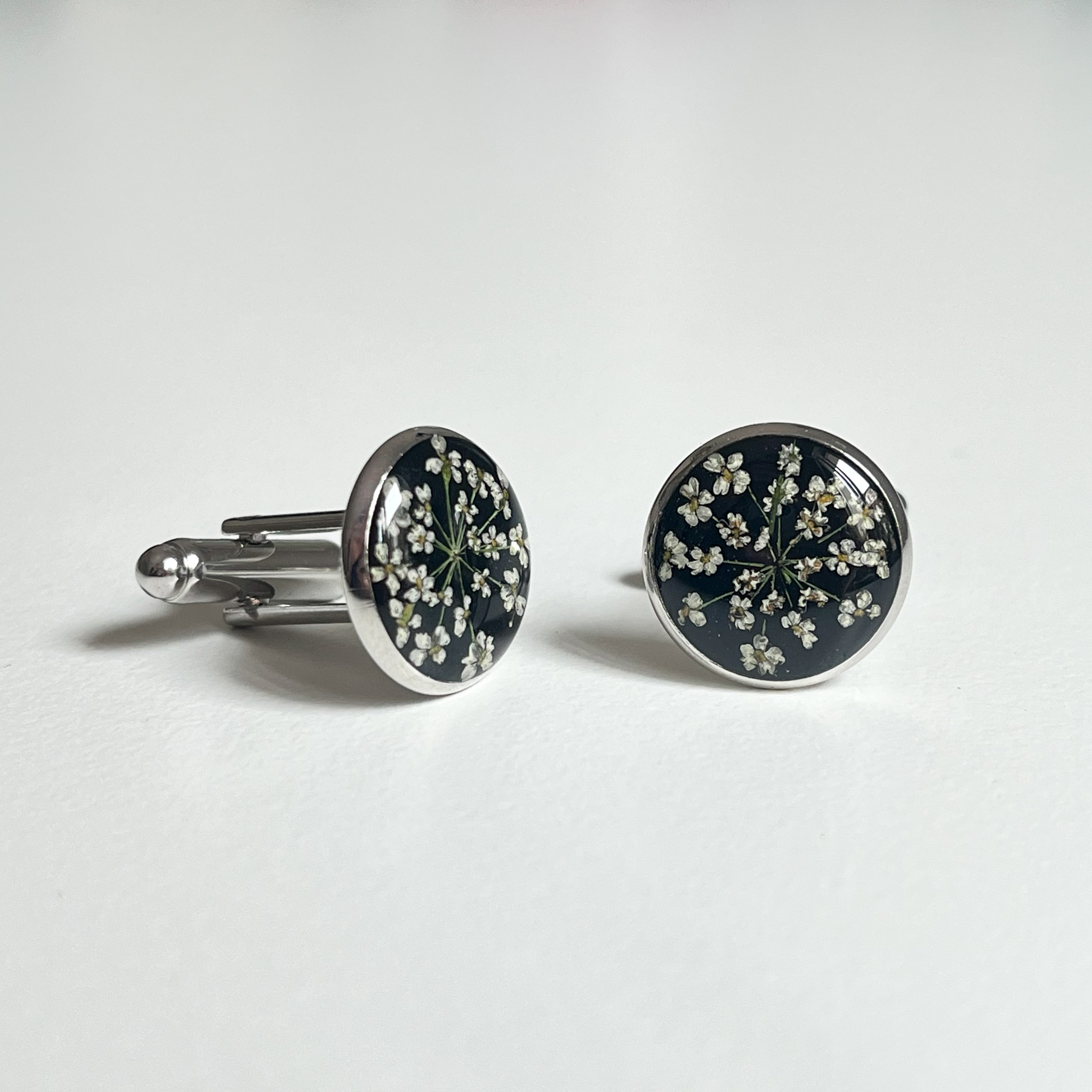 Kropelkowy zestaw z koronkową dziką marchwią. Wykonany na zamówienie dla Kingi na dzień jej ślubu ♡ dla Pana Młodego powstały spinki do mankietów z tą samą rośliną.