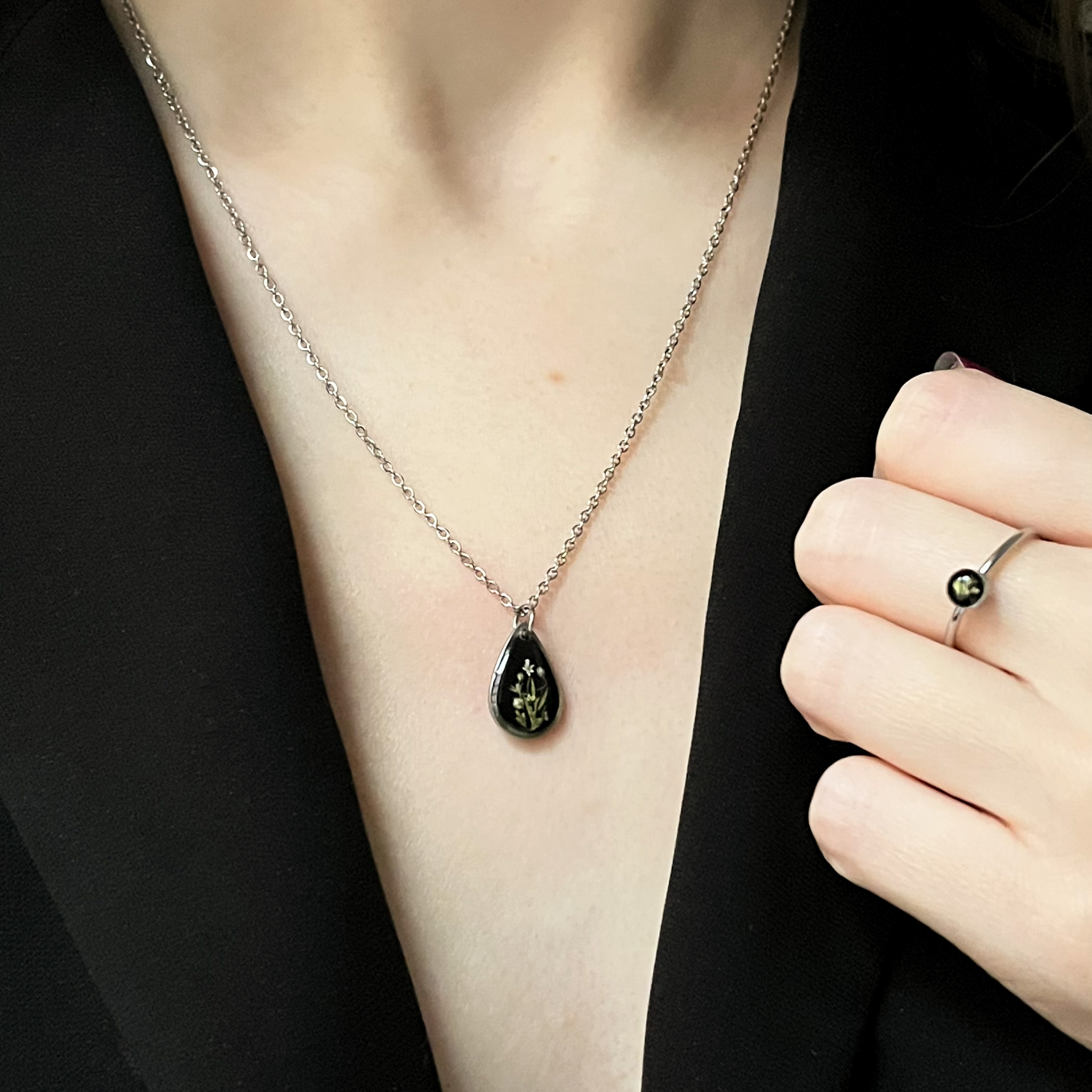Drobna, delikatna biżuteria z czarnym tłem: naszyjnik z łezką i pierścionek z małym oczkiem