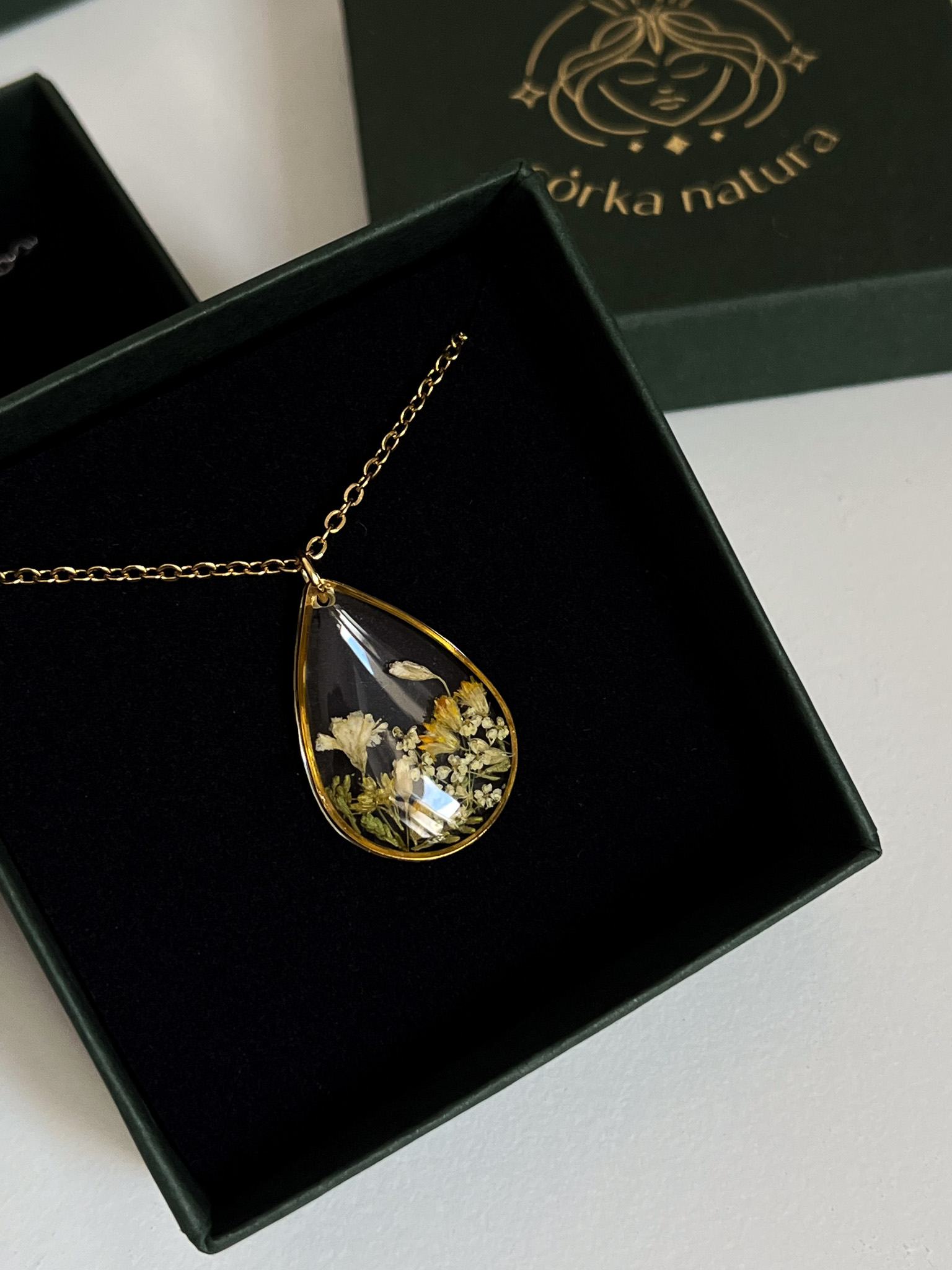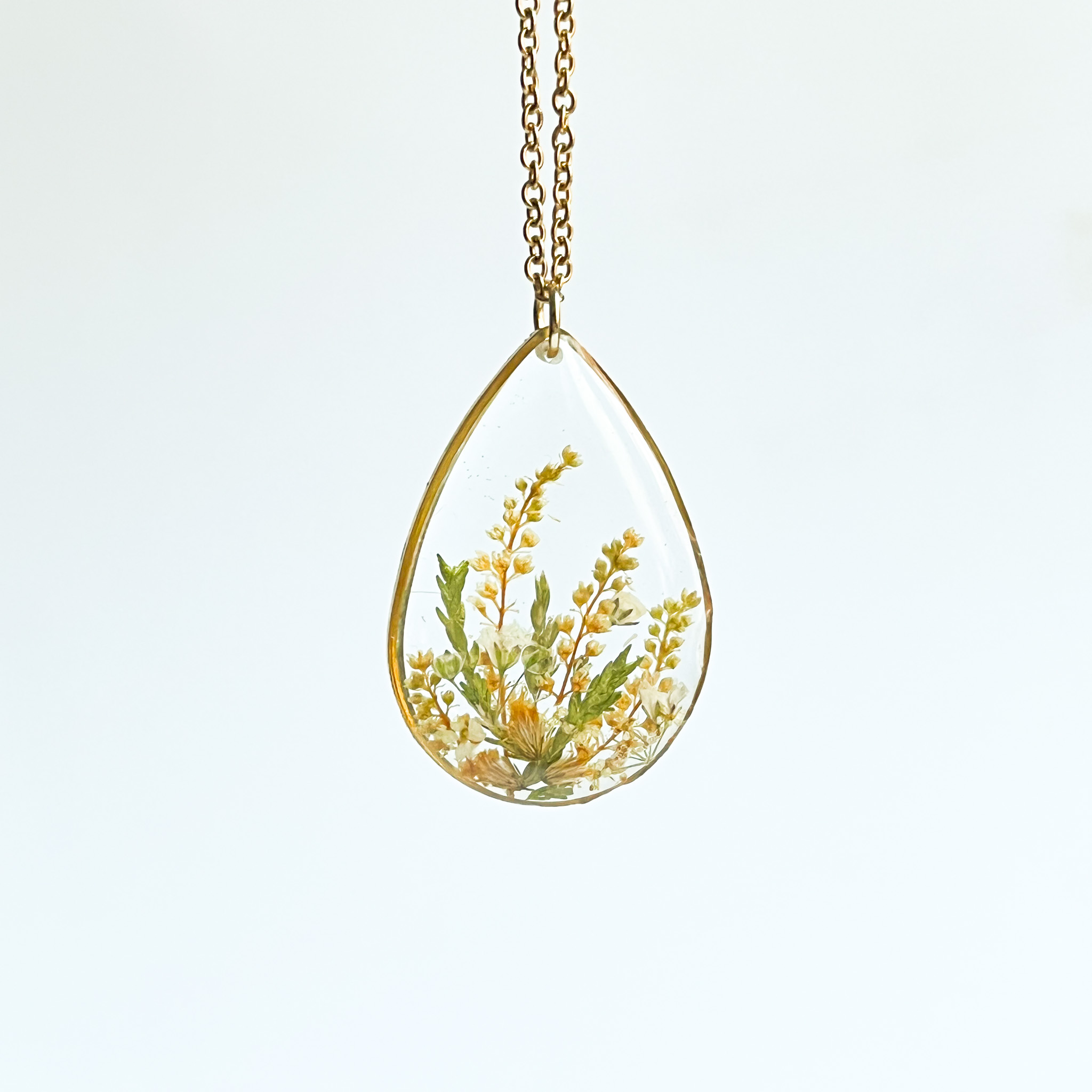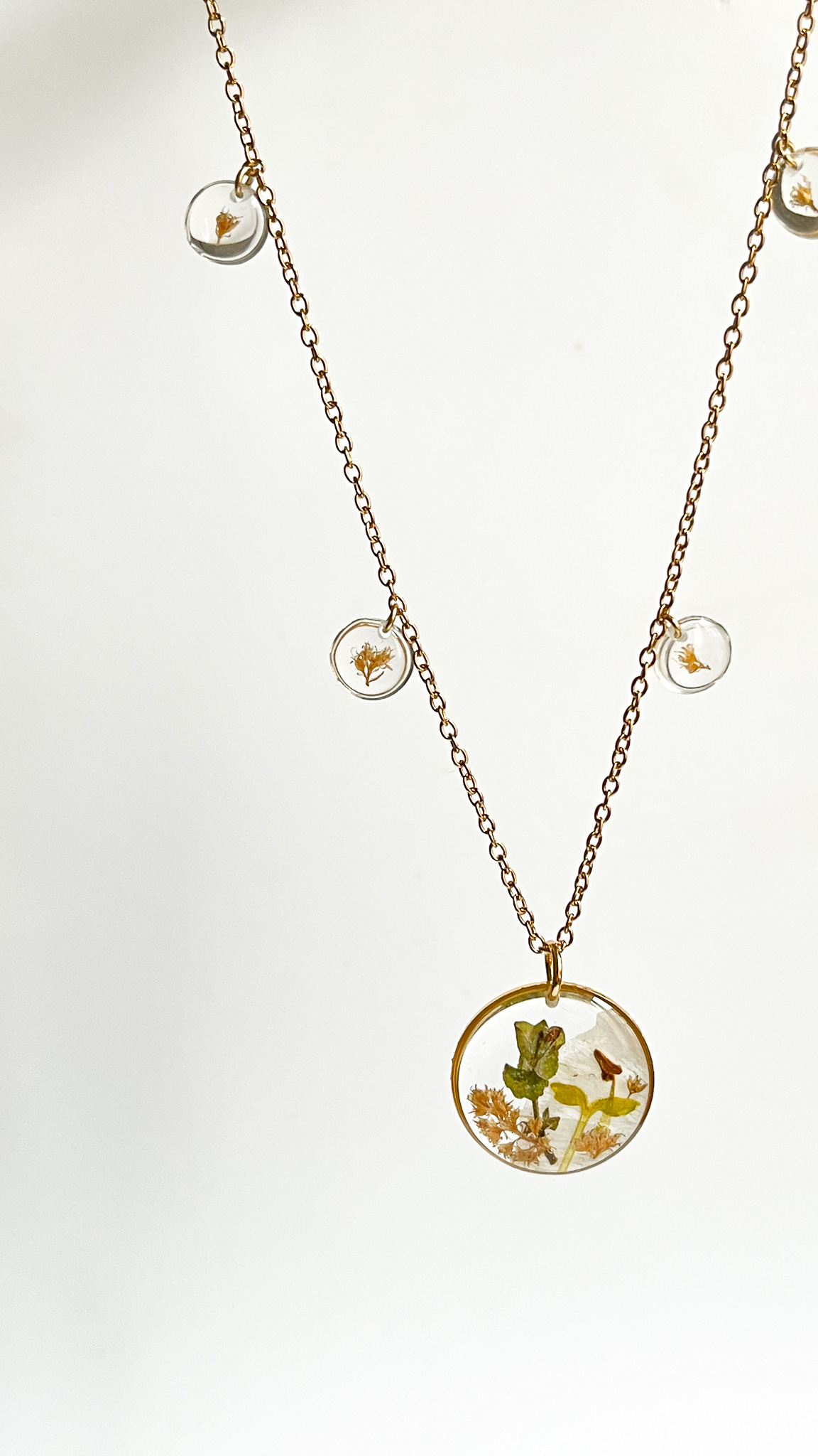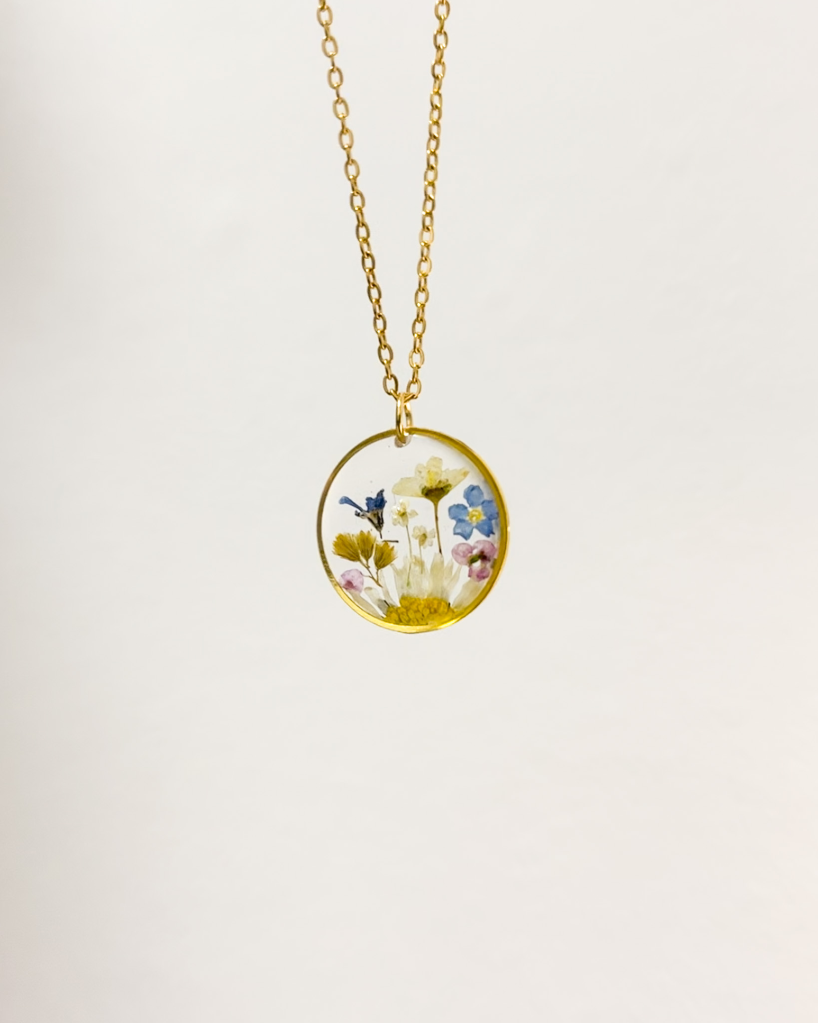 Naszyjnik dla przyjaciółki-miłośniczki natury z prawdziwym bogactwem roślin! Mamy tu stokrotkę, nawłoć, krwawnik, niezapominajkę, tawułę i dziką marchew.