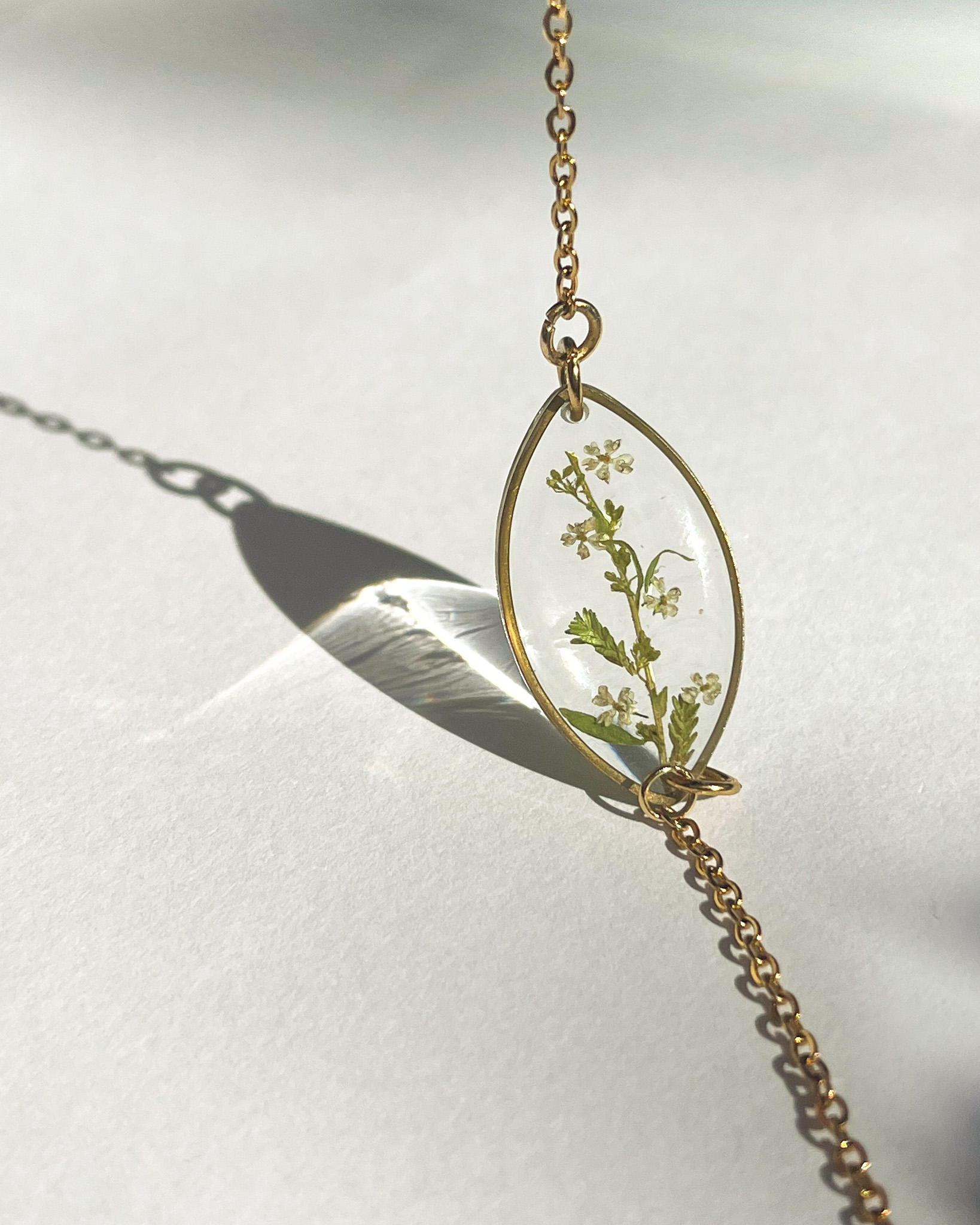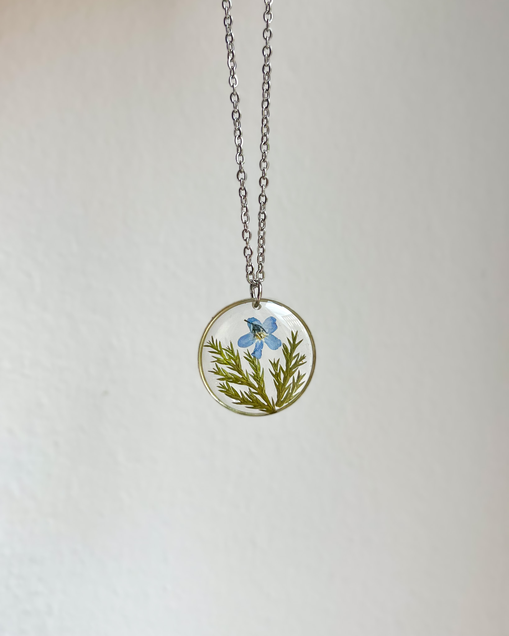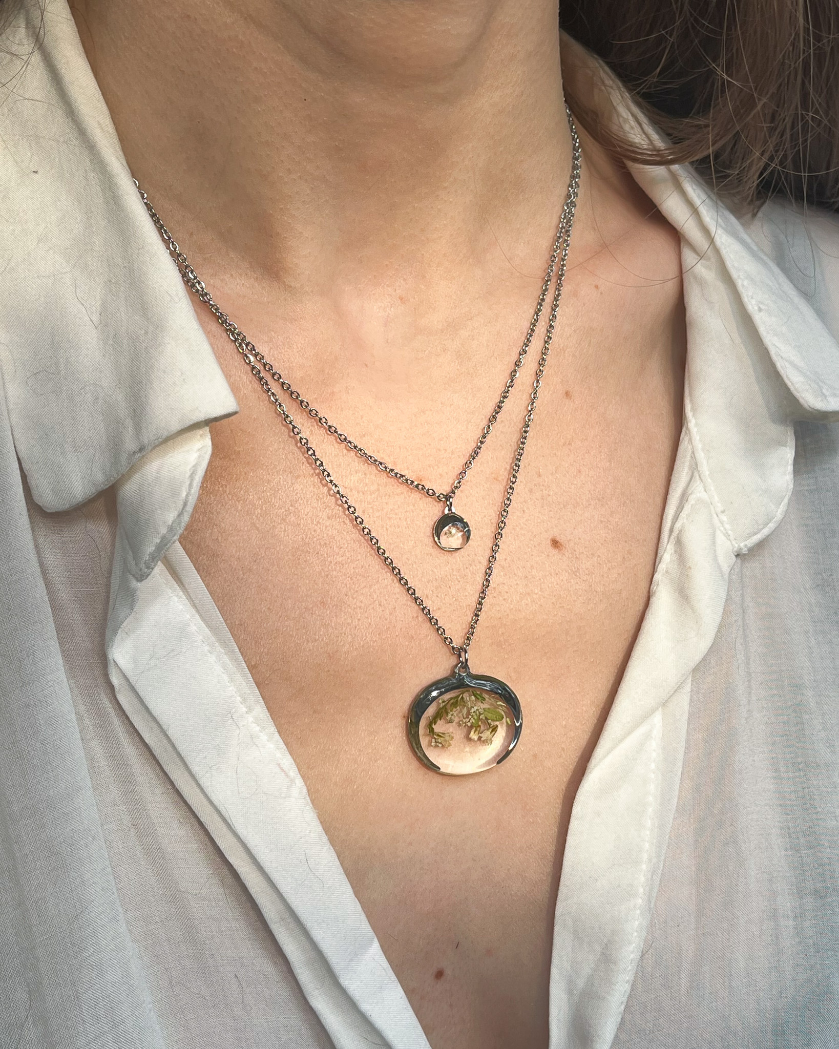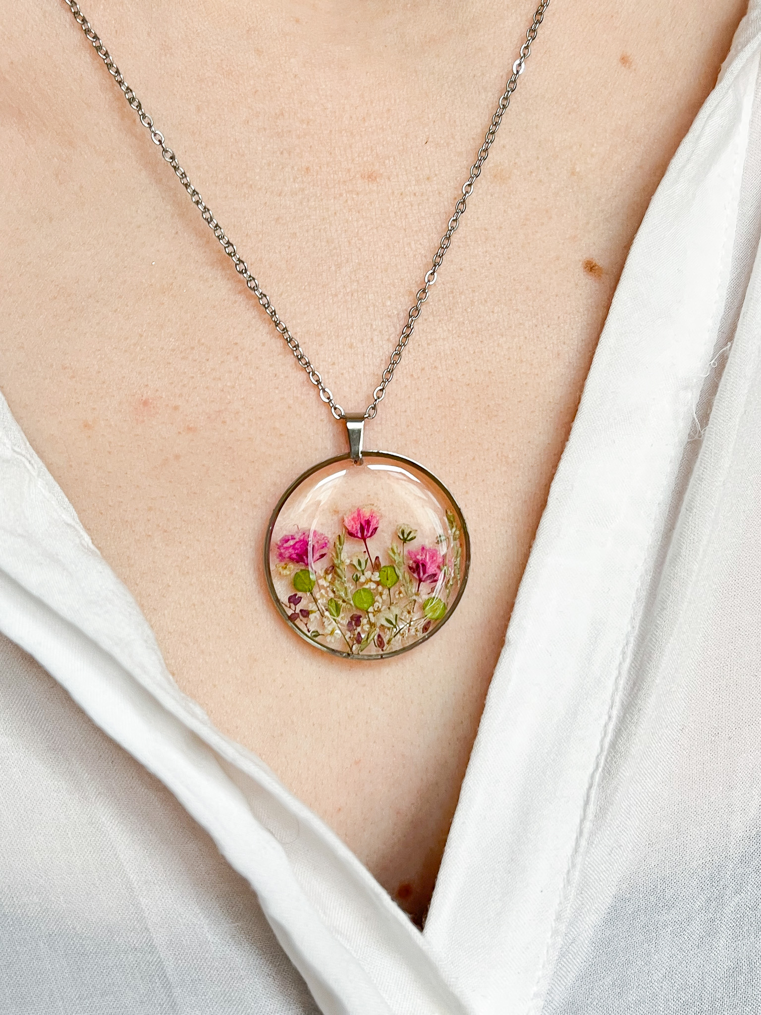 Naszyjnik dla przyjaciółki-miłośniczki natury z prawdziwym bogactwem roślin! Mamy tu stokrotkę, nawłoć, krwawnik, niezapominajkę, tawułę i dziką marchew.