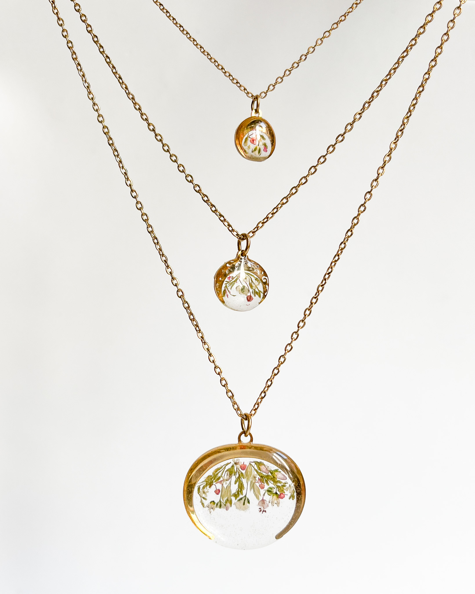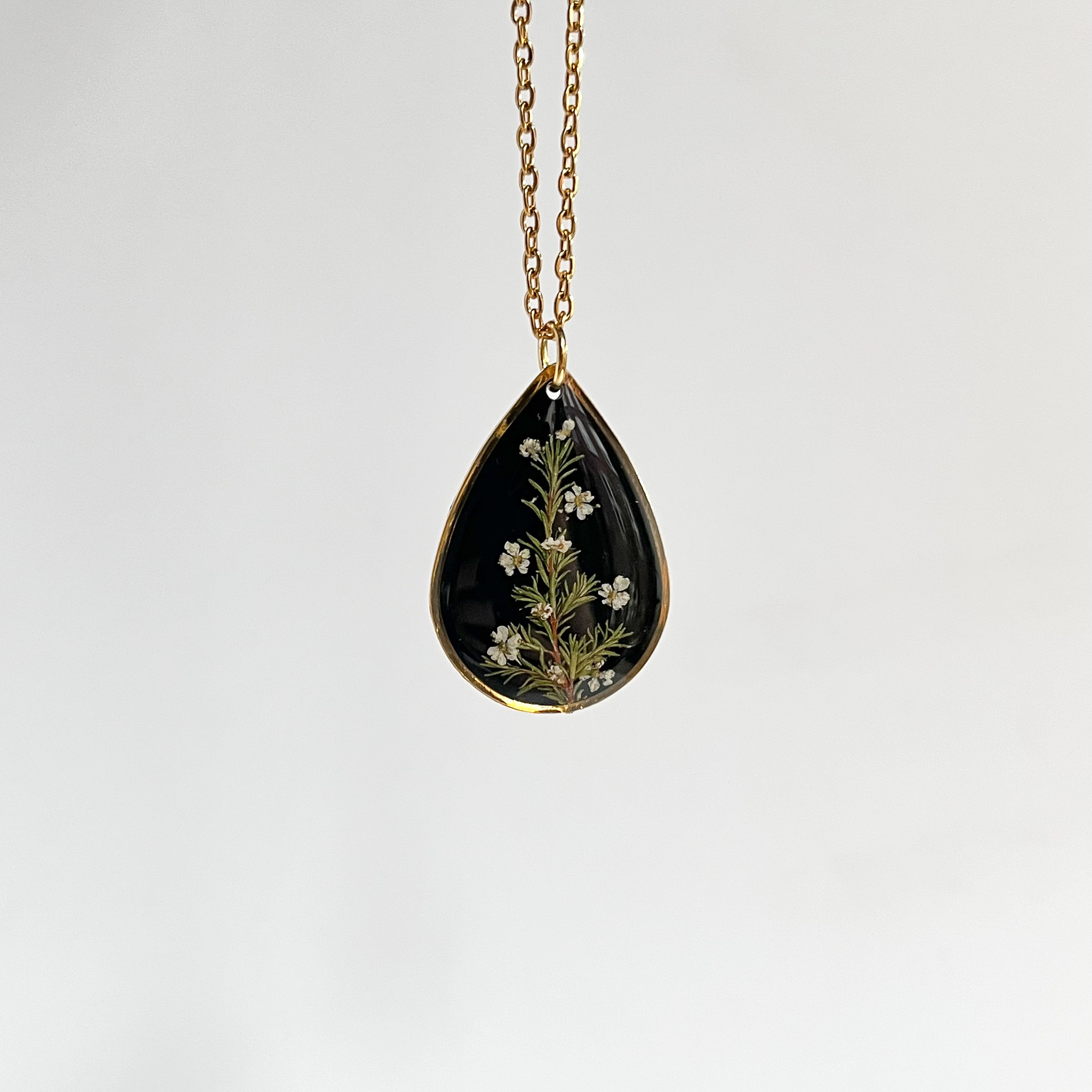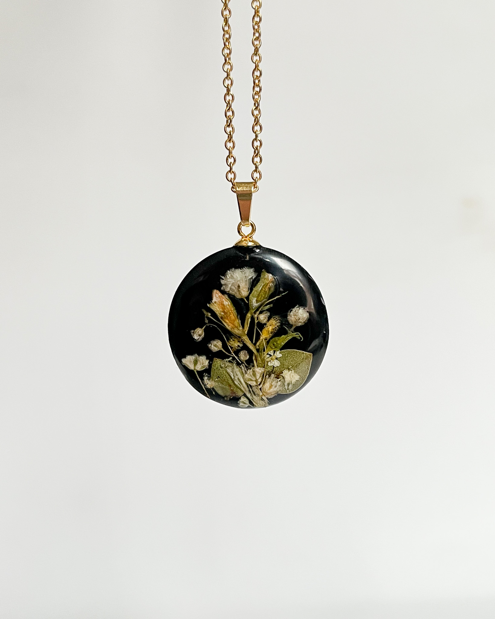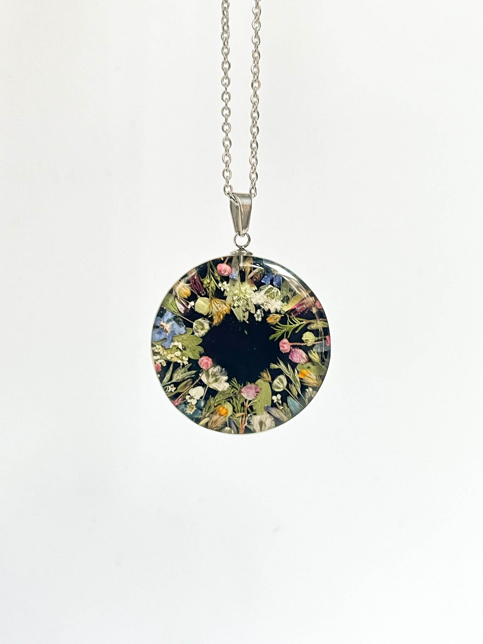 Naszyjnik dla przyjaciółki-miłośniczki natury z prawdziwym bogactwem roślin! Mamy tu stokrotkę, nawłoć, krwawnik, niezapominajkę, tawułę i dziką marchew.