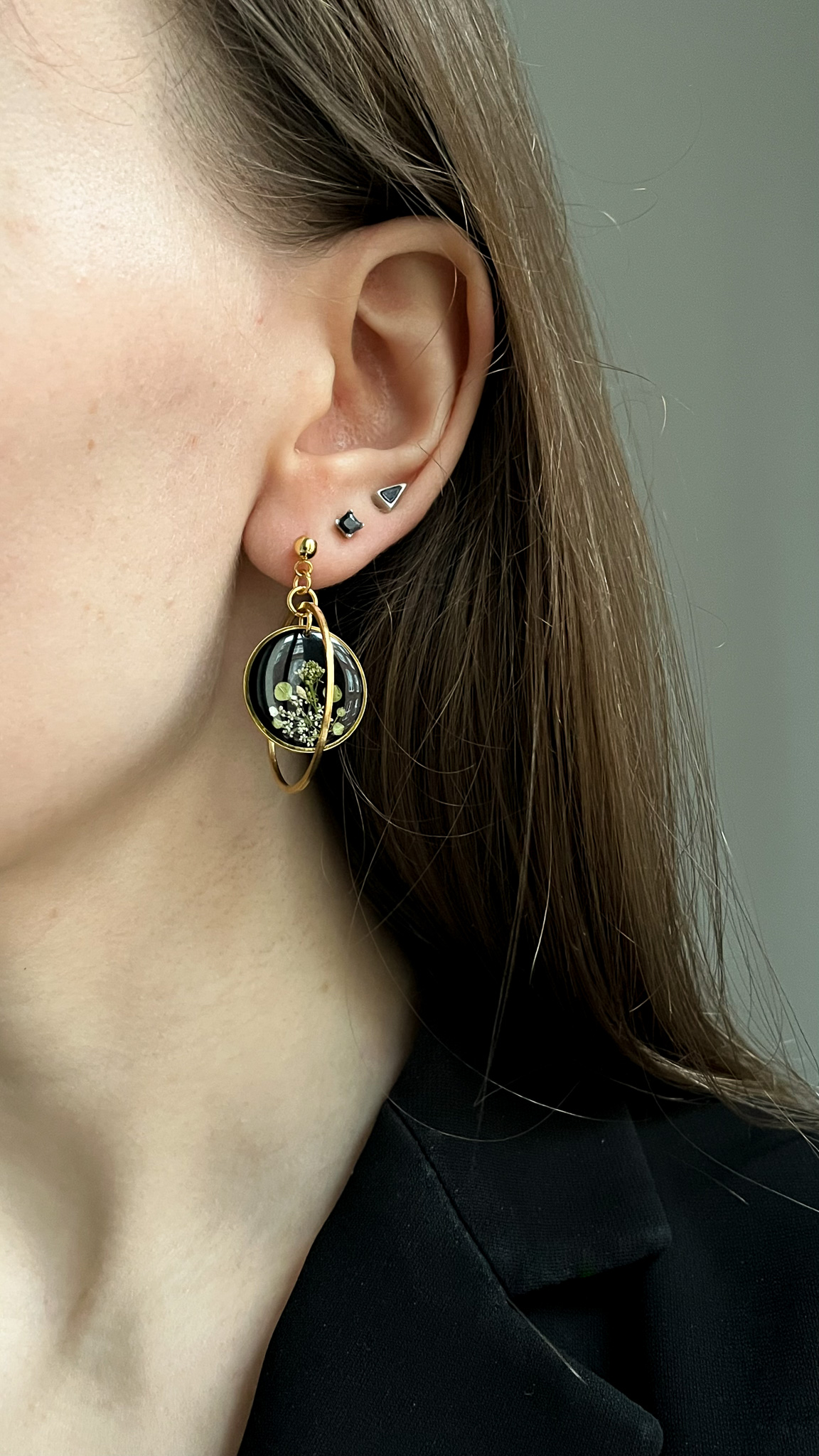 Kolczyki-planety z czarnym tłem i jasnymi roślinami. Zewnętrzna obręcz delikatnie kręci się wokół zawieszki przypominając Saturn