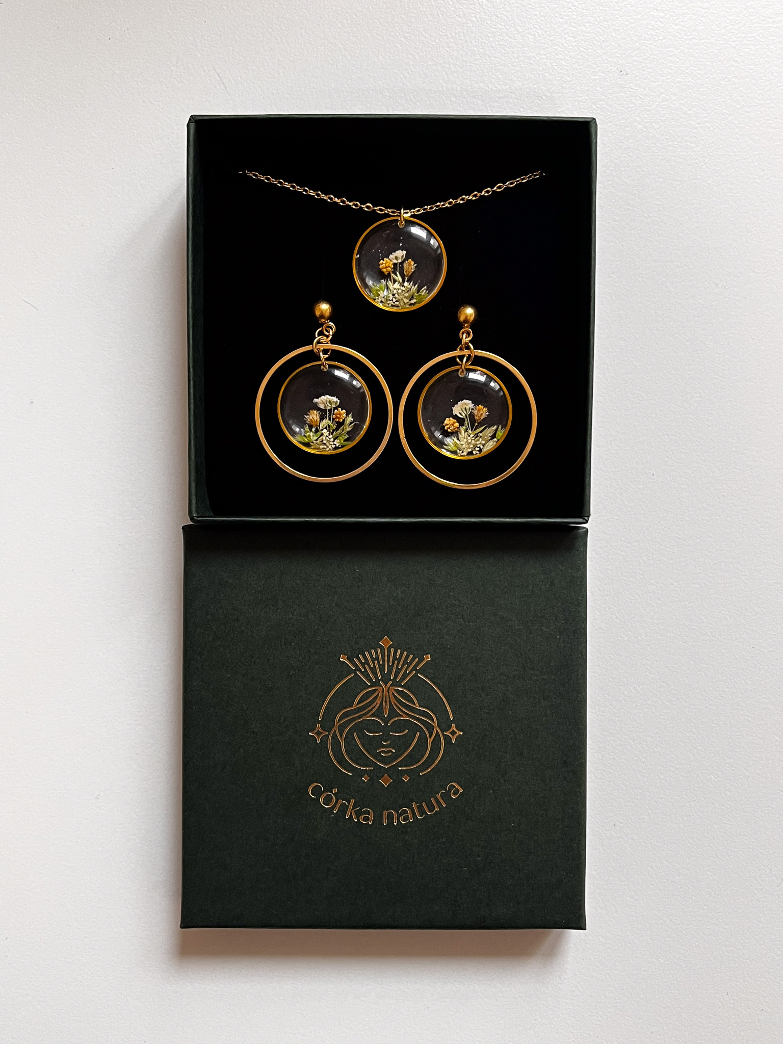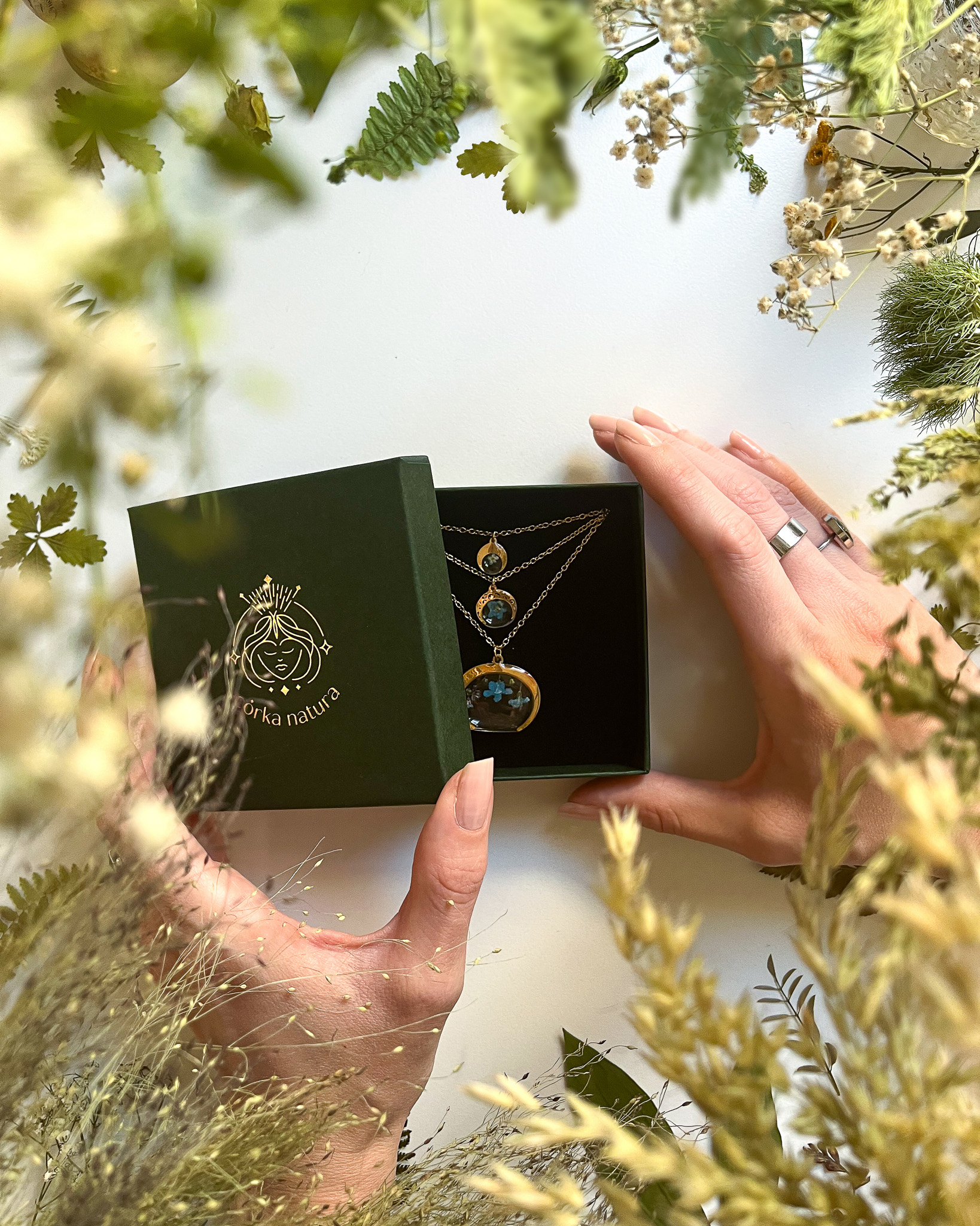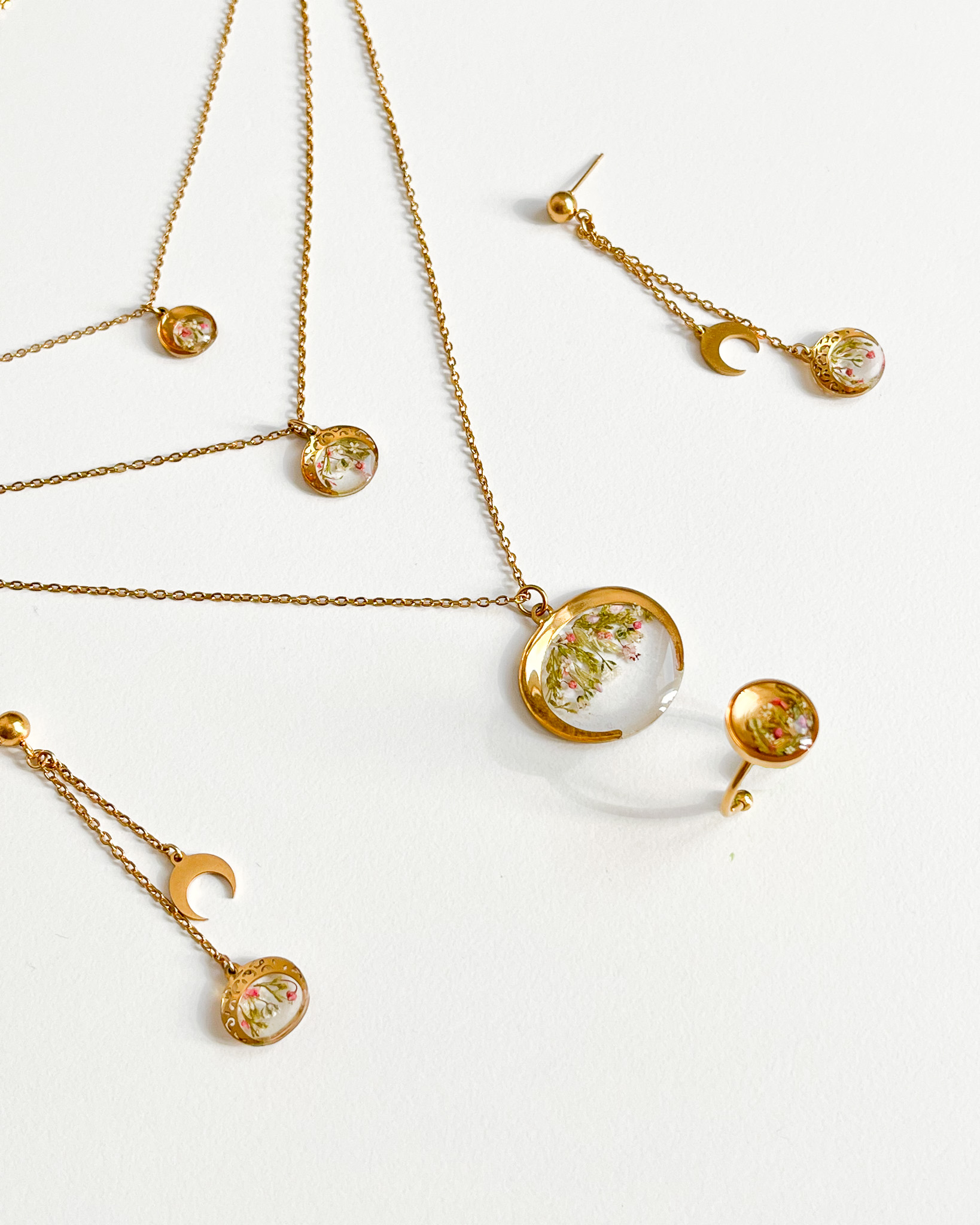 Zestaw potrójnego naszyjnika, wiszących kolczyków i pierścionka z delikatnym motywem łąki. Zawieszki są w kształcie rogu obfitości i księżyca. Cała realizacja poleciała do Norwegii!
