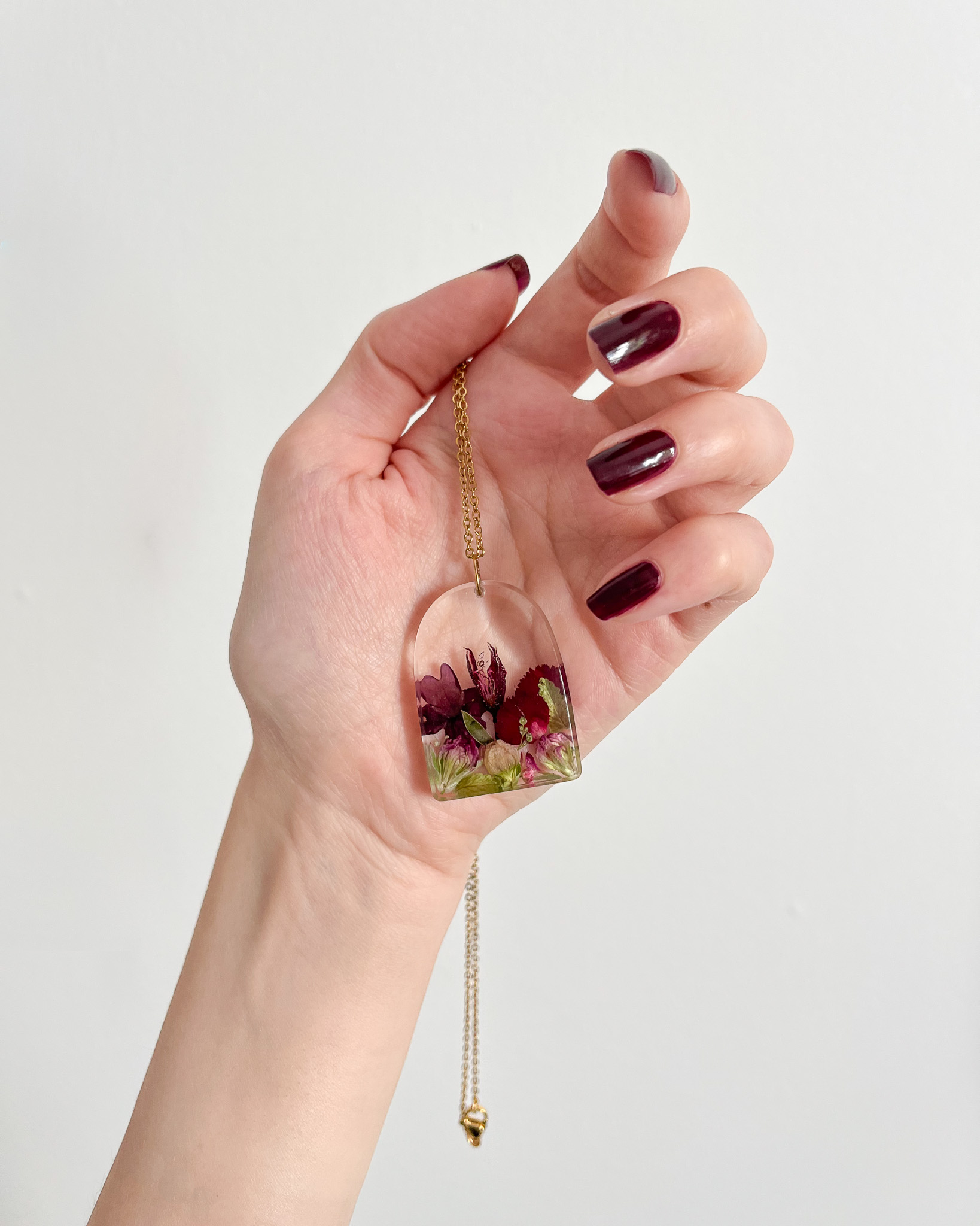 Ten duży, wyjątkowy naszyjnik to moja interpretacja logo firmy Darii, w którym kluczowe role gra kształt zaokrąglonego okna, kwiaty i kolor bordowy.