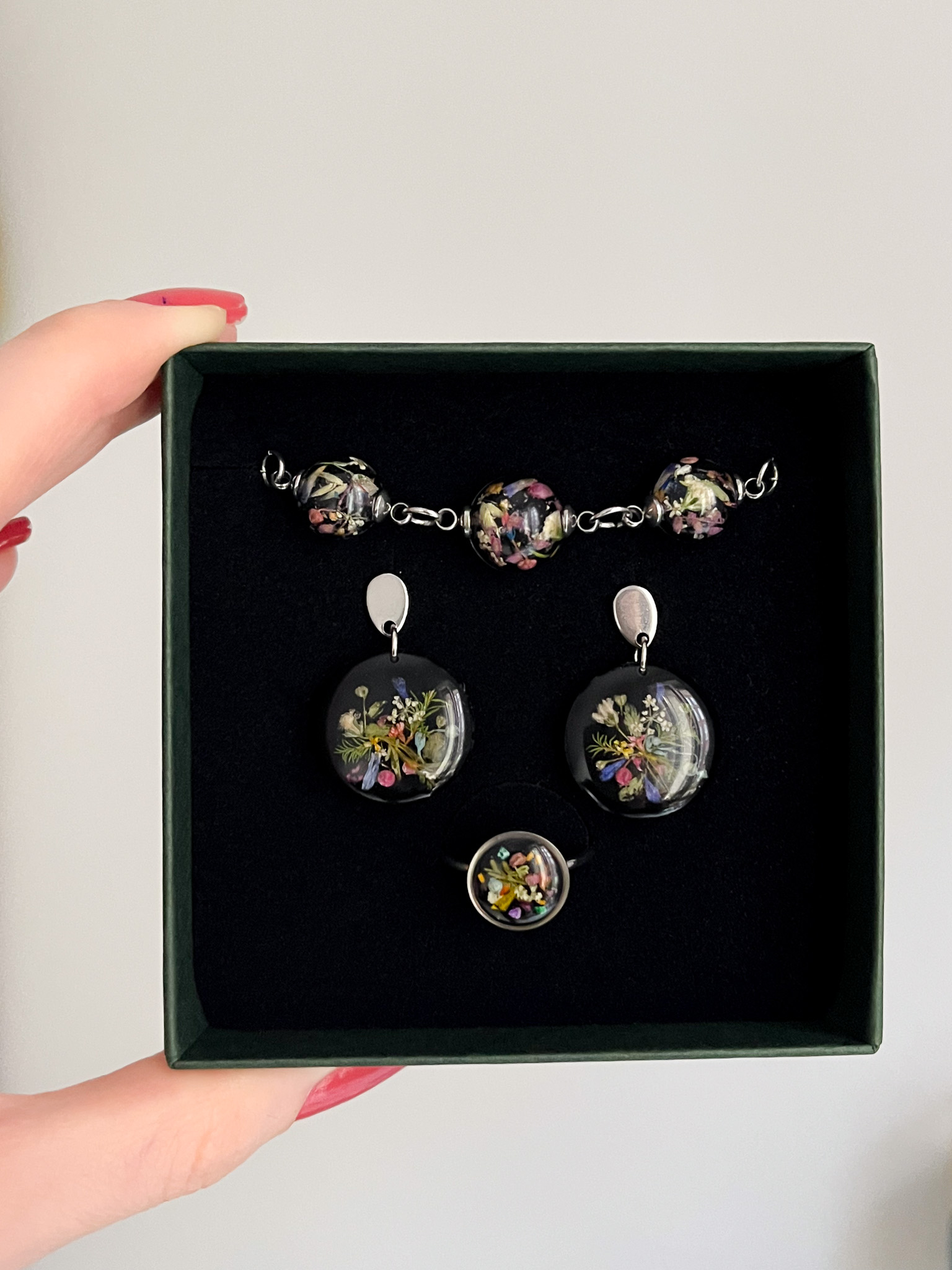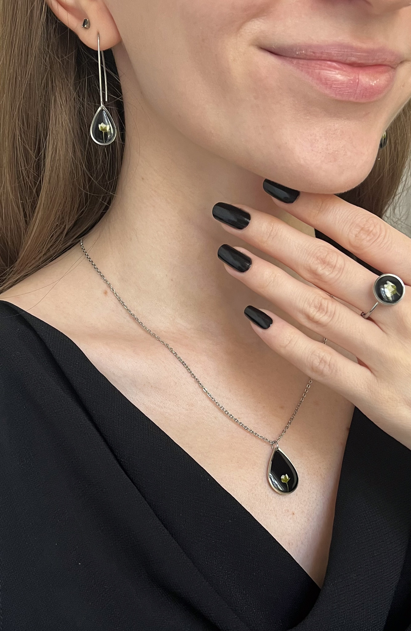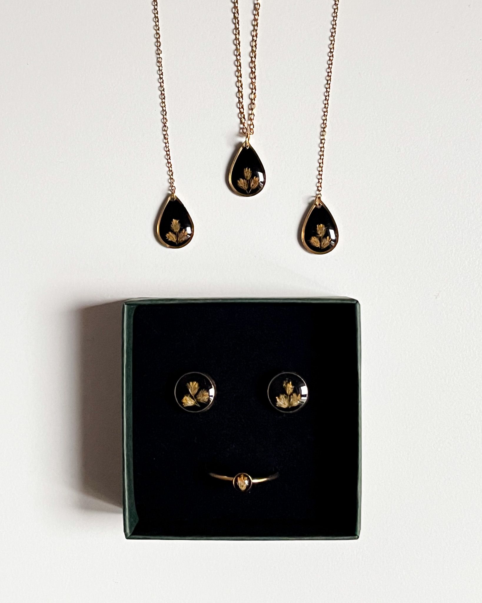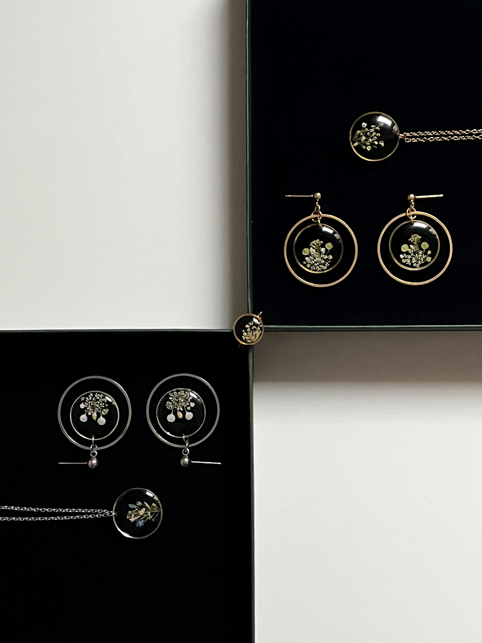 Biżuteria z kolekcji Północnej - kompozycje z jasnych roślin na czarnym tle. Na zdjęciu są dwa naszyjniki, dwie pary kolczyków-planet i pierścionek.