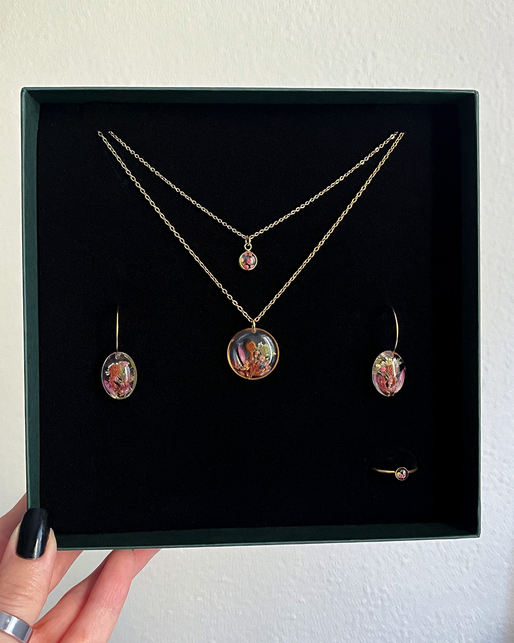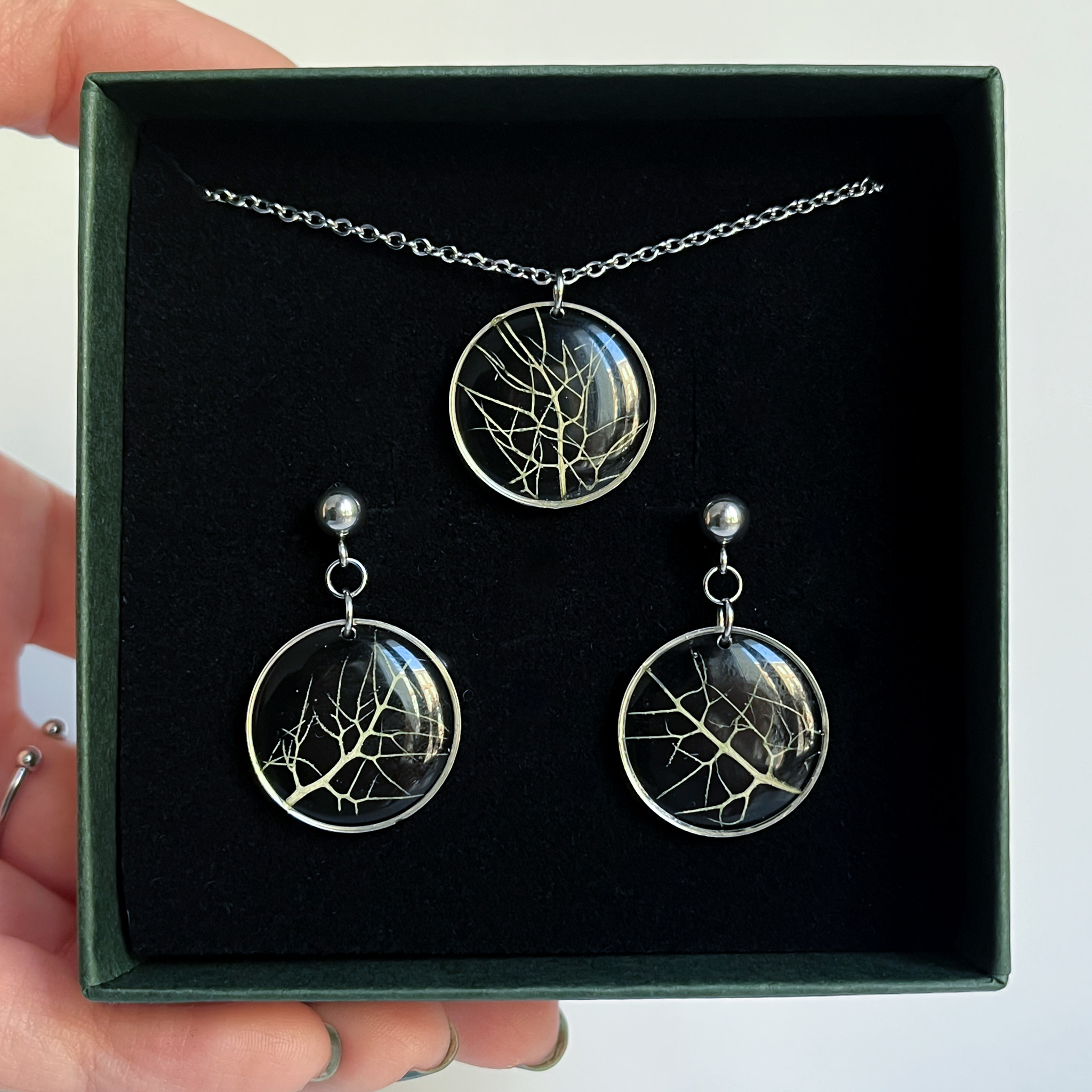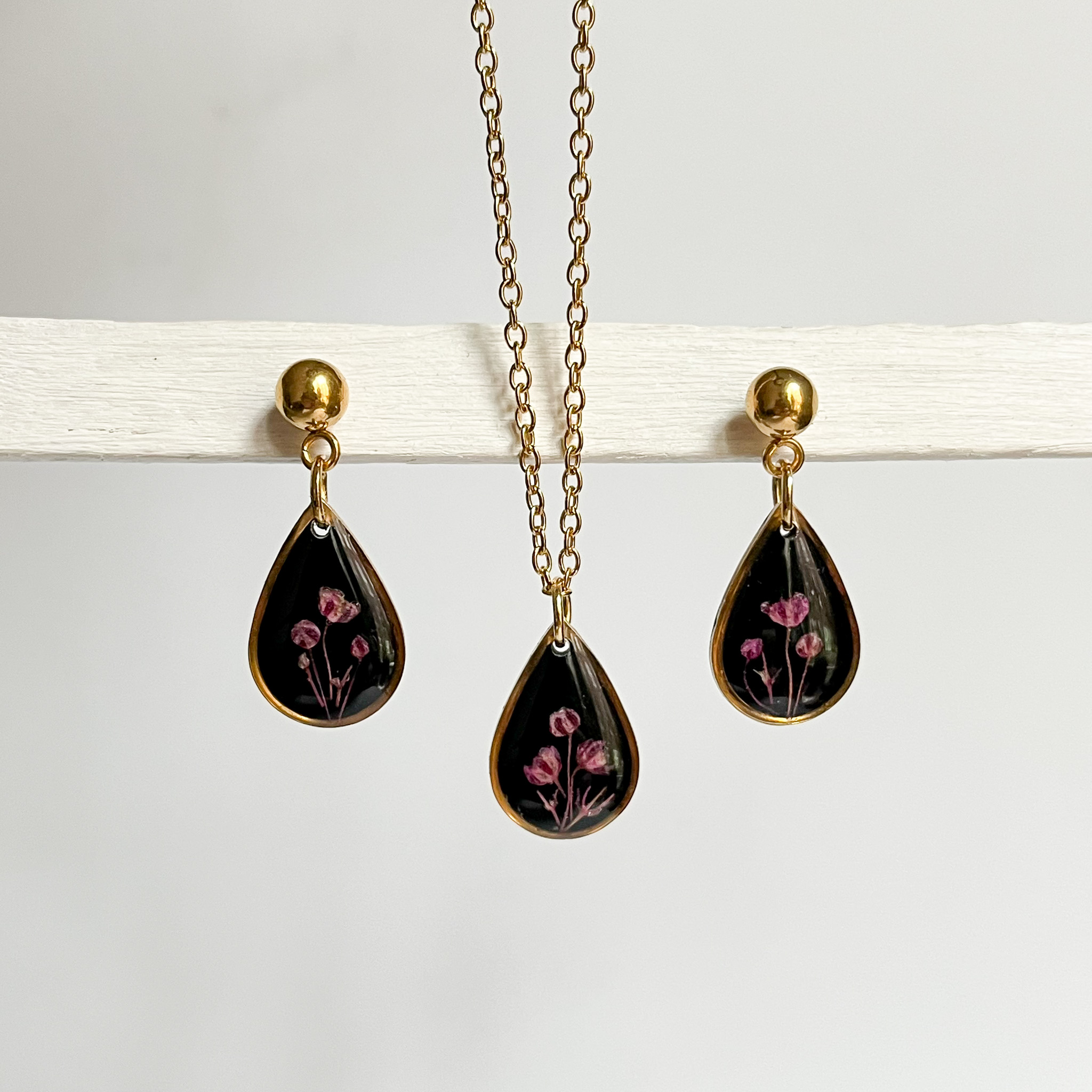 Biżuteria z kolekcji Północnej - kompozycje z jasnych roślin na czarnym tle. Na zdjęciu są dwa naszyjniki, dwie pary kolczyków-planet i pierścionek.