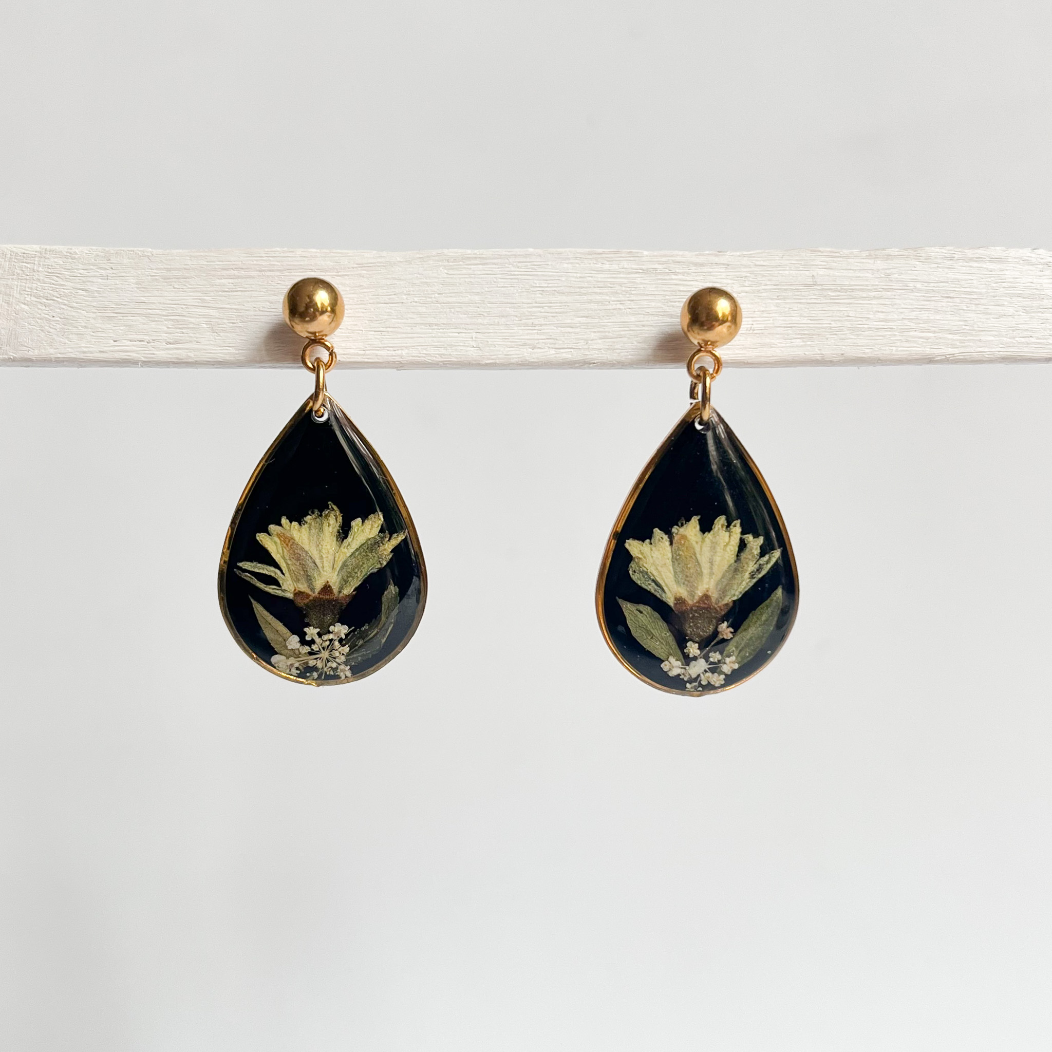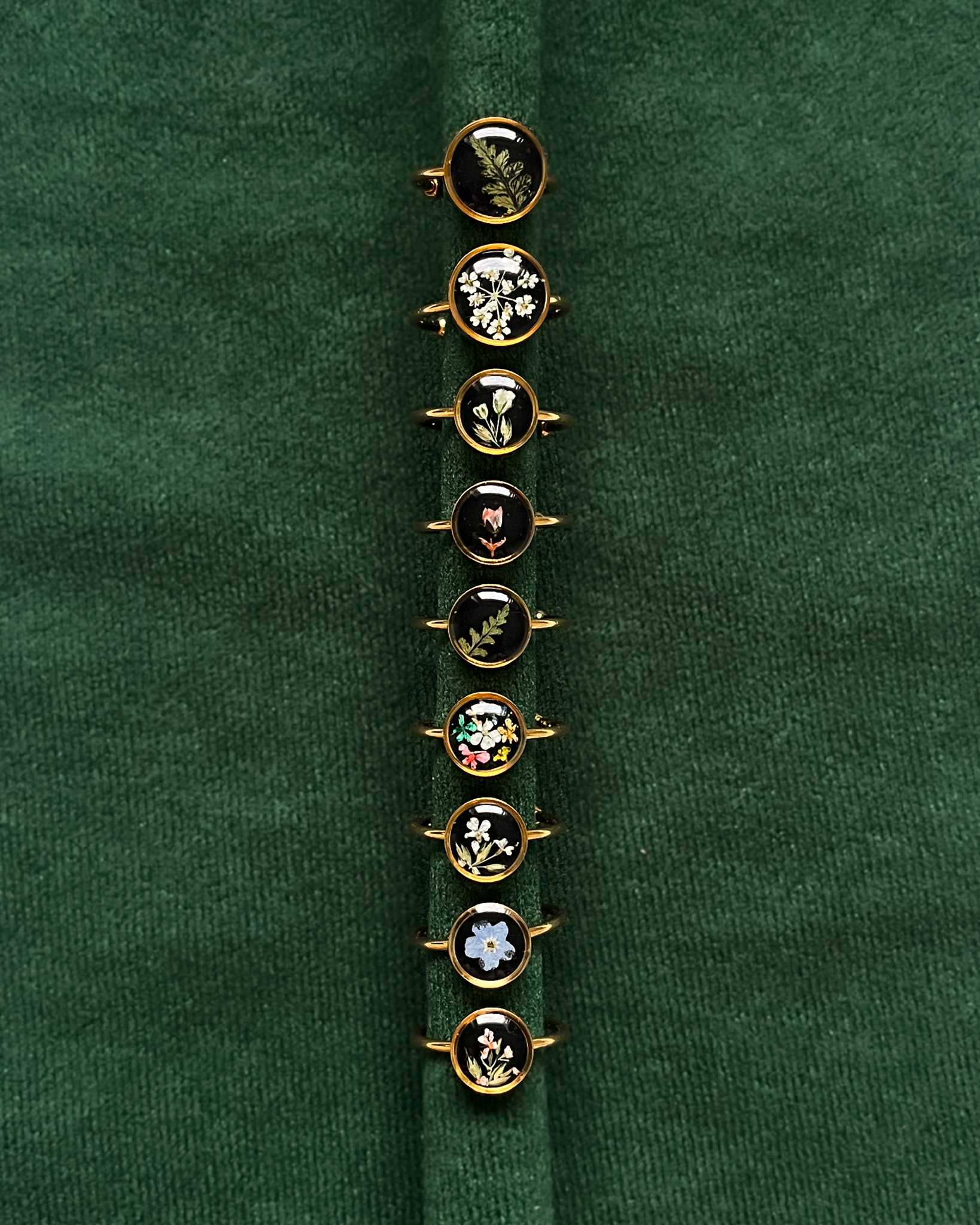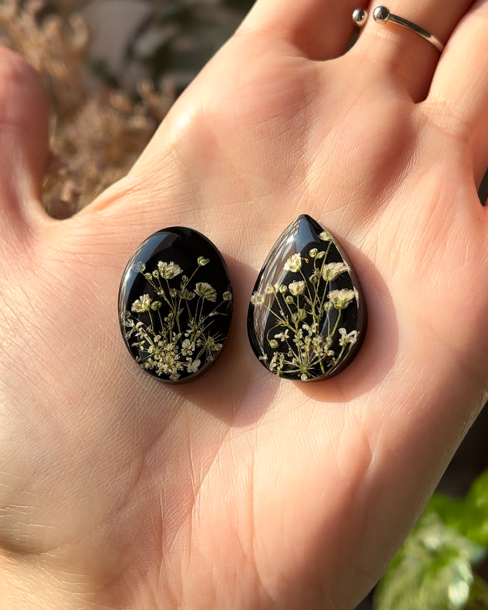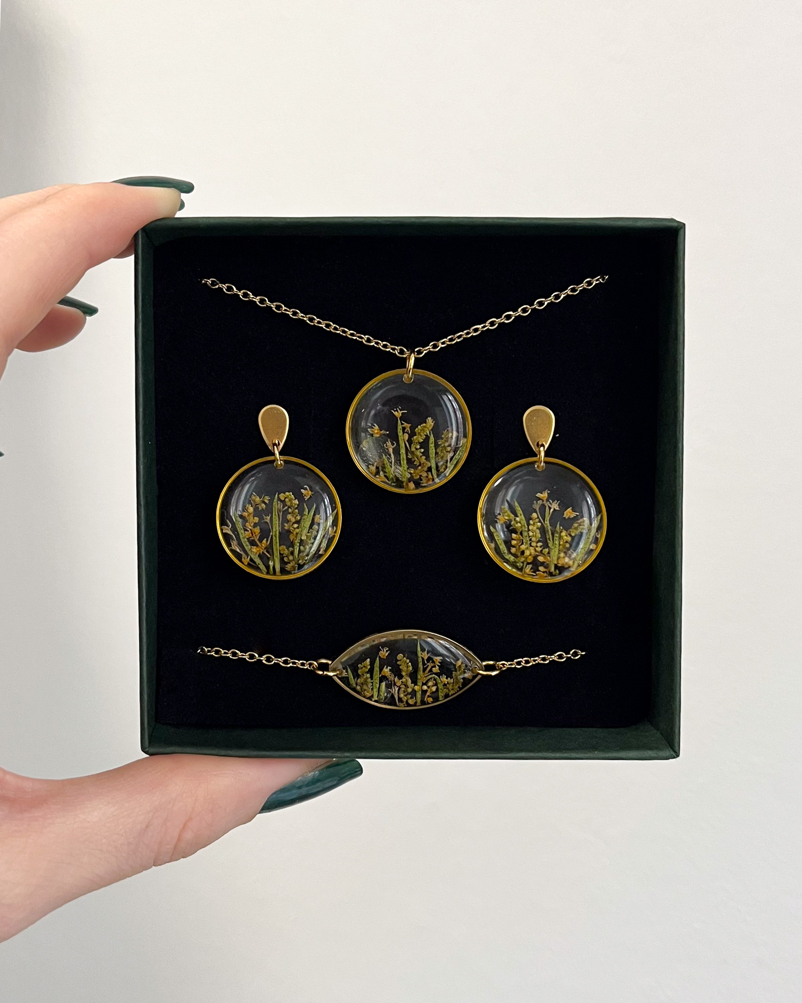 Biżuteria z kolekcji Północnej - kompozycje z jasnych roślin na czarnym tle. Na zdjęciu są dwa naszyjniki, dwie pary kolczyków-planet i pierścionek.