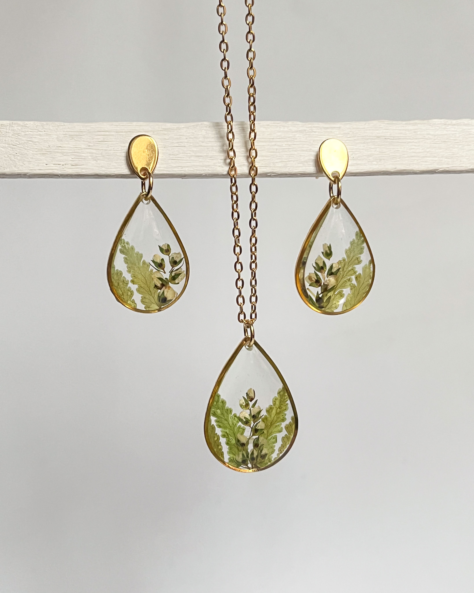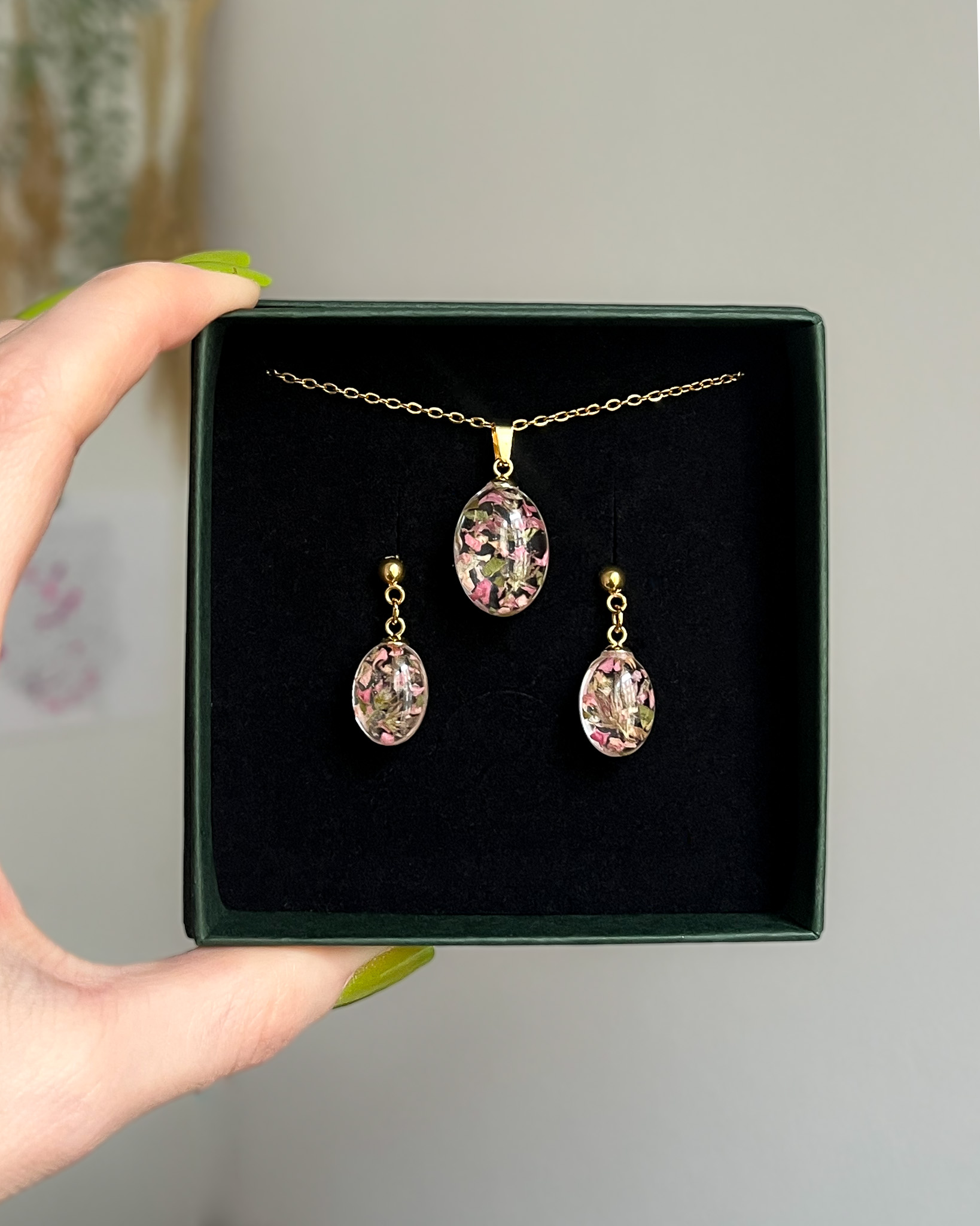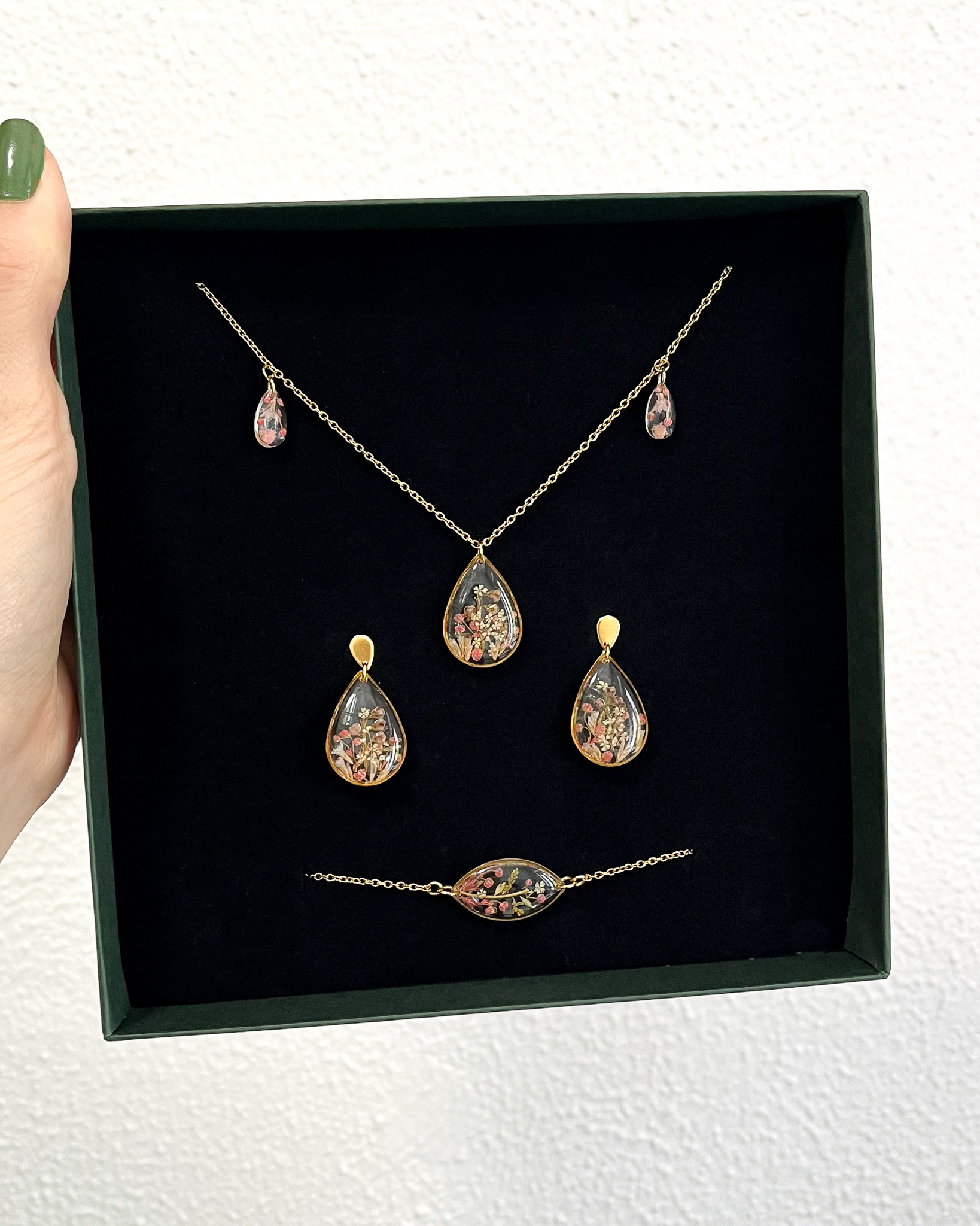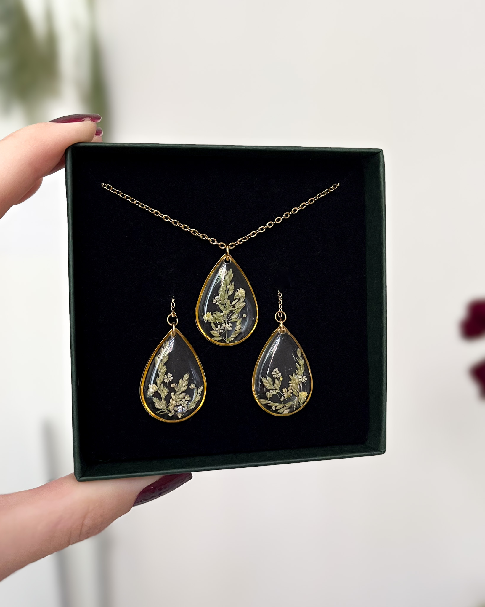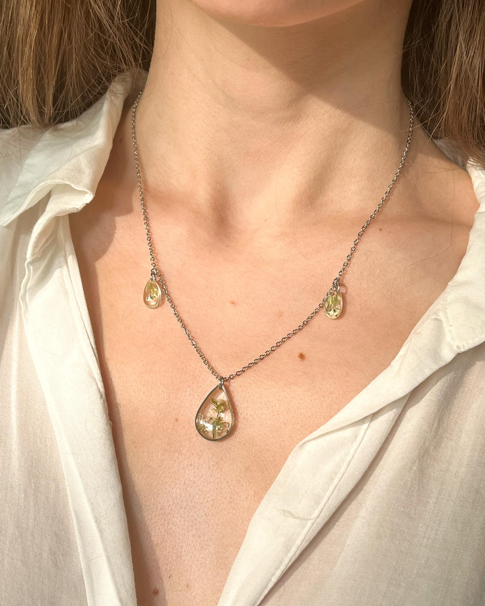 Delikatny naszyjnik z trzema łezkami i zielonymi roślinami w środku
