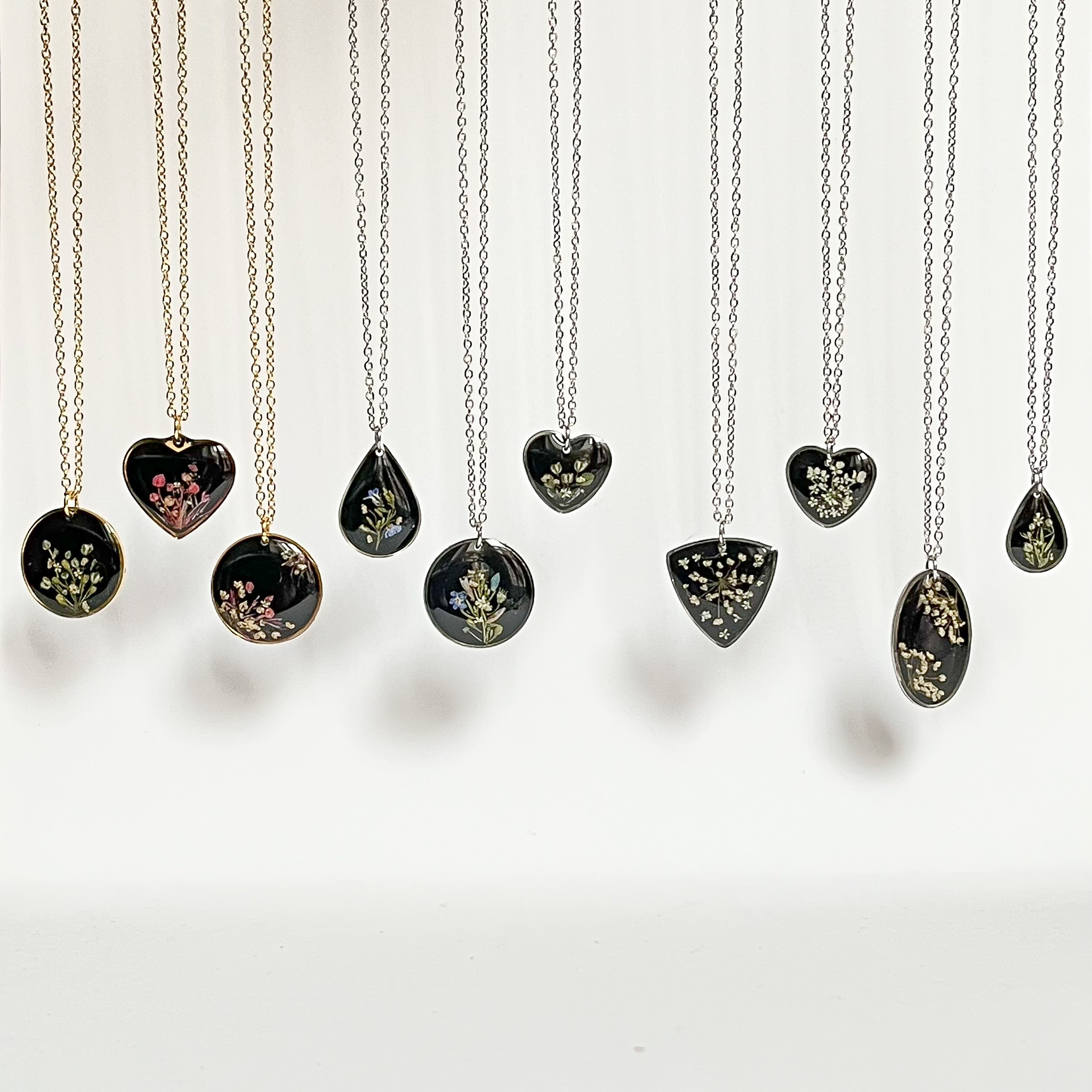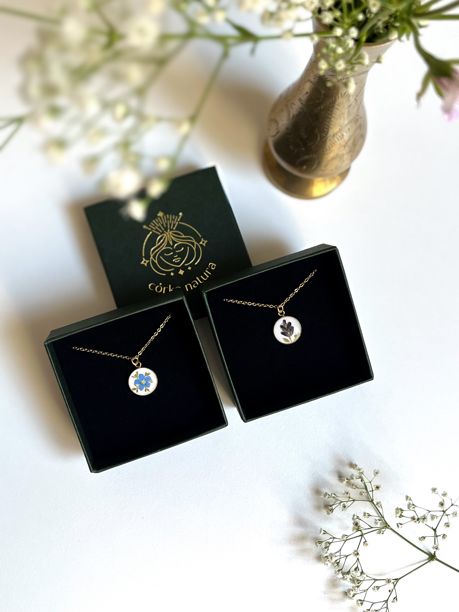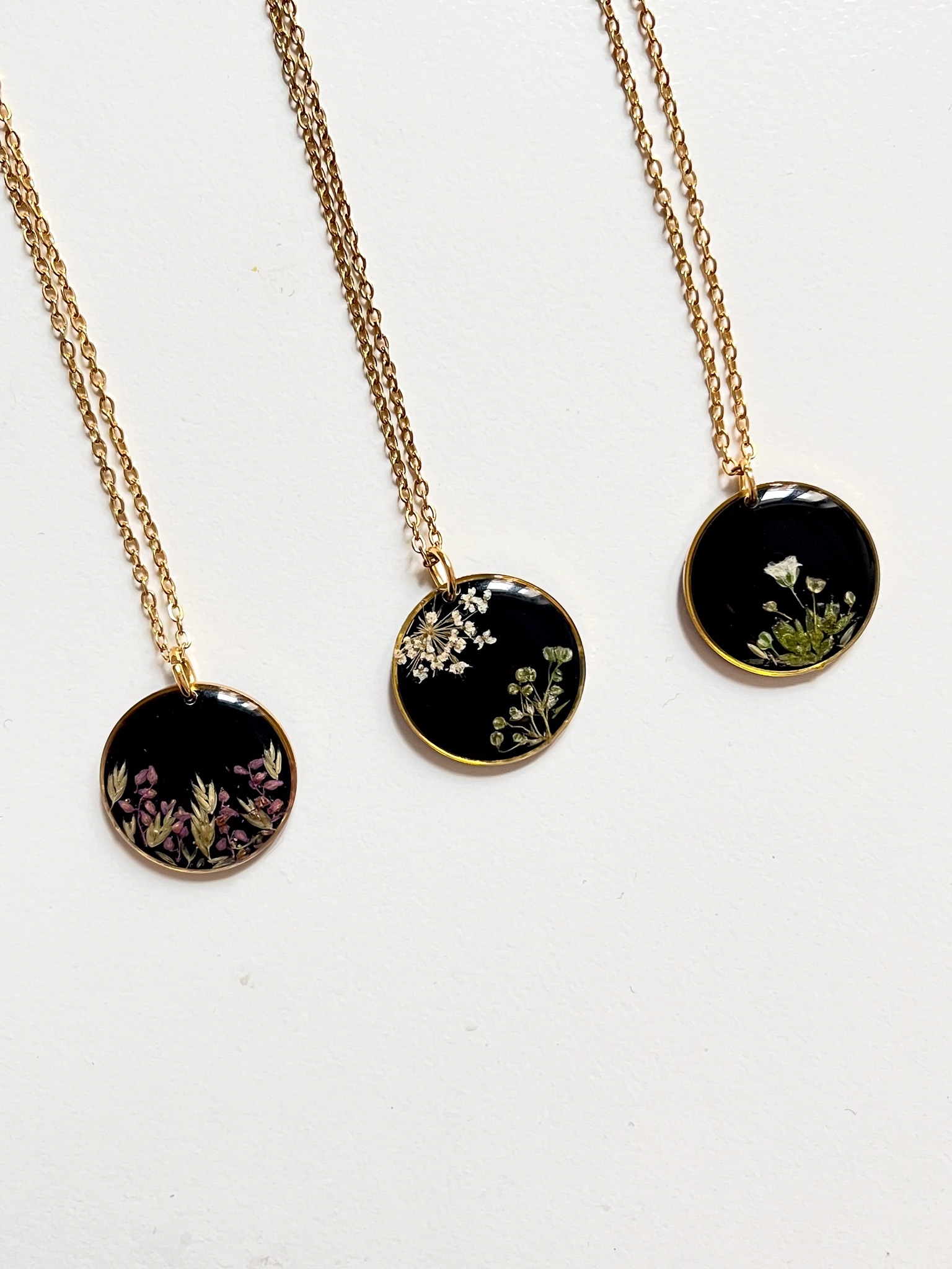 Dwa czarne naszyjniki bez ramek z jasnymi kwiatami gipsówki i dzikiej marchwi