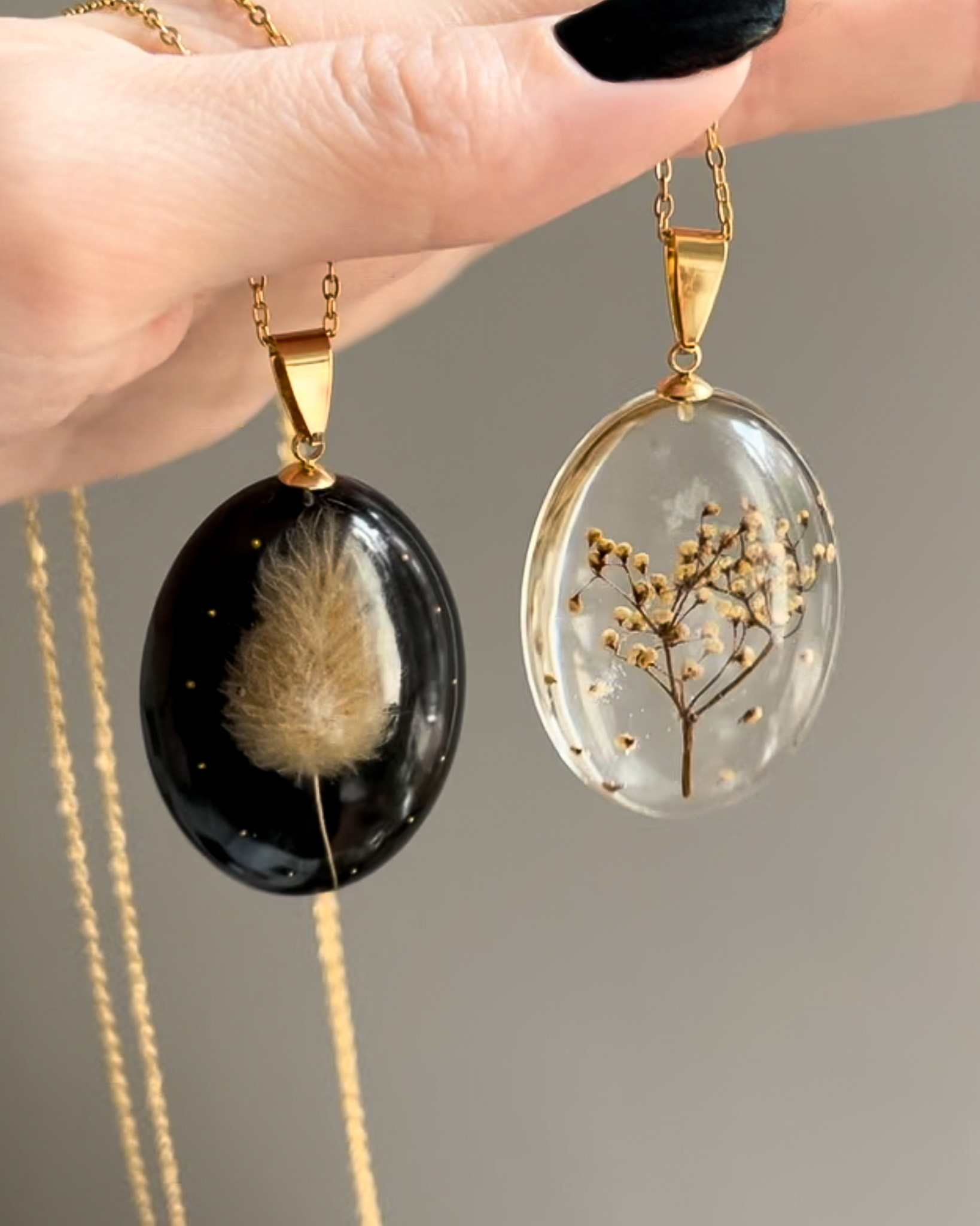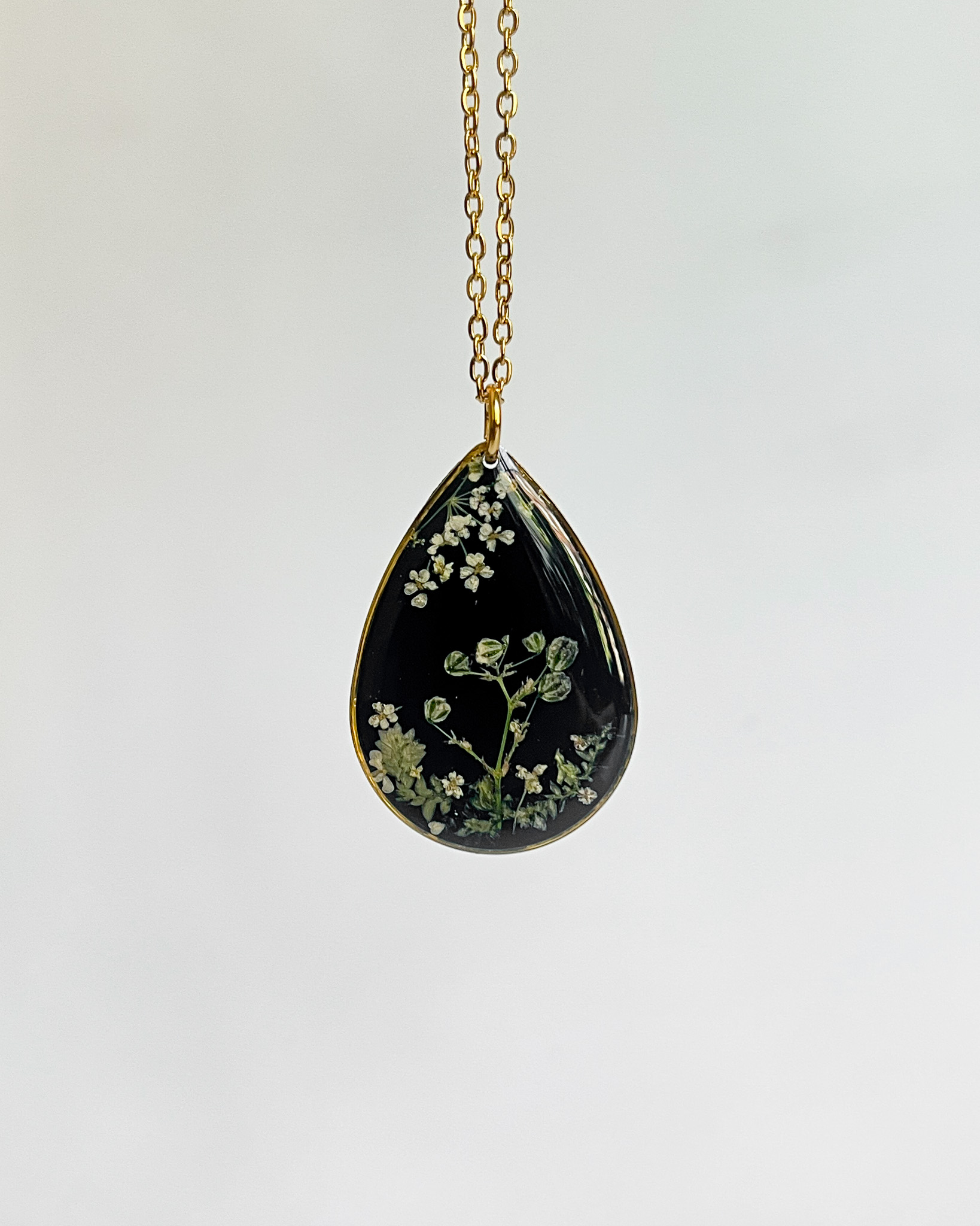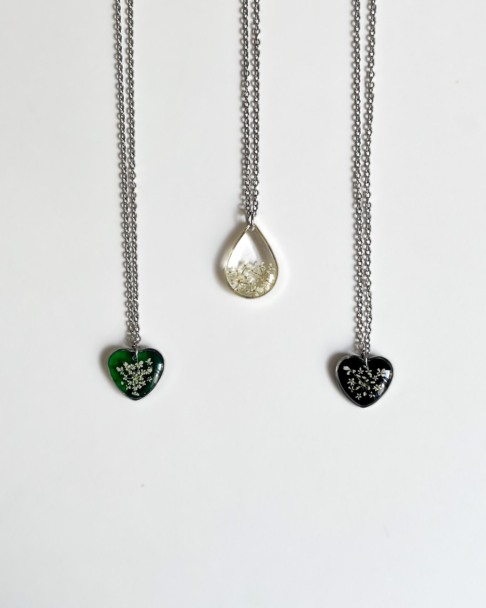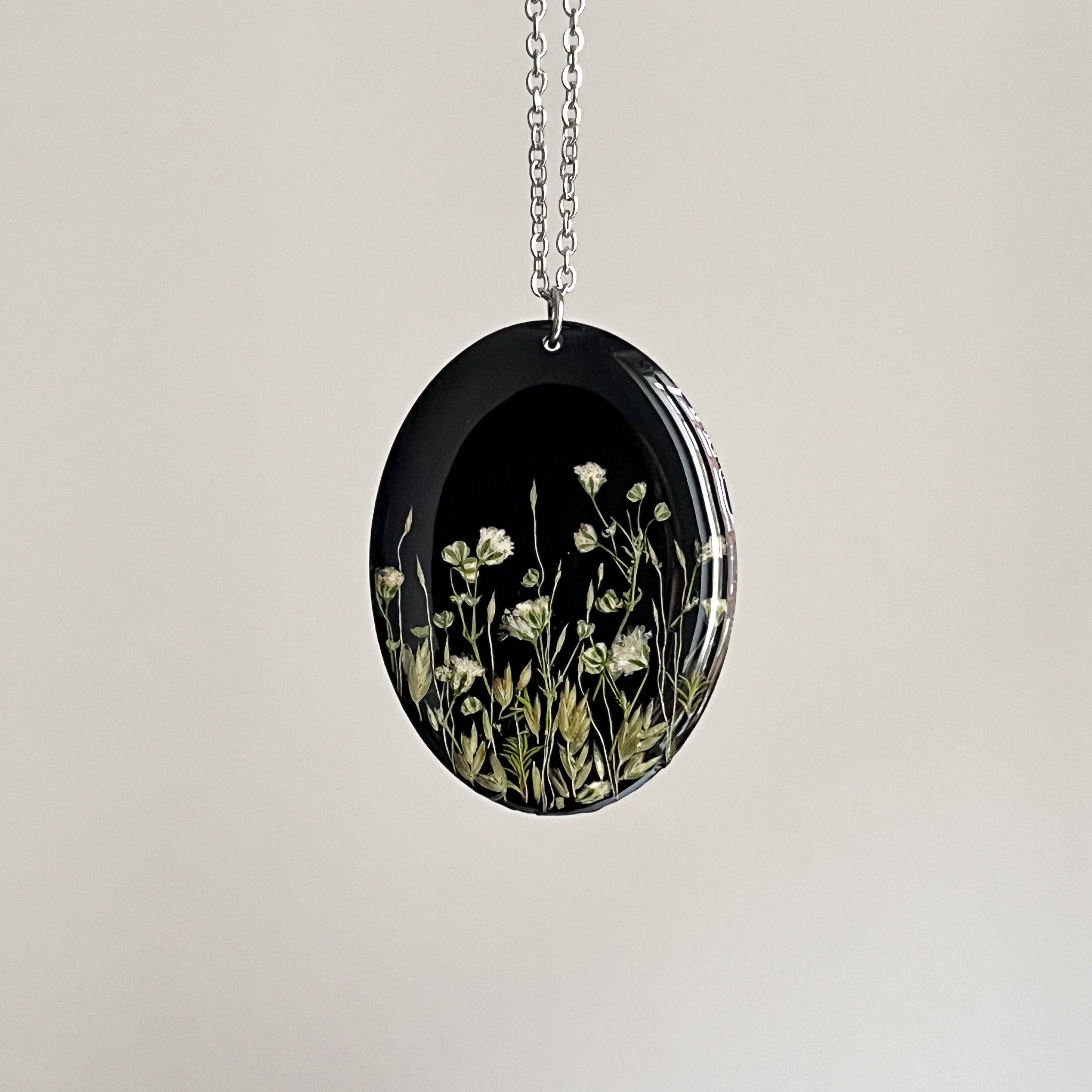 Dwa czarne naszyjniki bez ramek z jasnymi kwiatami gipsówki i dzikiej marchwi