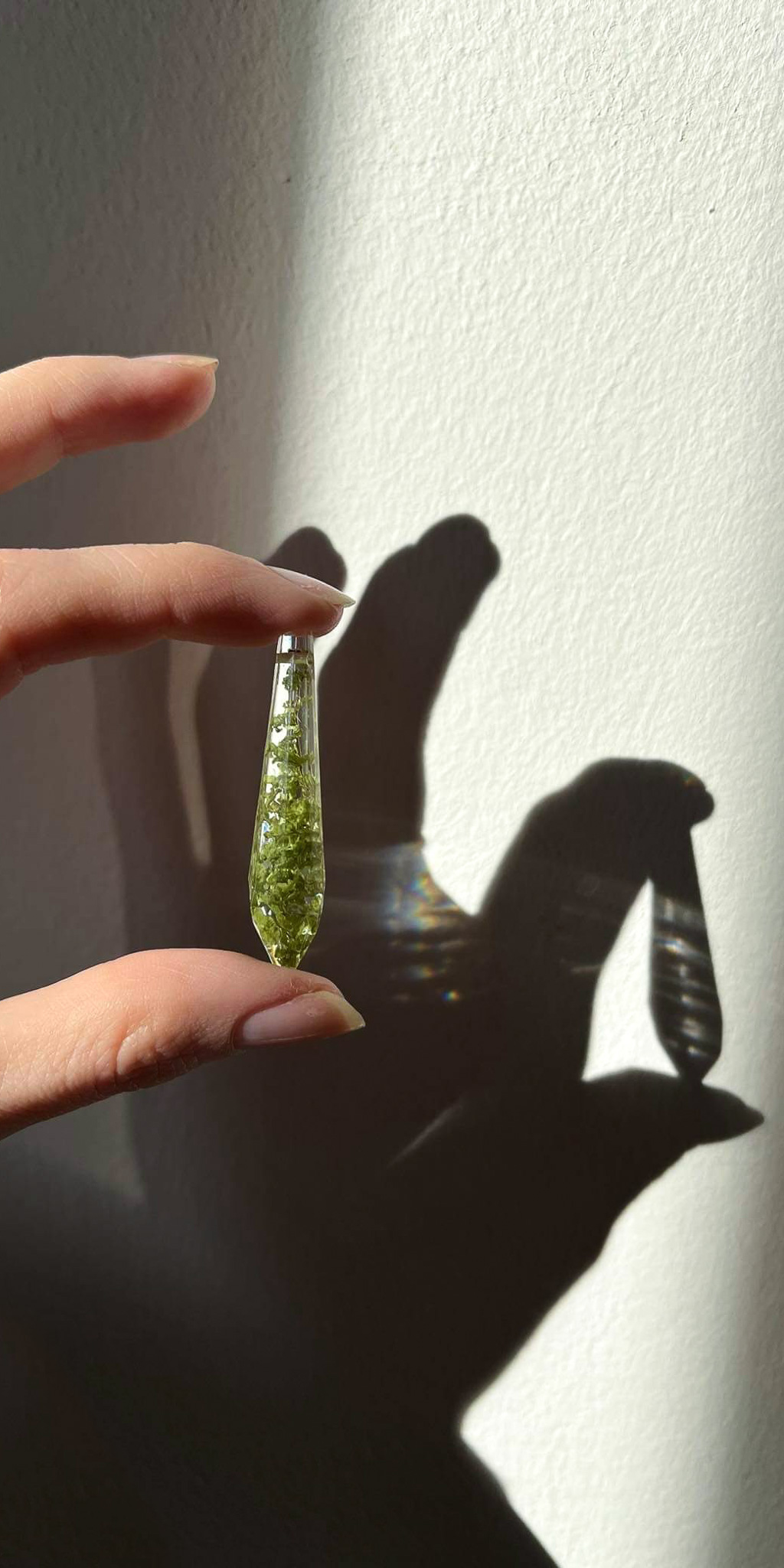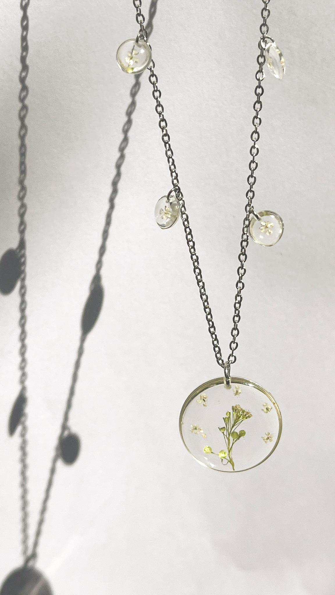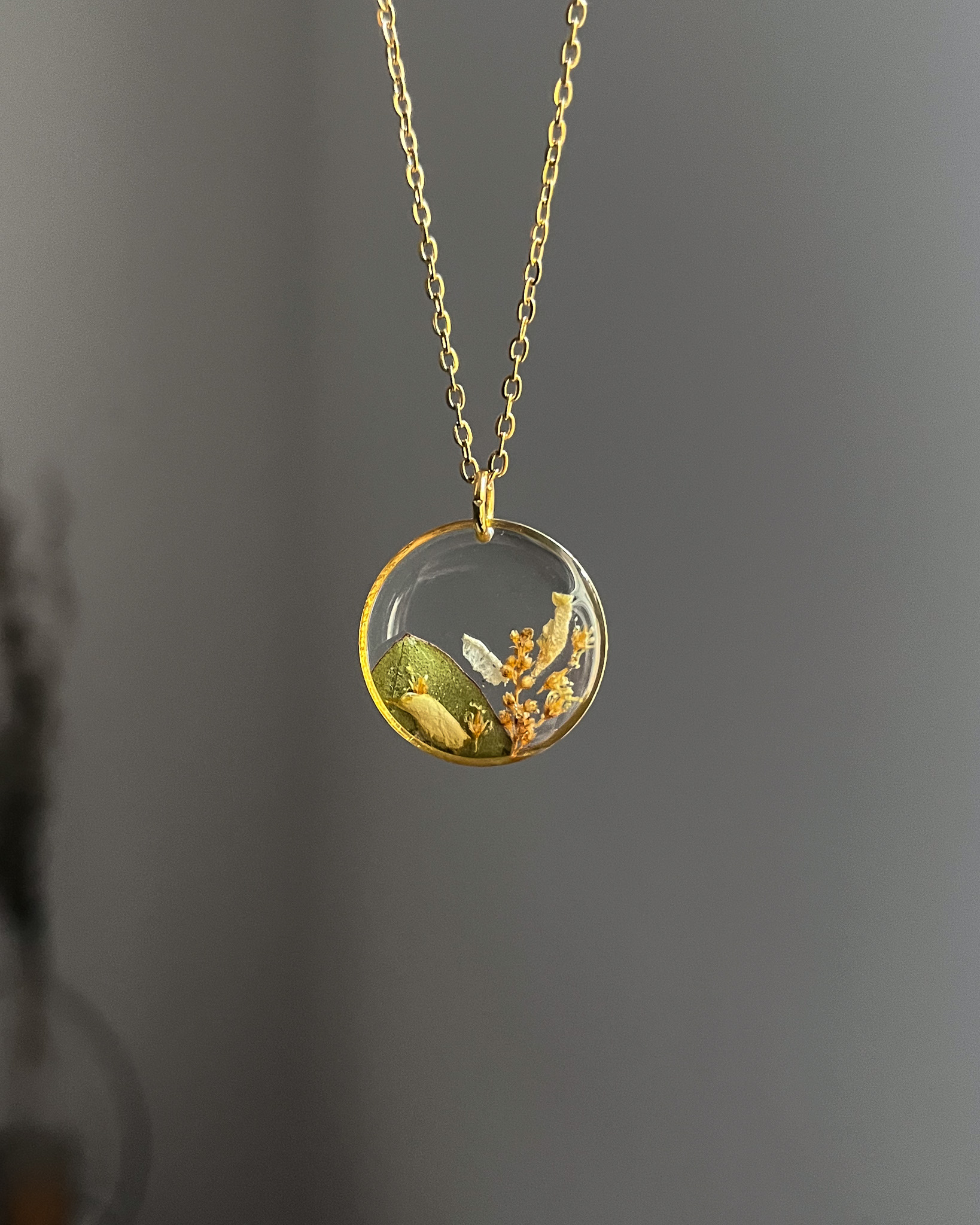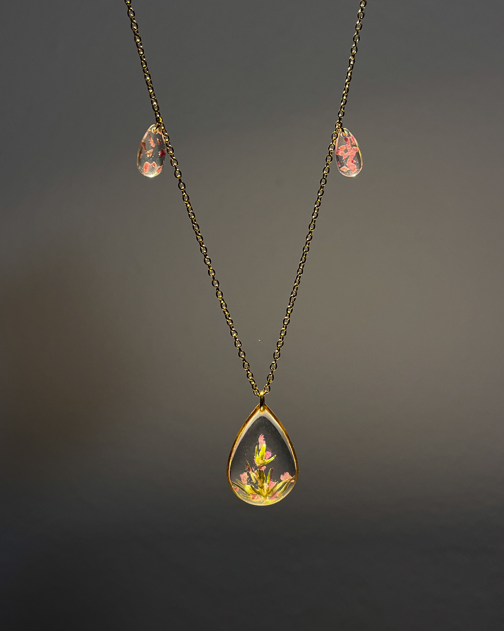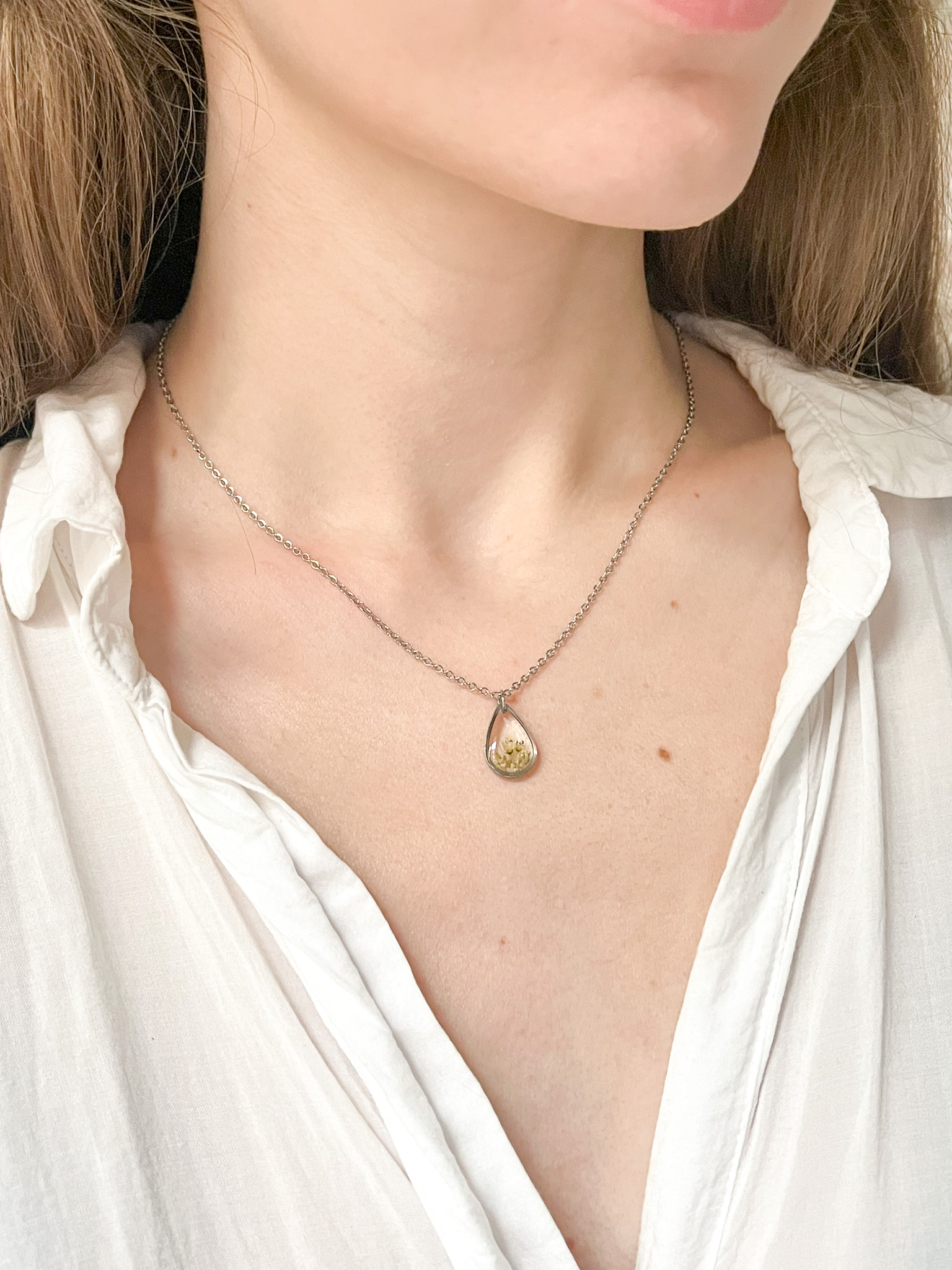 Drobna, przezroczysta kropla z zielono-żółtymi roślinami, na długim łańcuszku