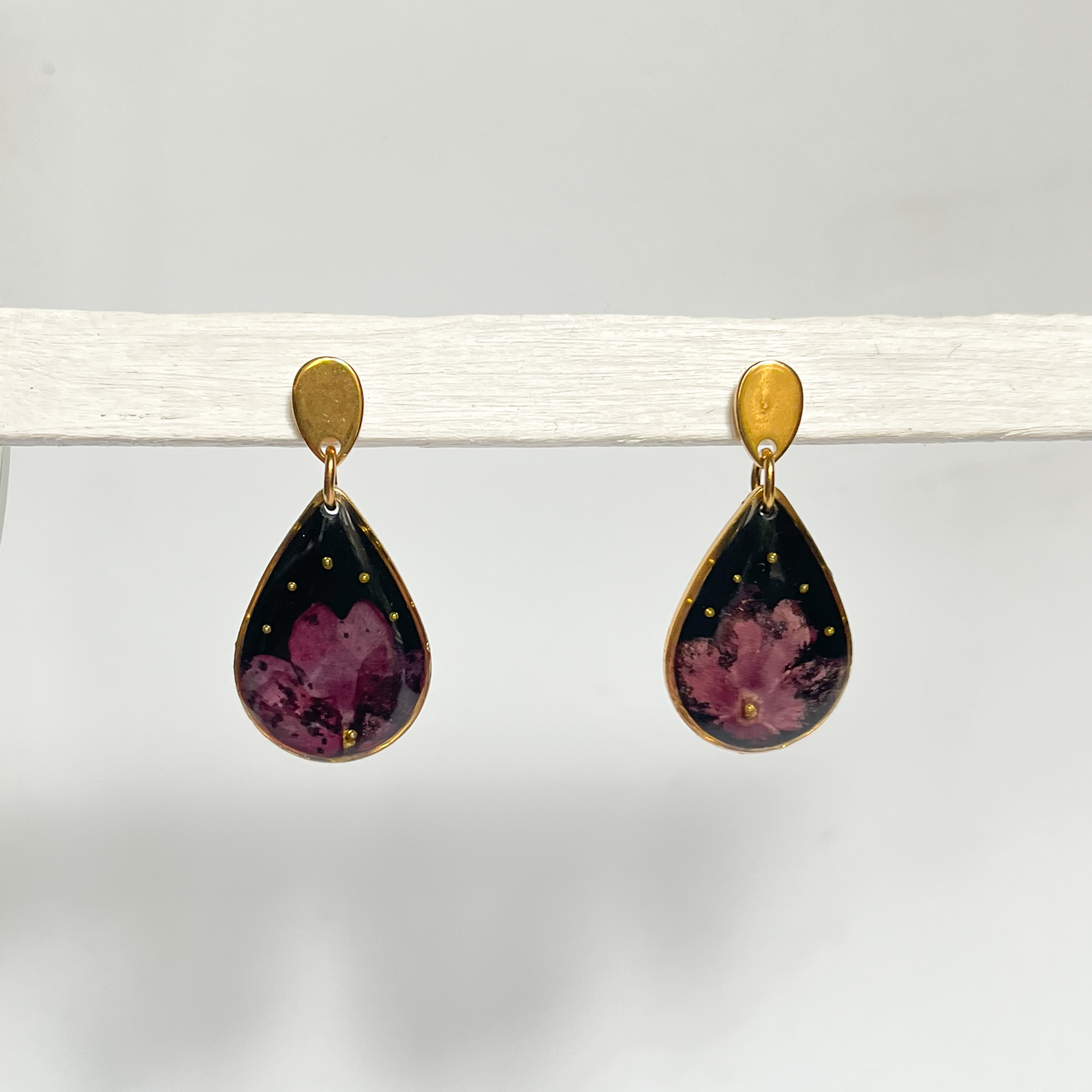 Para wiszących kolczyków z delikatnymi, fioletowymi kwiatami i złotymi koralikami na czarnym tle