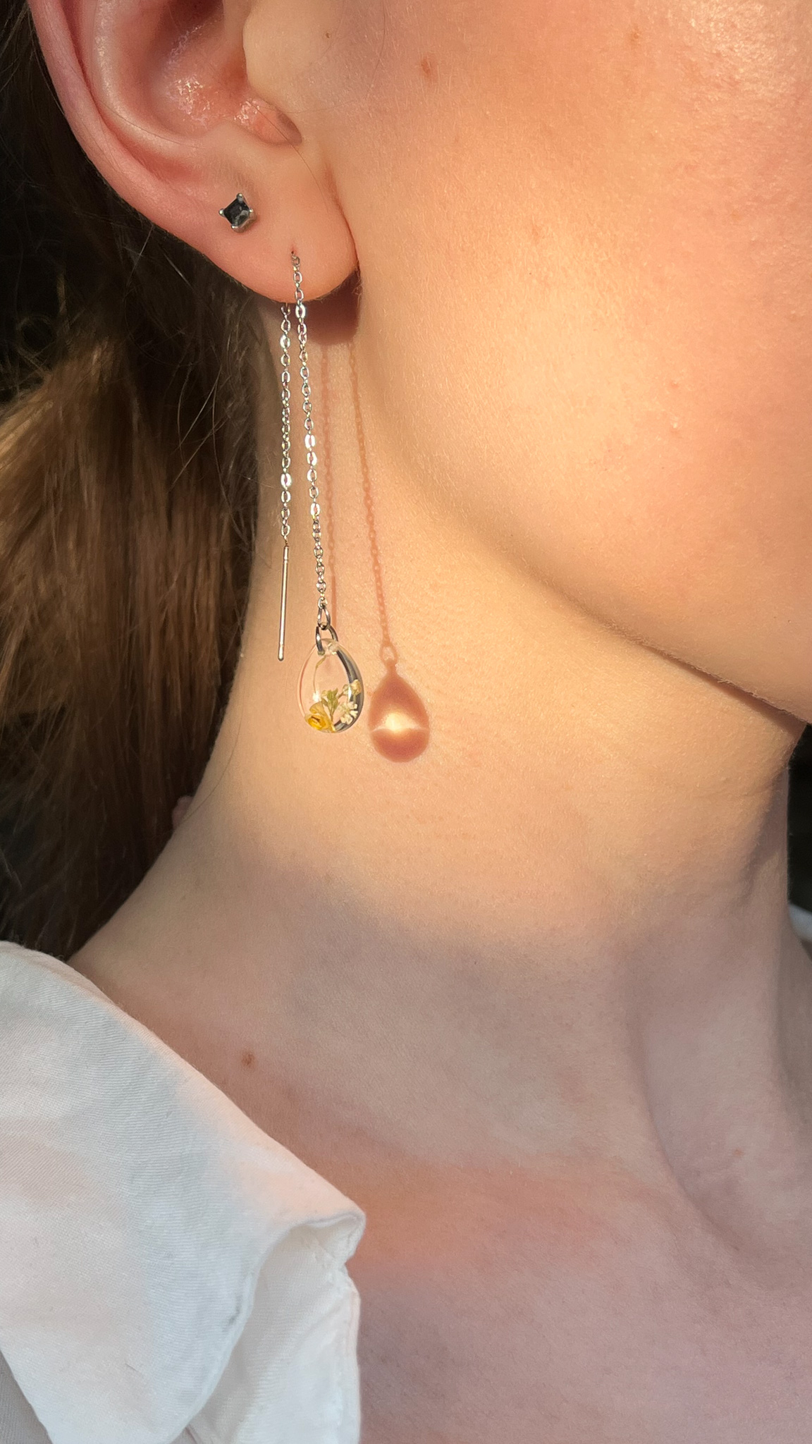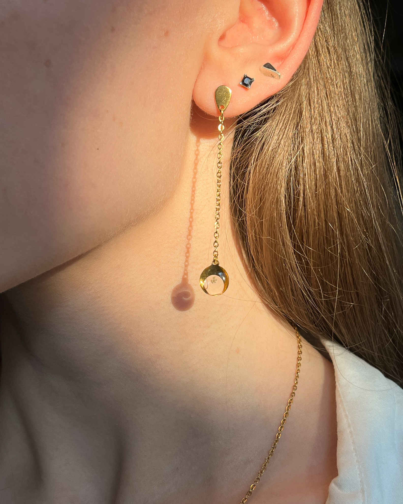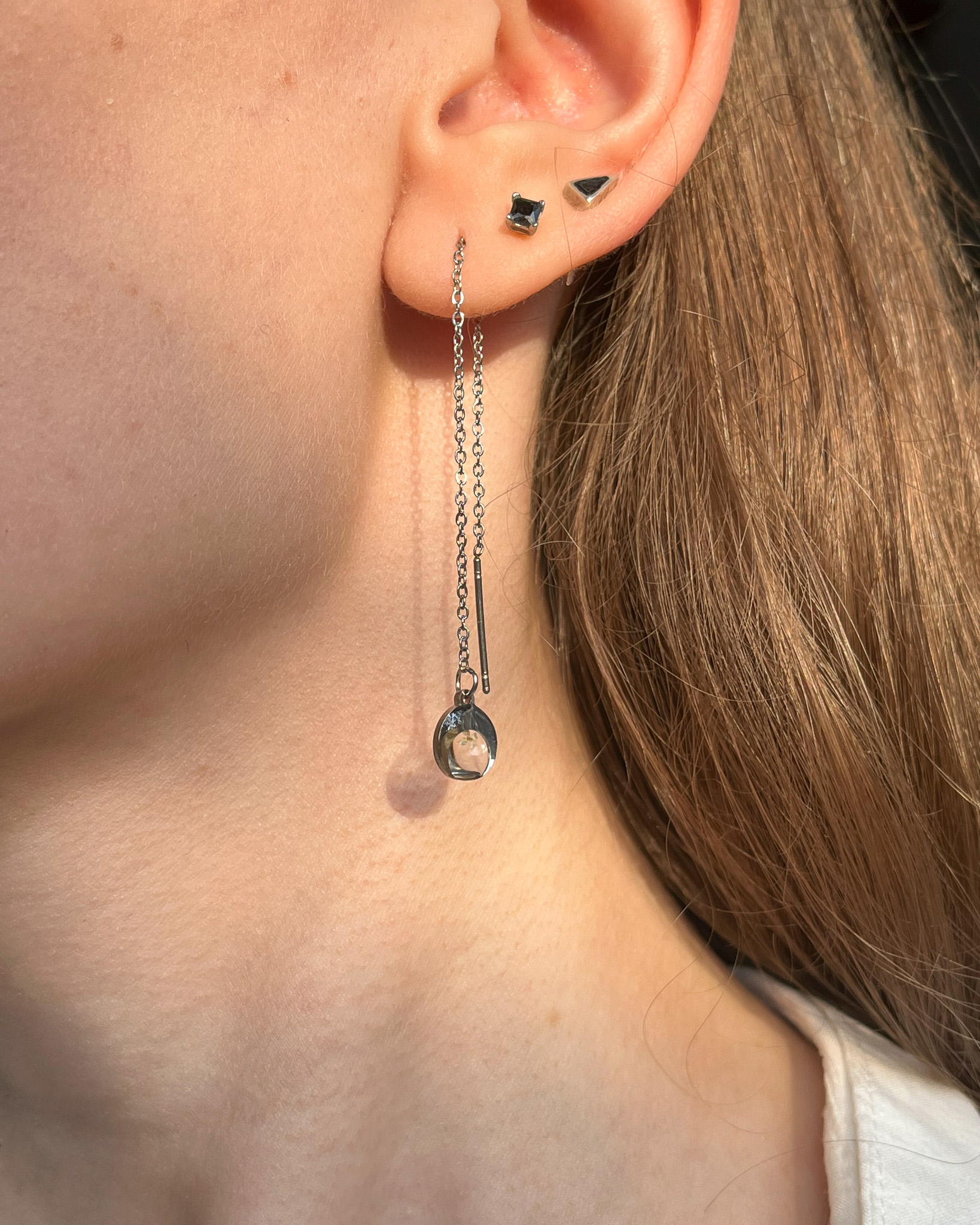 Delikatny, jasny kolczyk na długim, cienkim łańcuszku, który można przełożyć przez dziurkę lub kilka 🙂