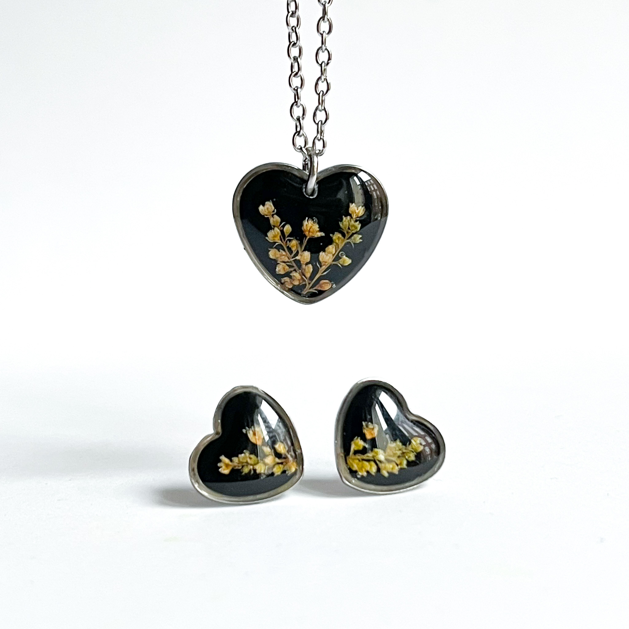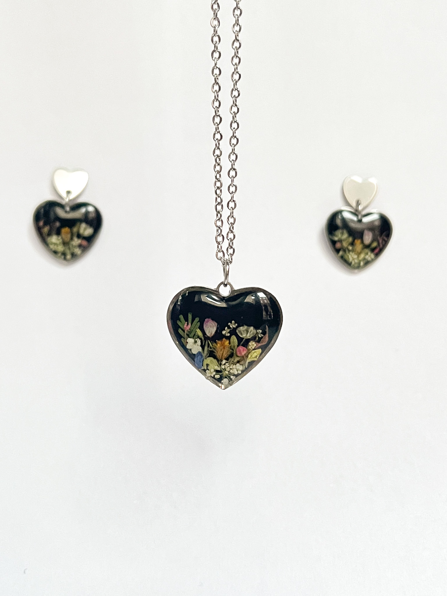 Zestaw naszyjnika i kolczyków w kształcie serc, z bogatymi bukietami na czarnym tle. Wykonany specjalnie na licytację WOŚP <3