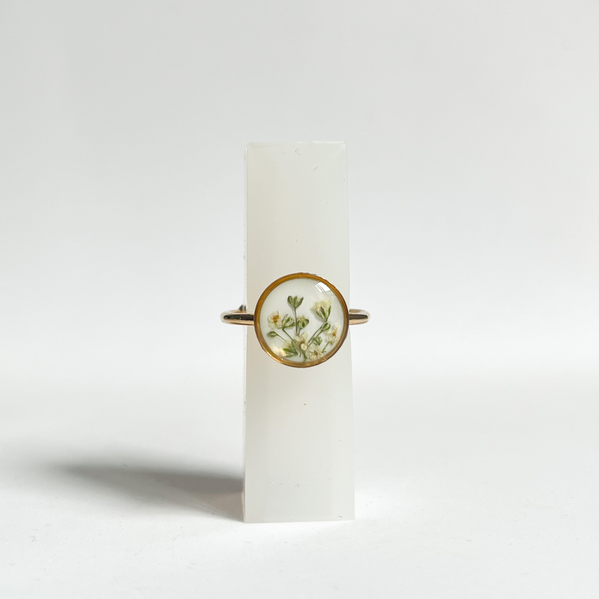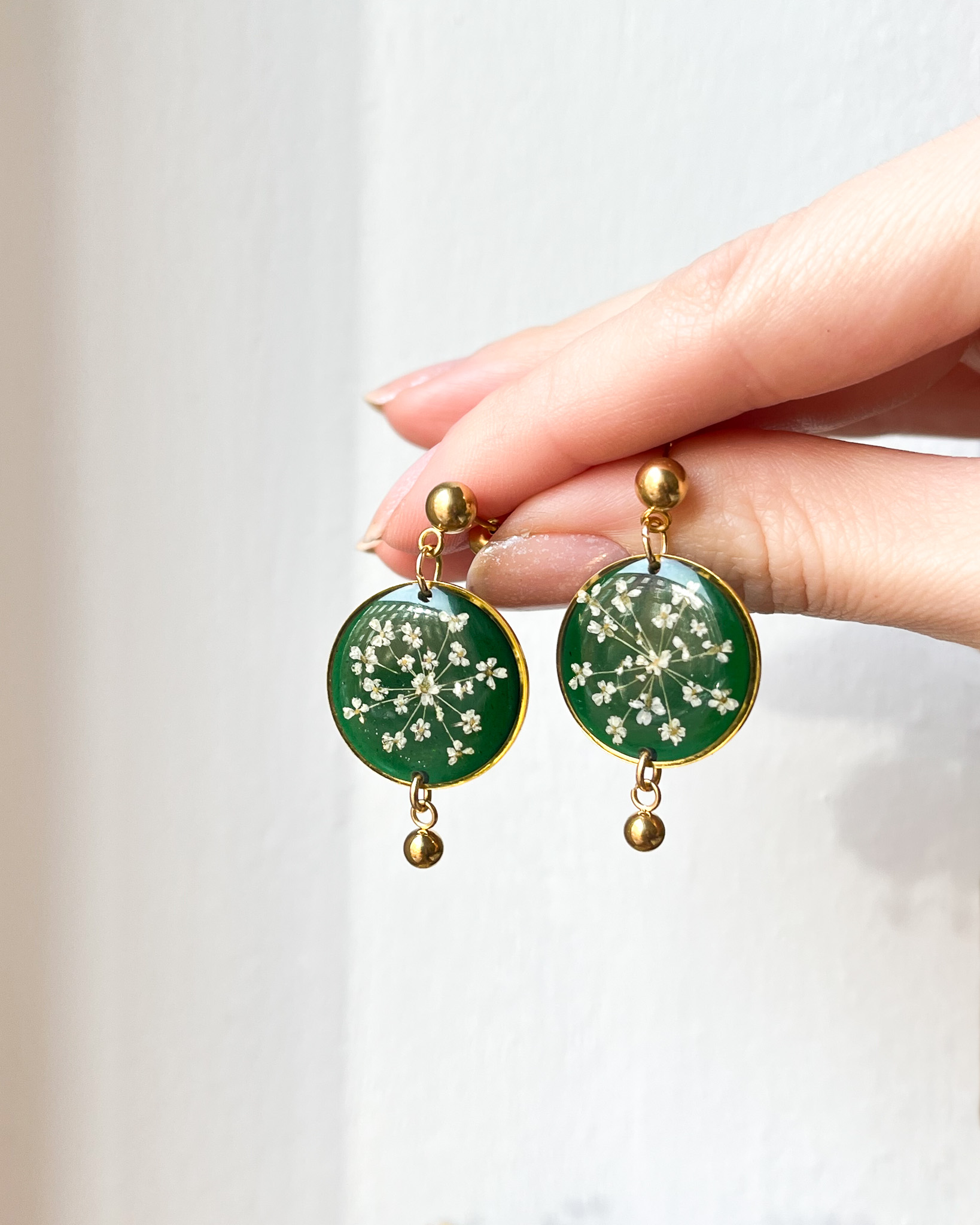 Koronkowe kwiaty dzikiej marchwi na zielonym, półprzezroczystym tłem, wykończone prostą, złotą kuleczką