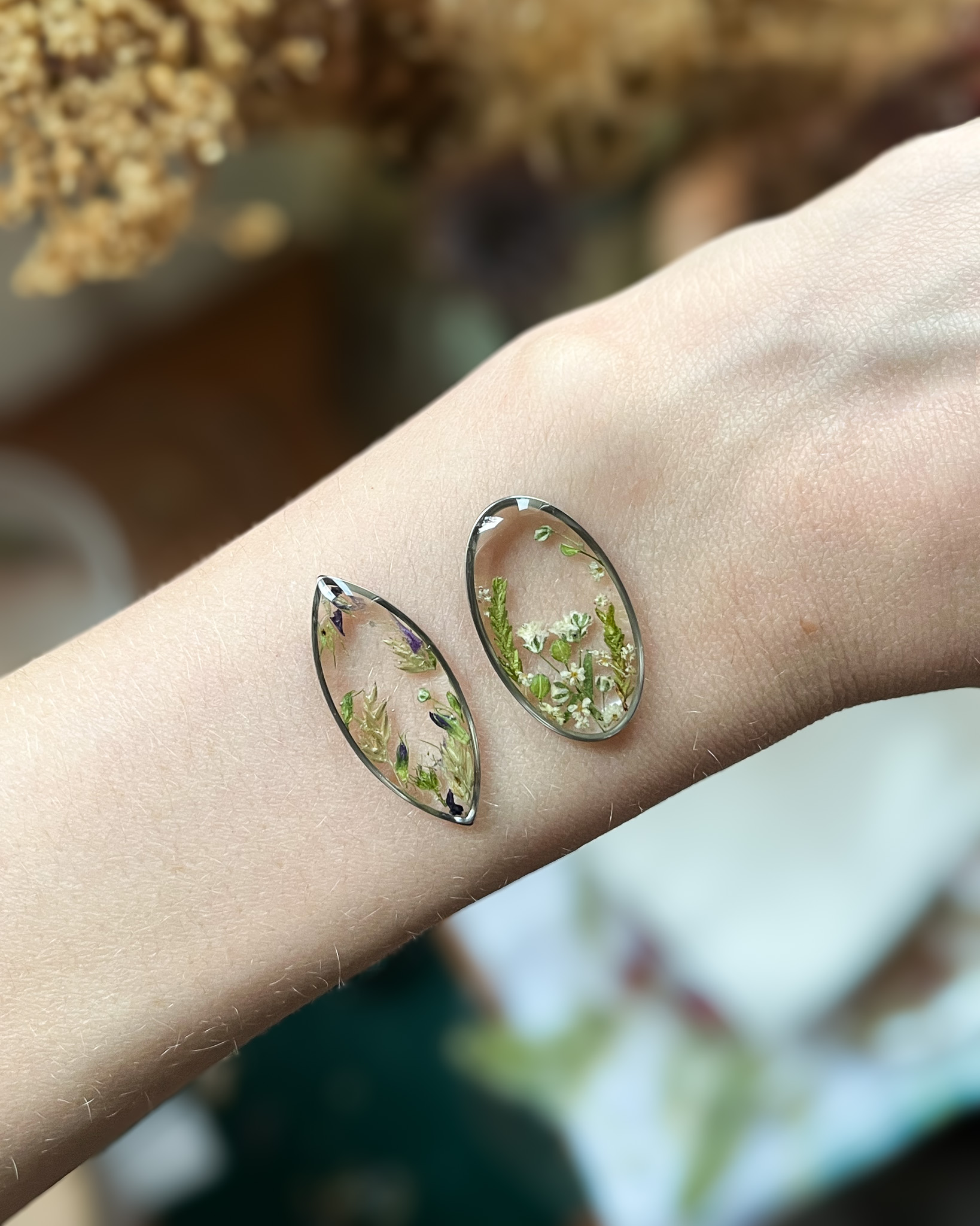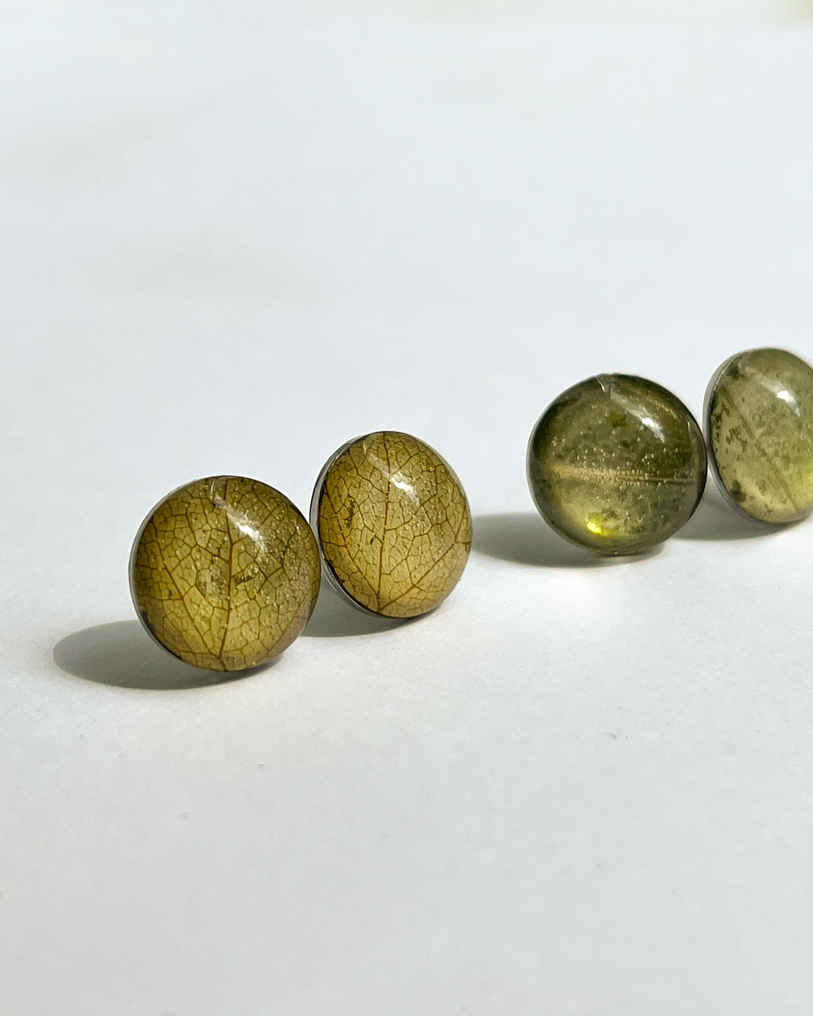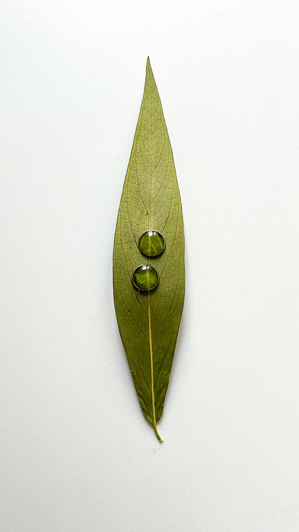 Para sztyftów wypełnionych fragmentami prawdziwego liścia. Przepiękny, żywy kolor i widoczne żyłki