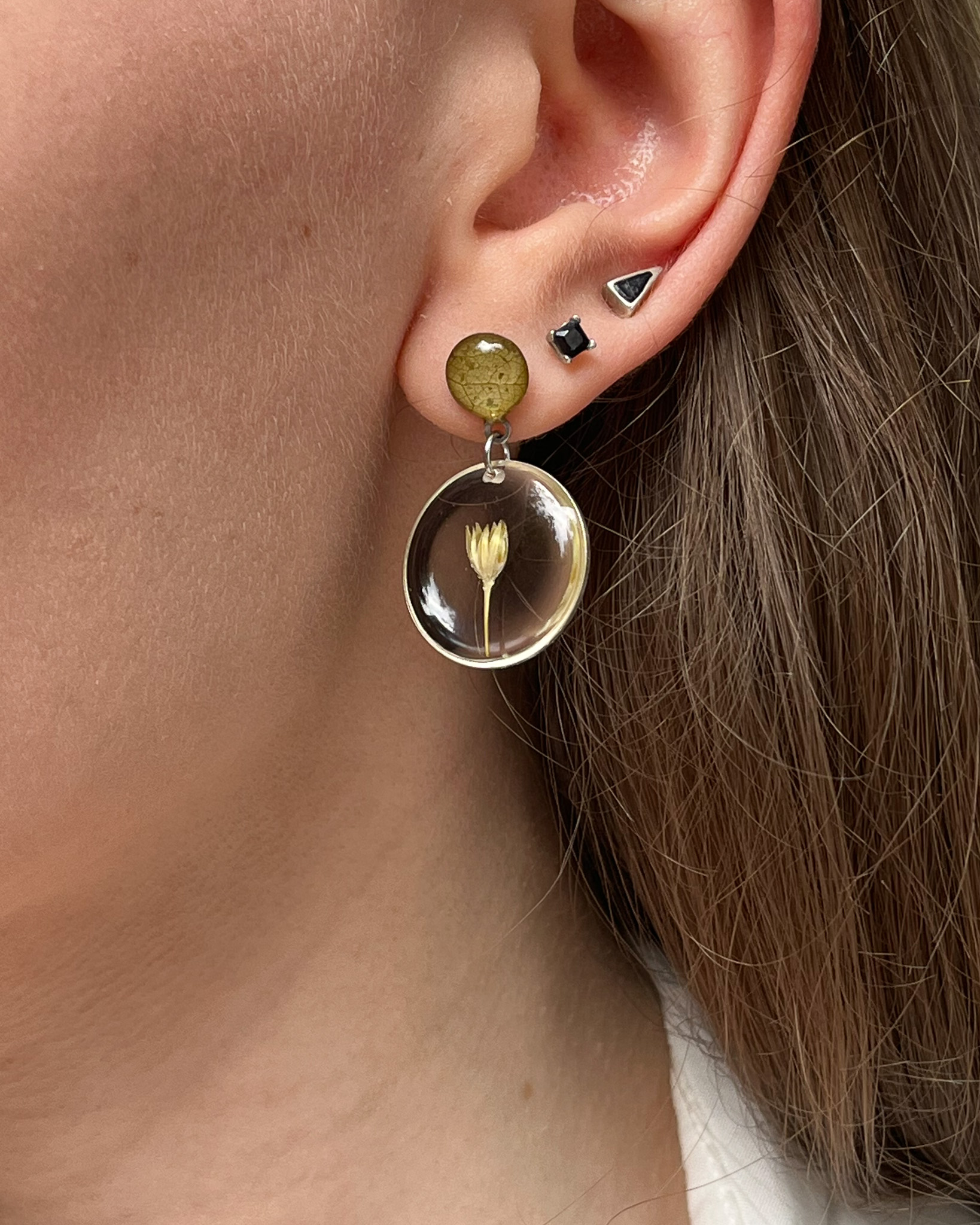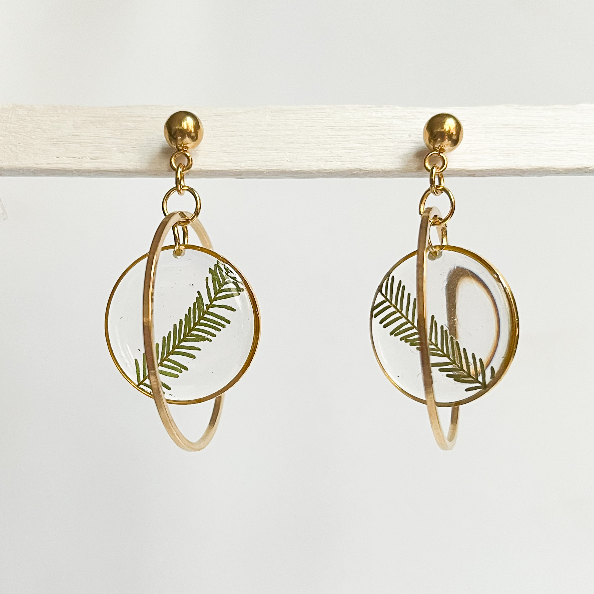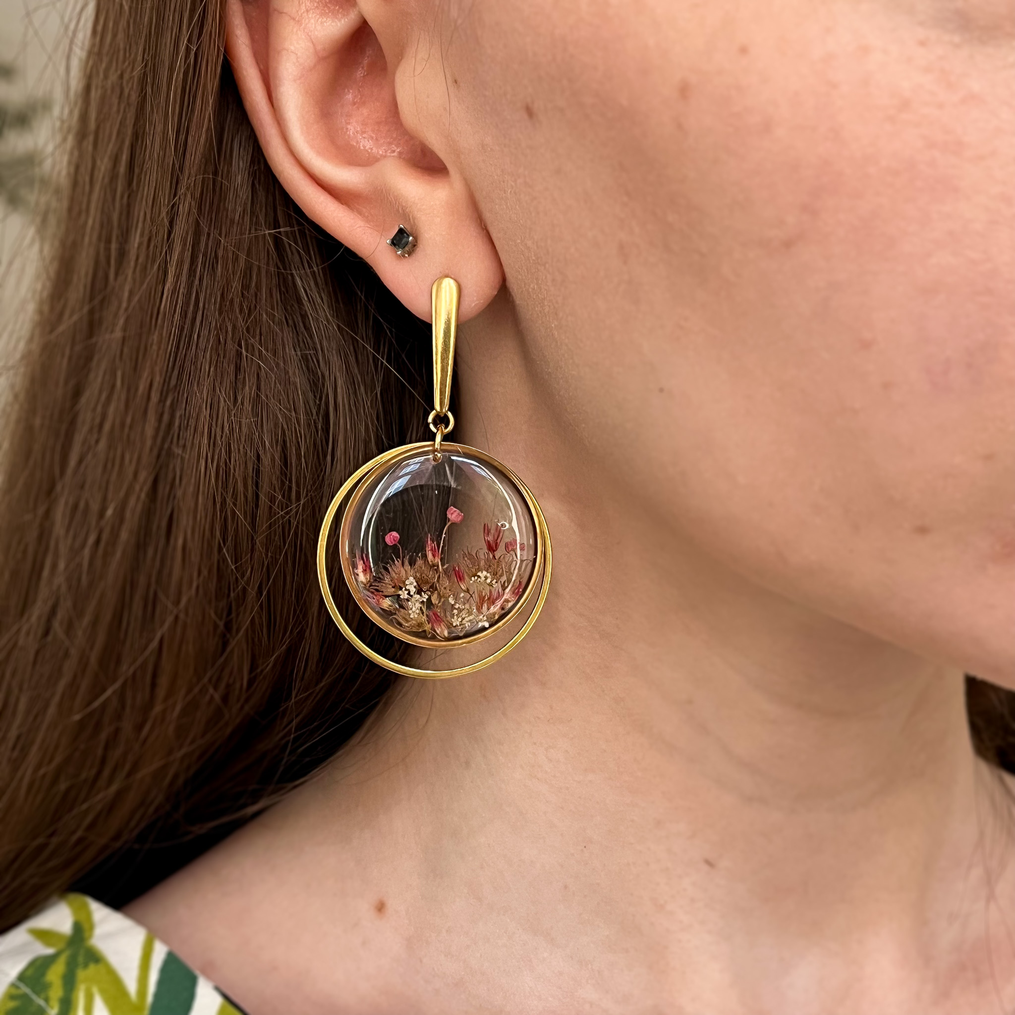 Kolczyki-planety, których dodatkowa obręcz delikatnie kręci się wokół zawieszki z zielonymi roślinami, przywołując skojarzenie z Saturnem