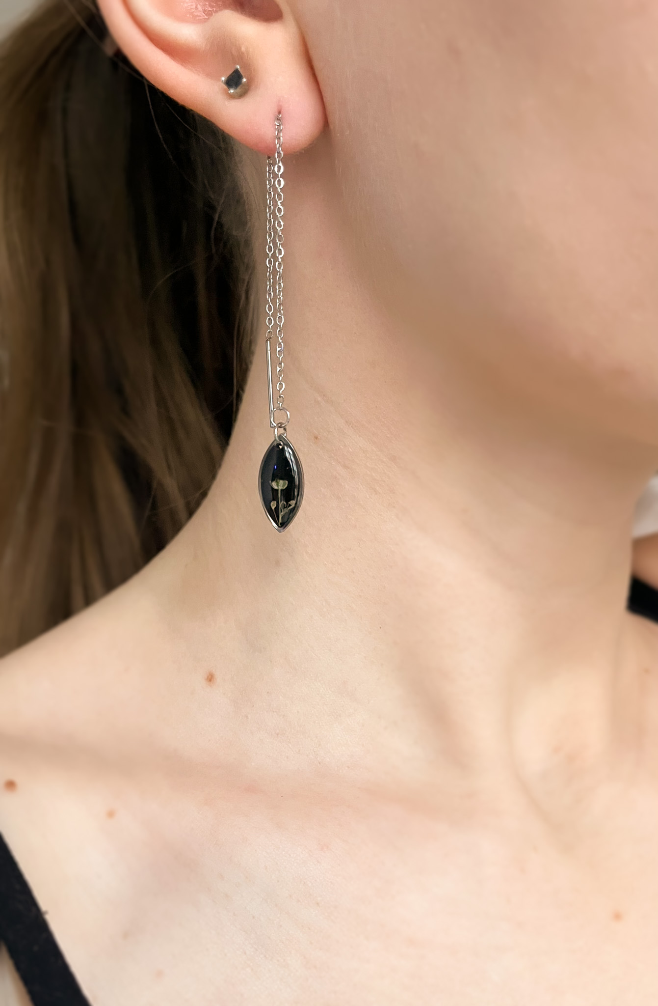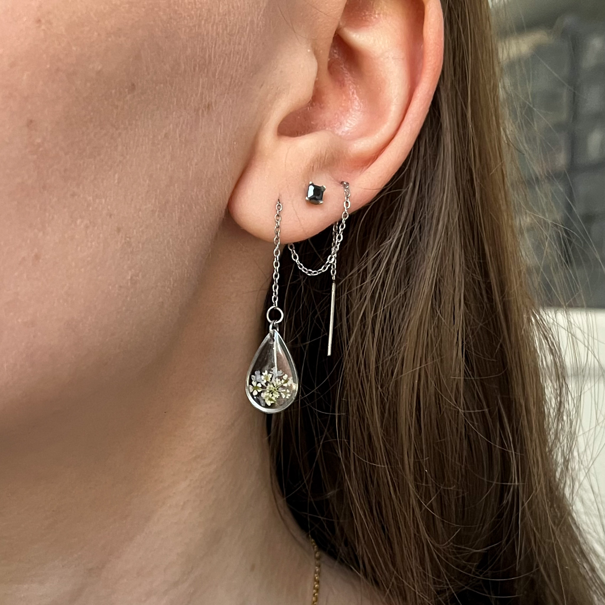 Bardzo delikatny kolczyk ze srebrnym księżycem i pojedynczym kwiatkiem dzikiej marchwi. Zawieszka na długim, cienkim łańcuszku, który można przełożyć przez dziurkę i regulować wysokość zawieszki