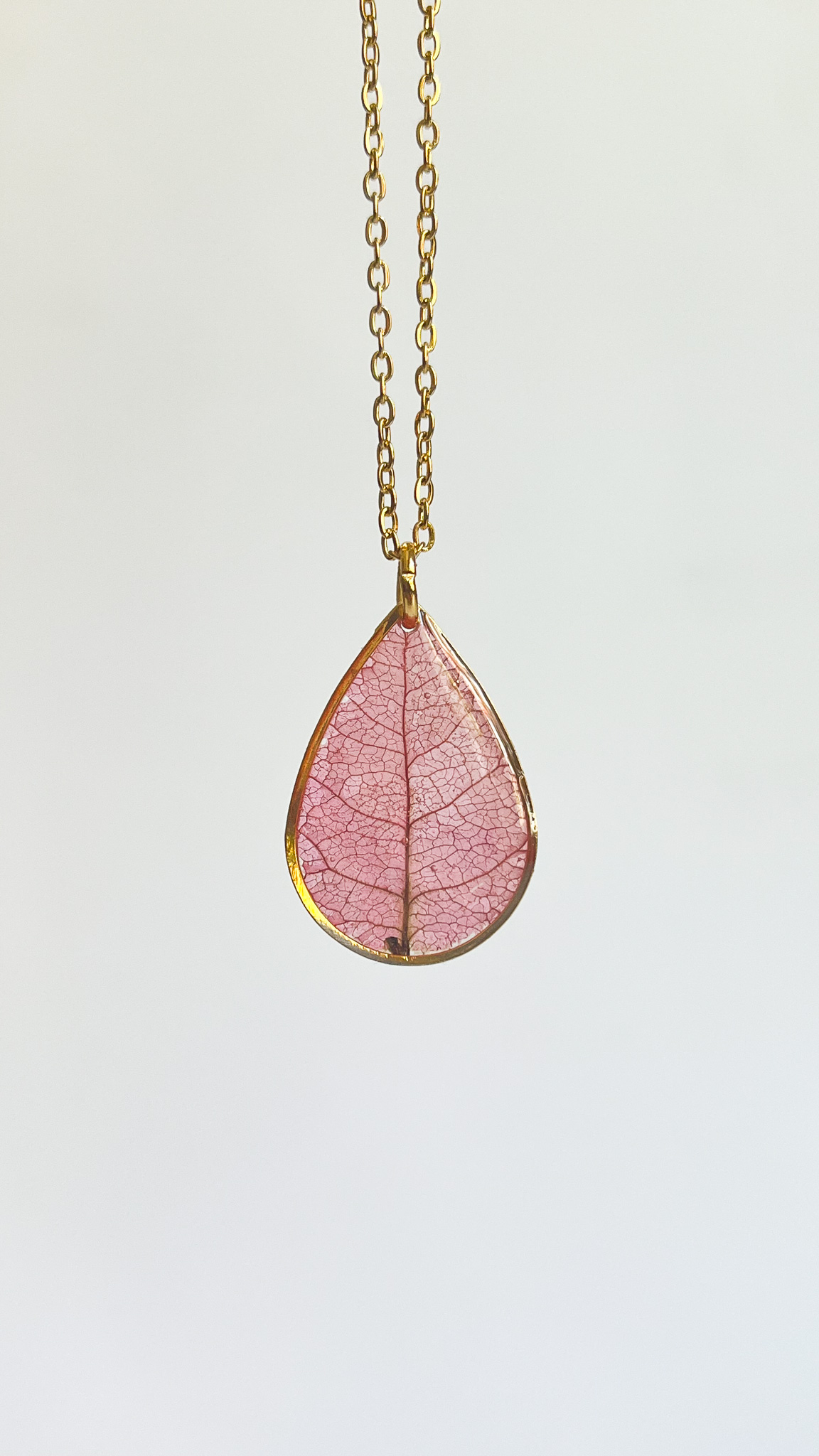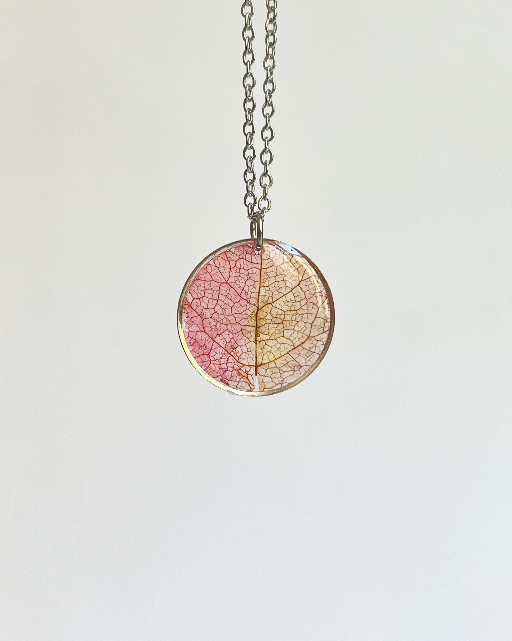 Okrągły naszyjnik z płatkiem bugenwilli i jego widocznymi żyłkami. Naturalnie płatek miał dwa kolory na połowach - różowy i beżowy