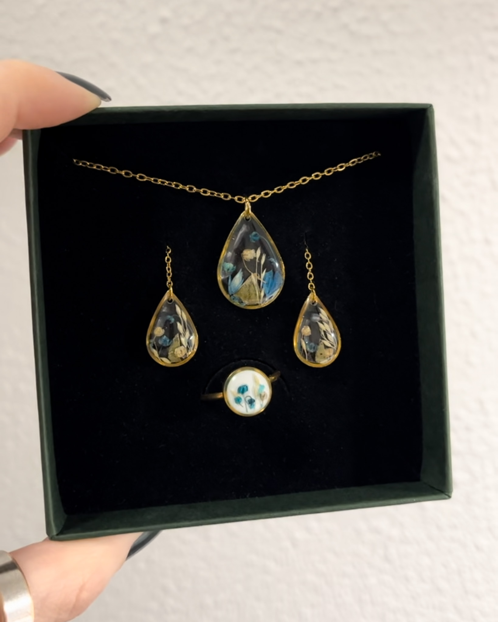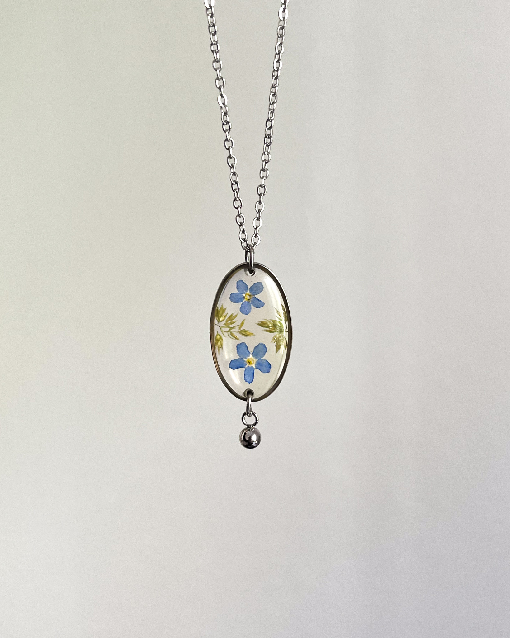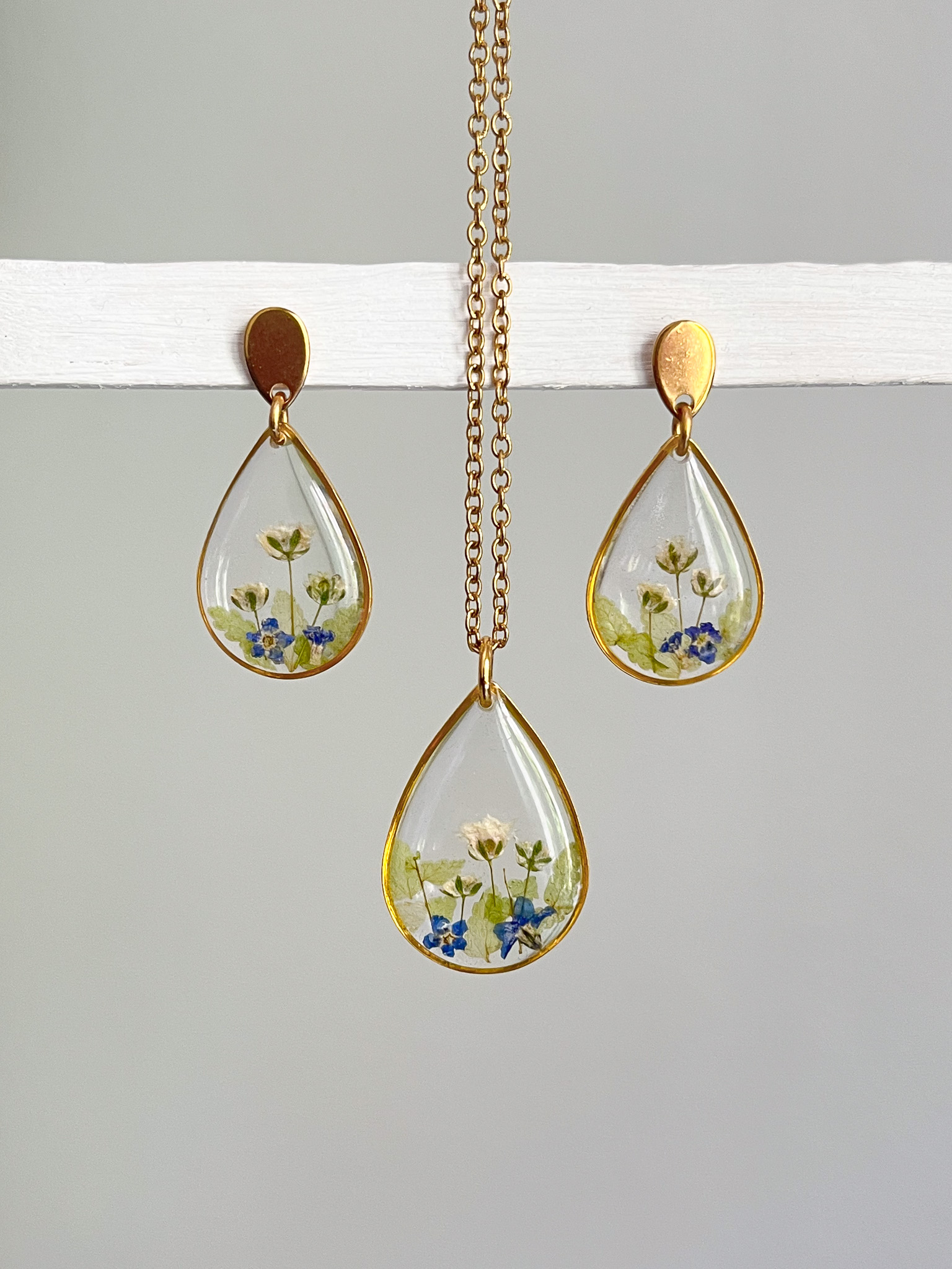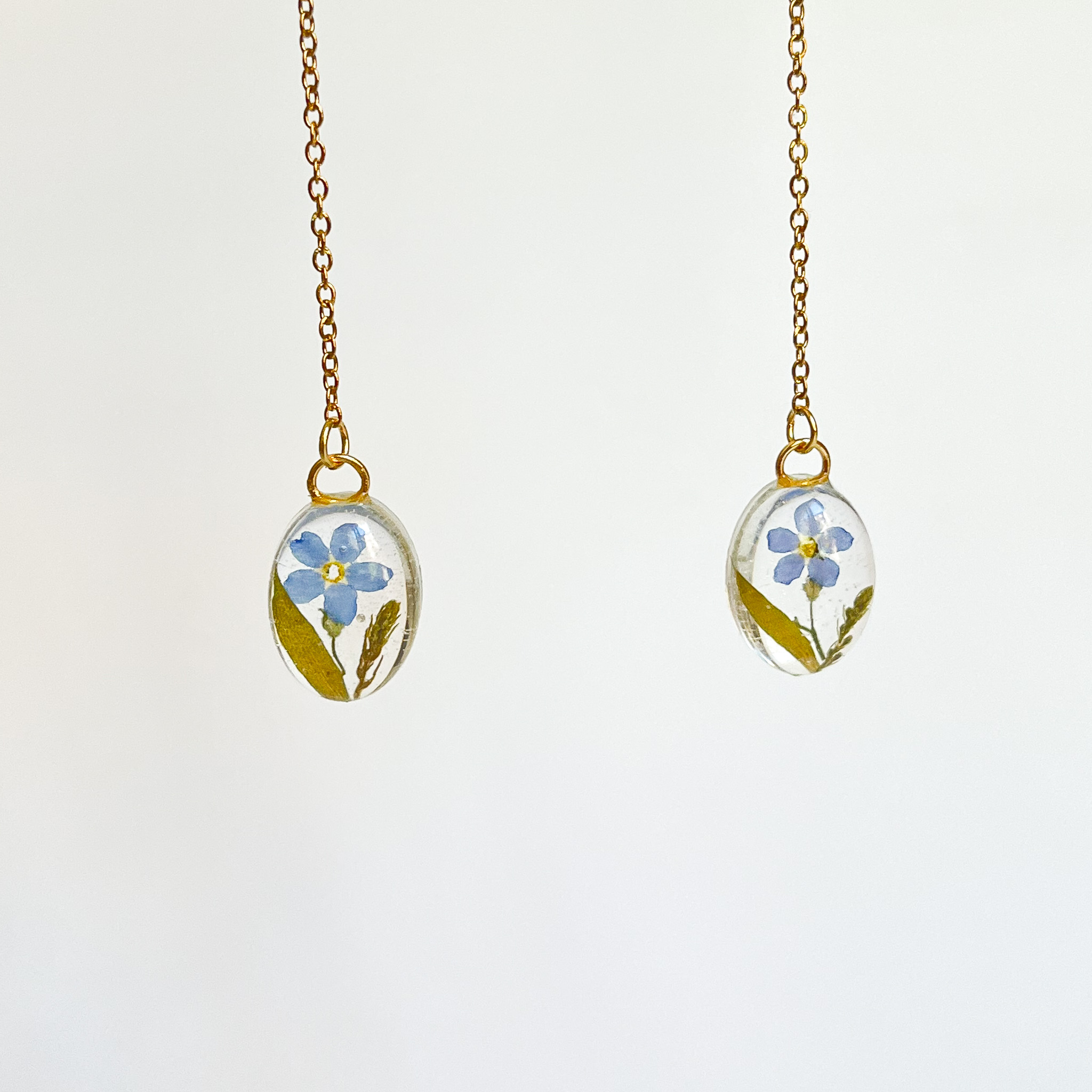 Kolczyki z niezapominajkami i zielenią zamkniętymi w drobnych kroplach na długim łańcuszku