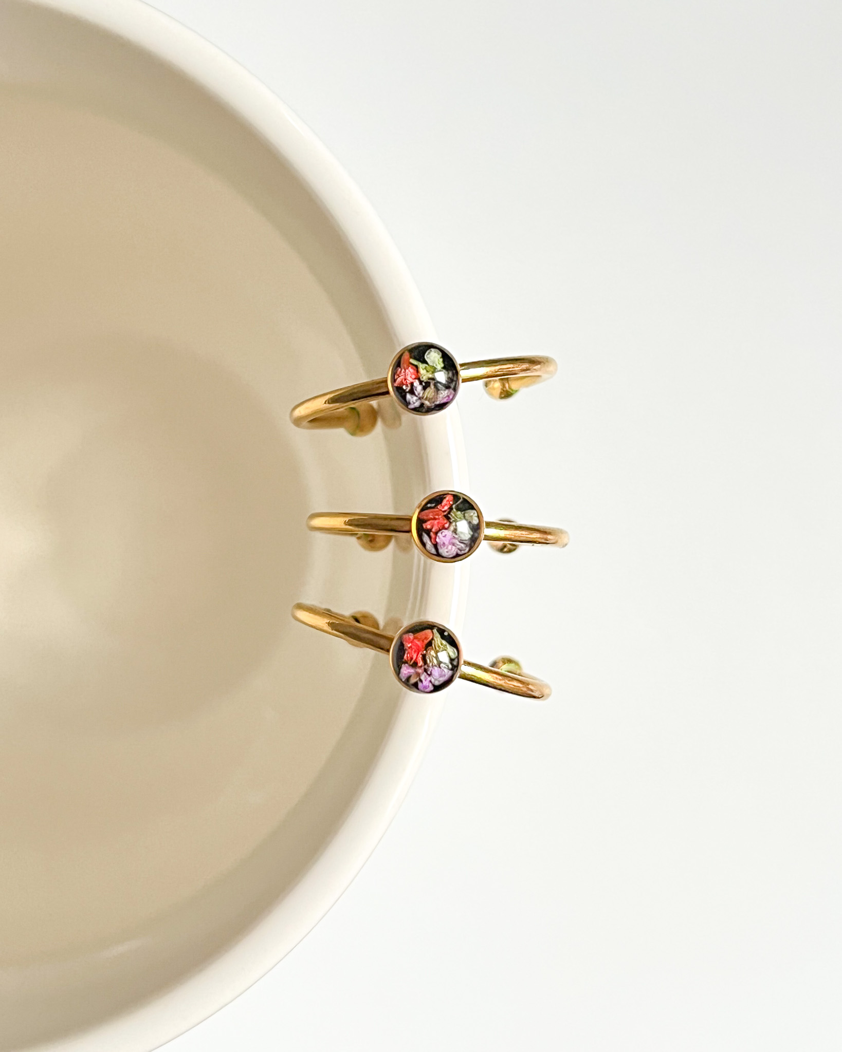 Dwie pary kolczyków i pierścionek z kolorowymi kwiatami na kontrastującym, czarnym tle. Zdjęcie z kolekcji Północnej