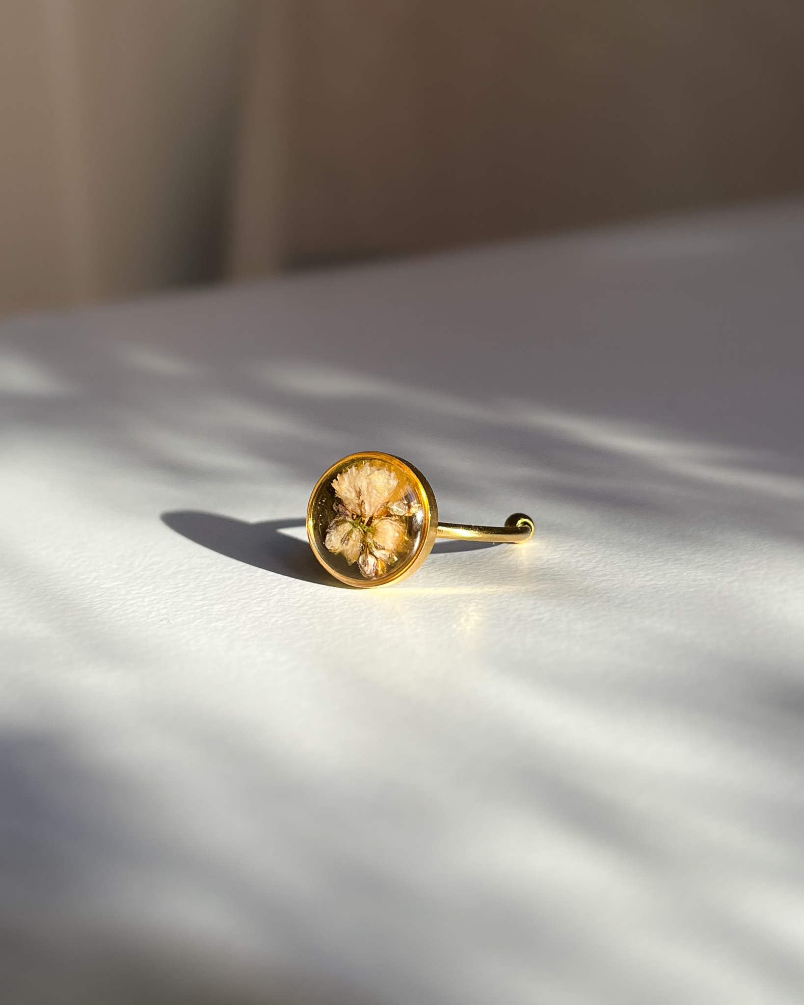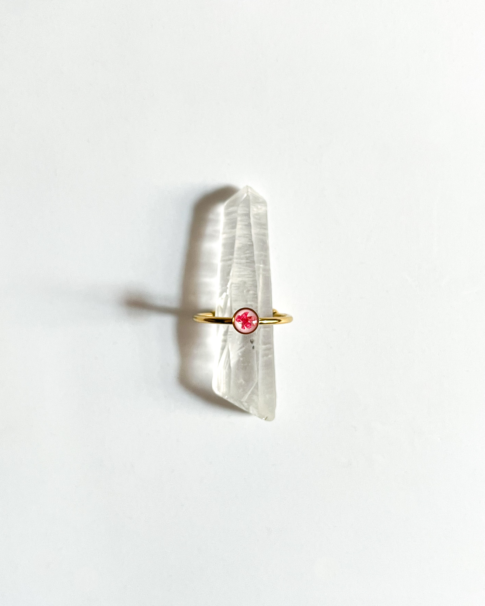 Delikatny, złoty pierścionek z jasnym tłem i malutkim, różowym kwiatkiem