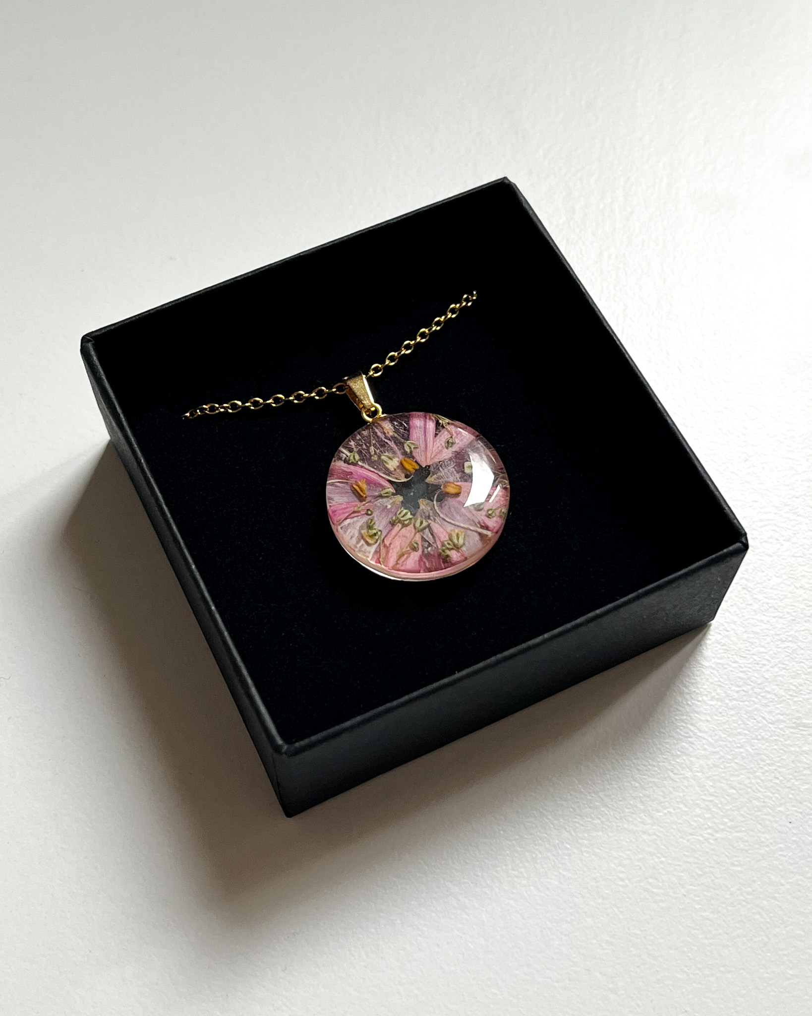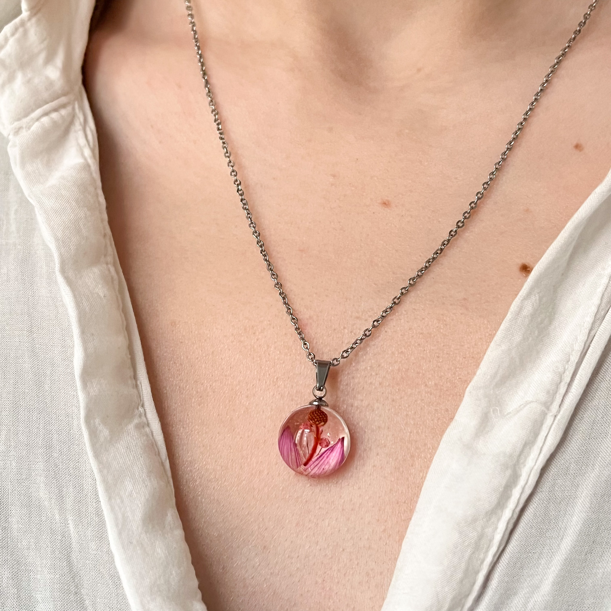 Naszyjnik-cukiereczek, czyli różowe kwiaty zamknięte w gładkiej, przezroczystej półkuli