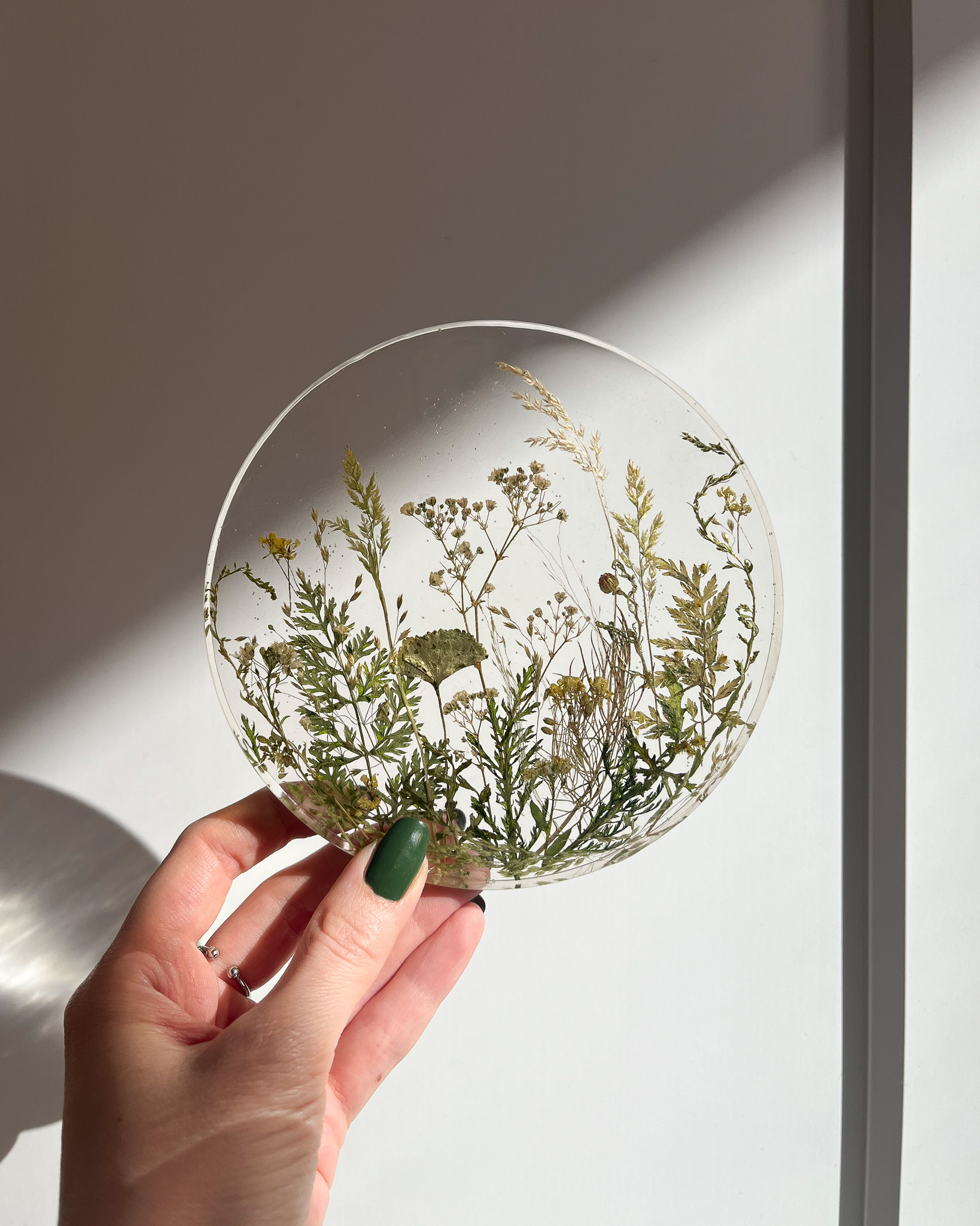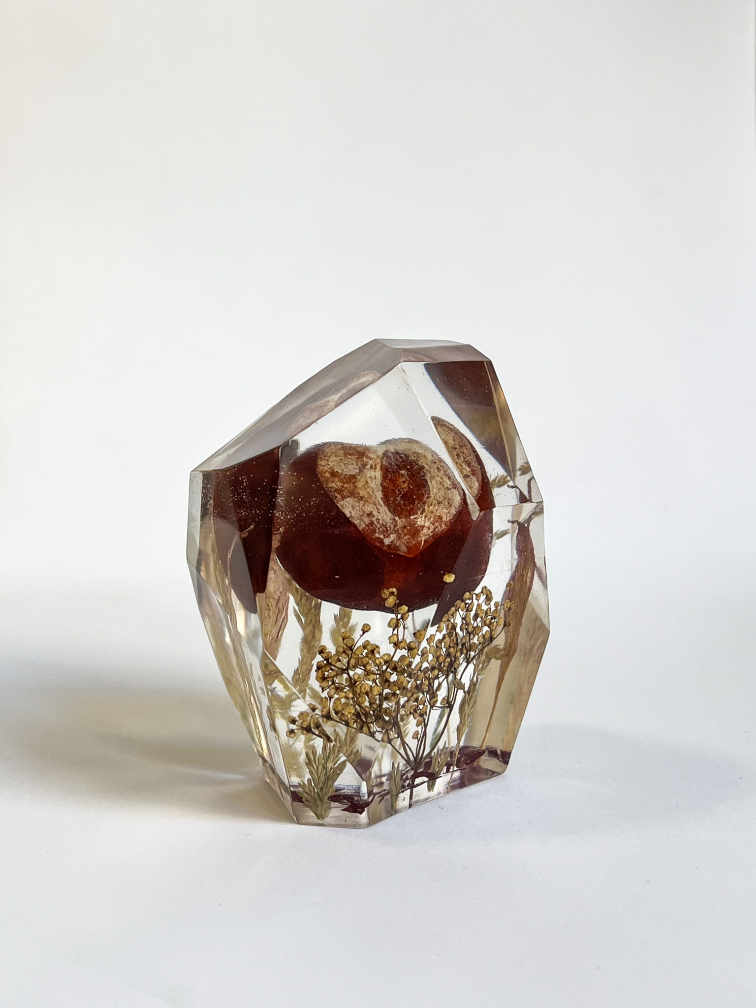 Historia tej pamiątki z kasztanem jest bardzo prywatna i głęboko ważna dla klientki. Oprócz naszej głównej gwiazdy użyłyśmy roślin z moich zbiorów i powiem tylko tyle, że każda z nich została bardzo dogłębnie przemyślana i dobrana symbolicznie.