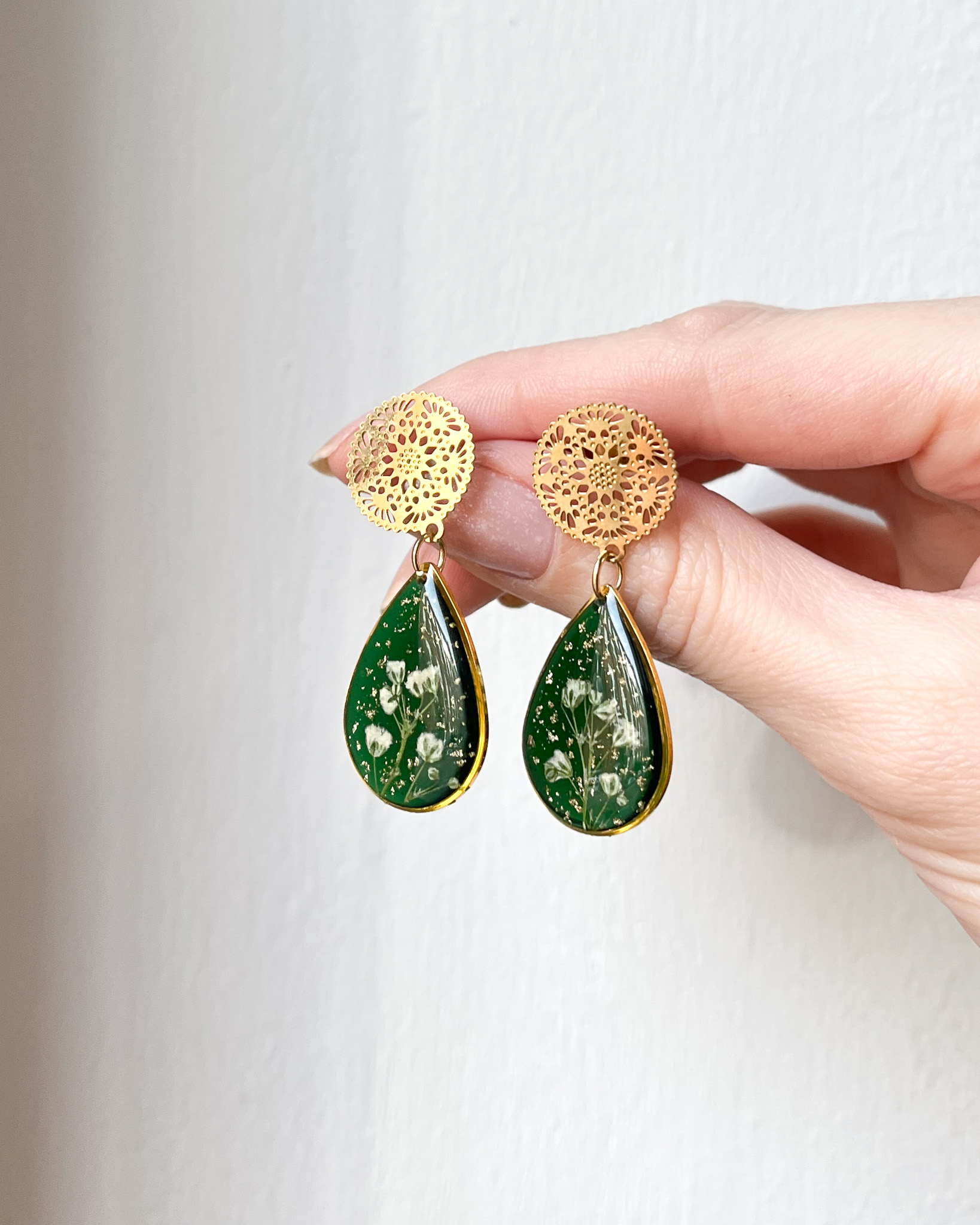 Wiszące, złote kolczyki na bogato: zielone, półprzezroczyste tło, jasne kwiaty i drobinki złota na ozdobnych, koronkowych sztyftach