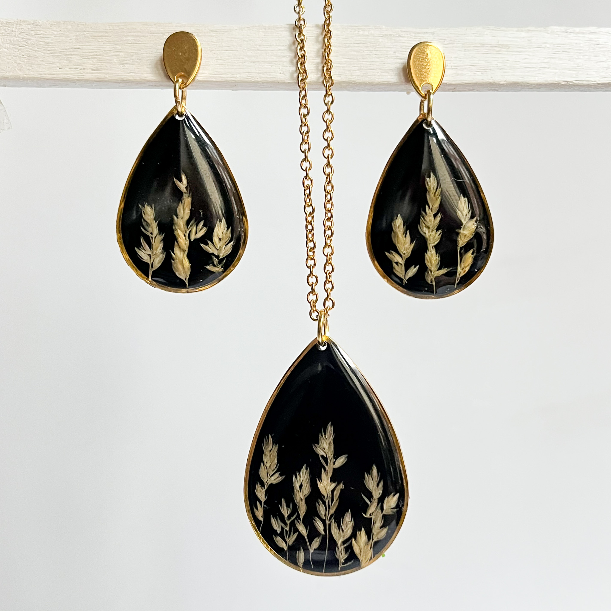 Zestaw wiszących kolczyków i naszyjnika w kształcie łezek, z czarnym tłem i kontrastującą trawą przypominającą zboże