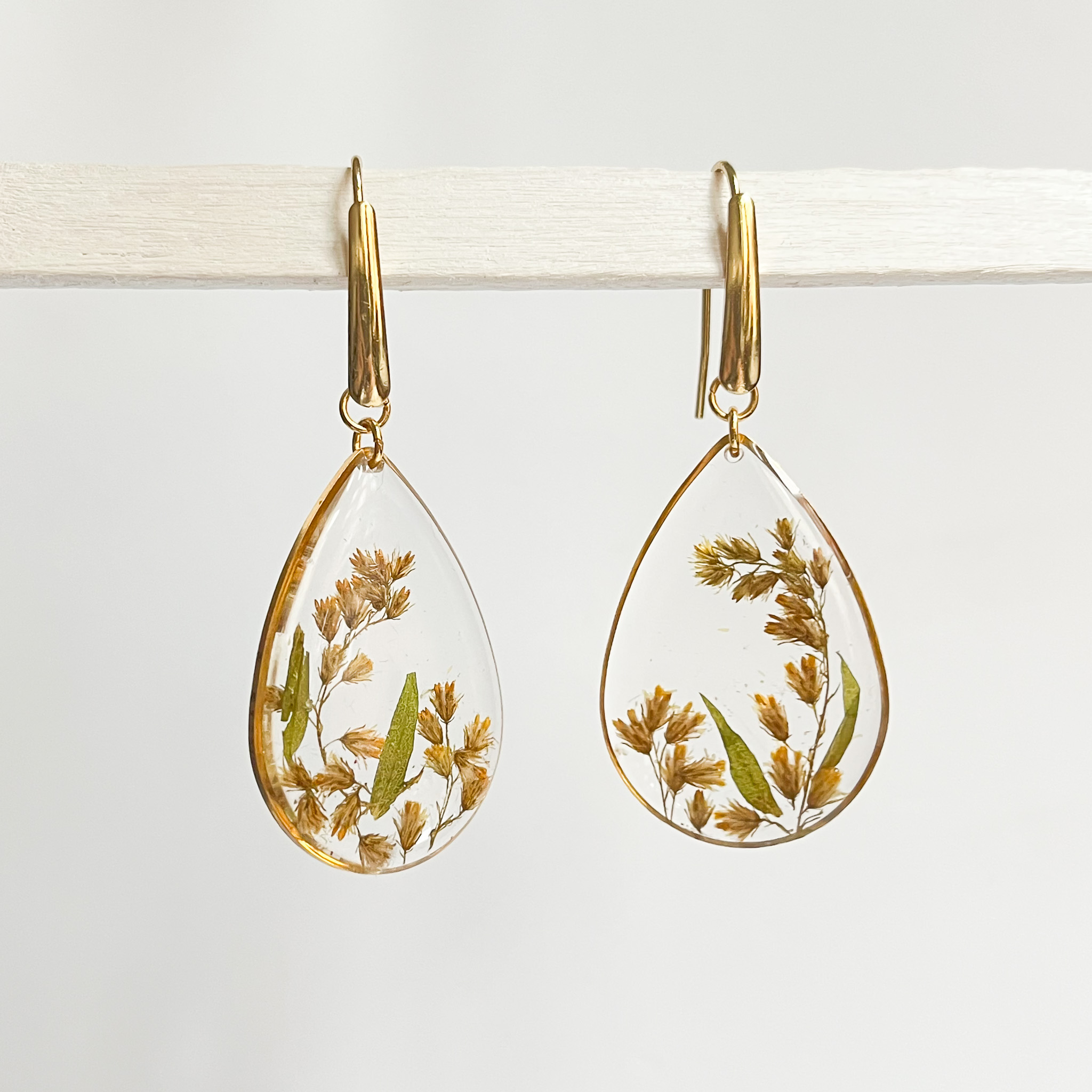 Duże kolczyki w kształcie łezek ze złotą nawłocią