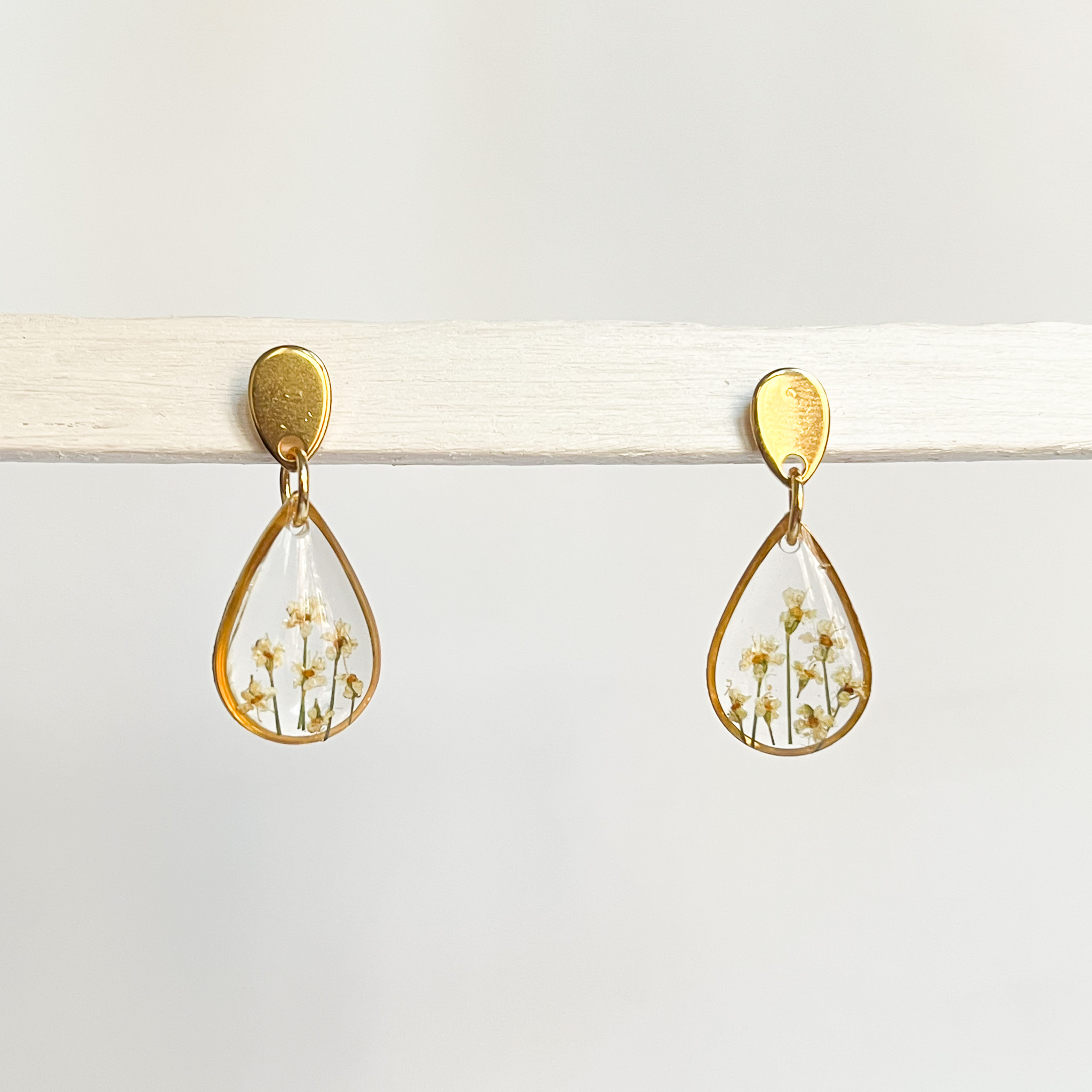 Subtelne, złote łezki z malutkimi, białymi kwiatkami