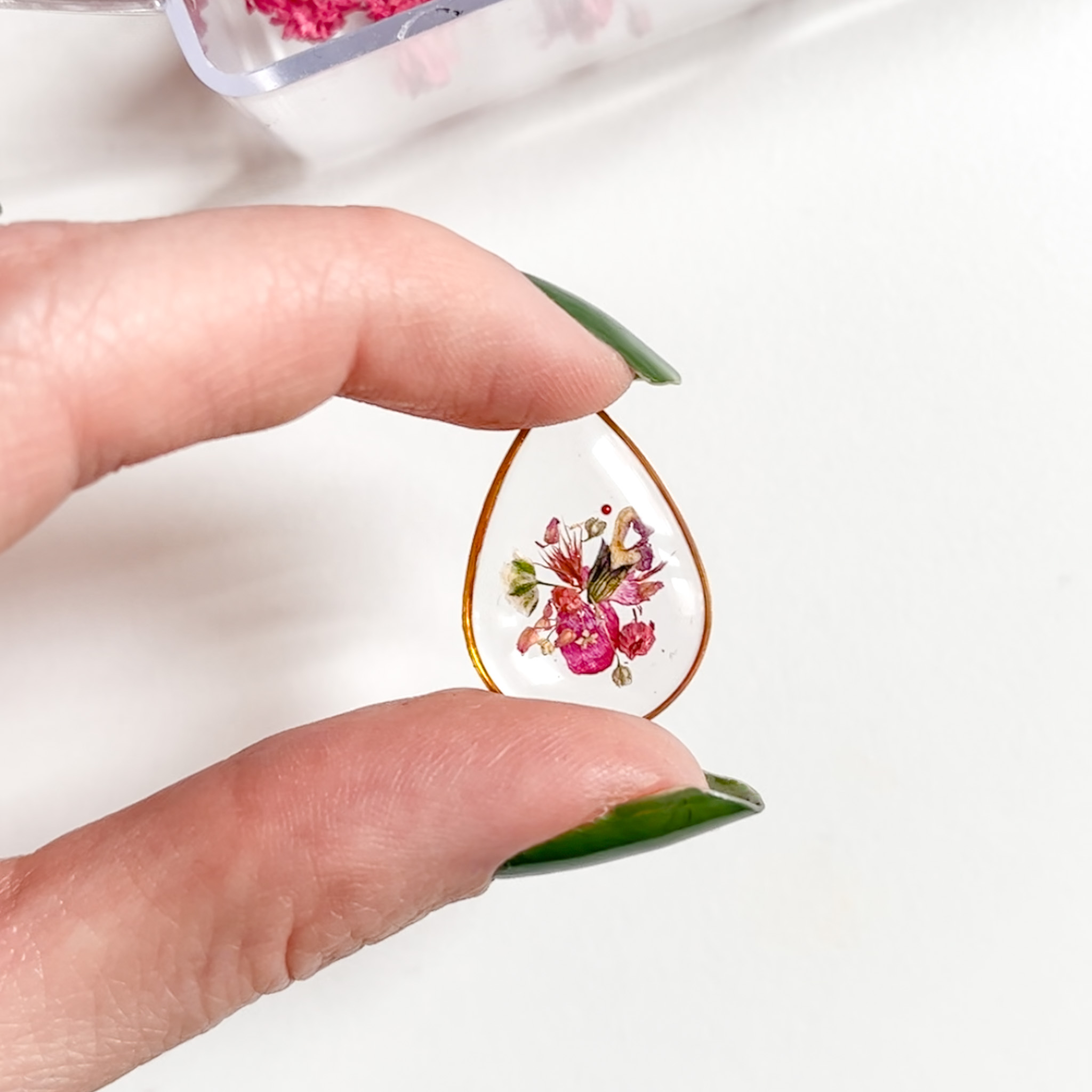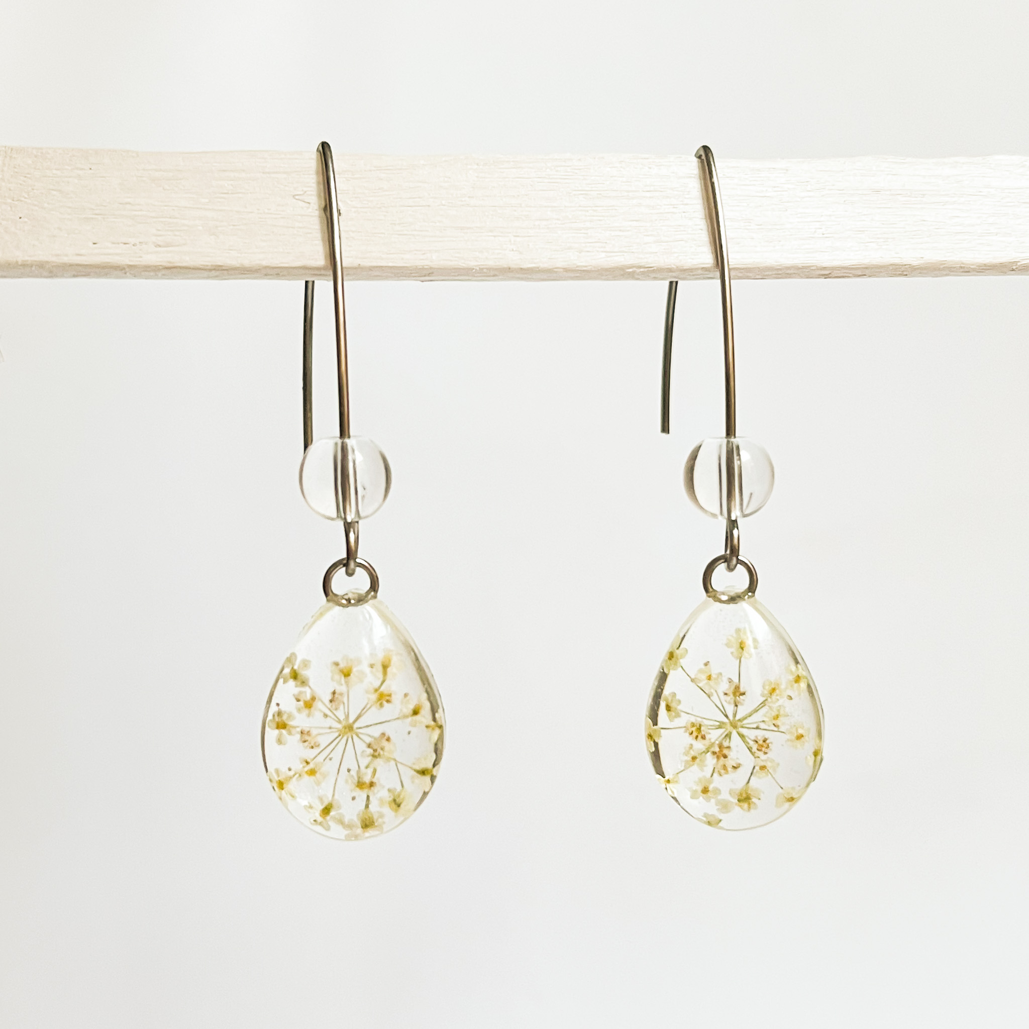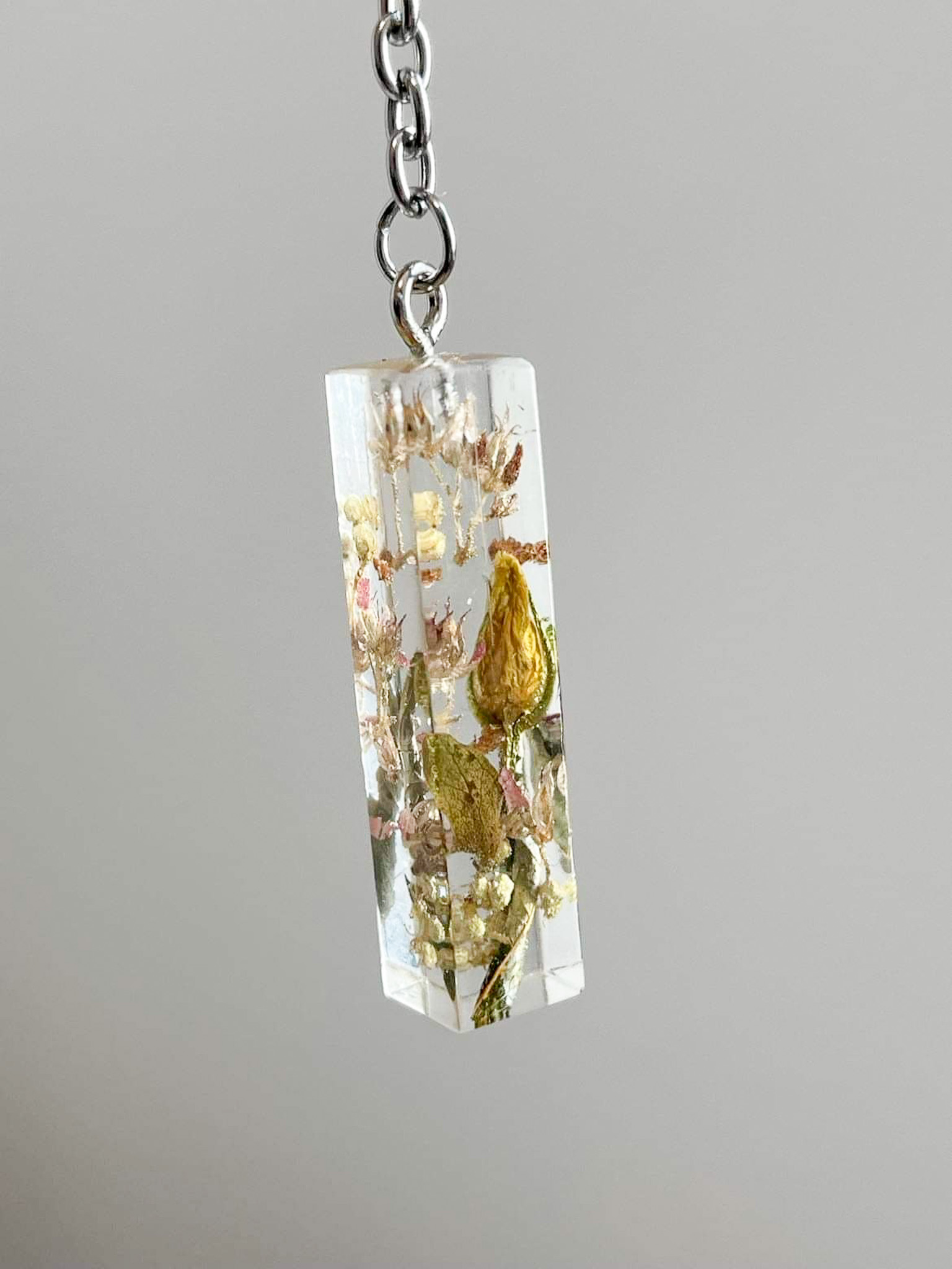 Przezroczysta zawieszka z pojedynczym kwiatkiem, zamontowana na sztyfcie z prawdziwym liściem