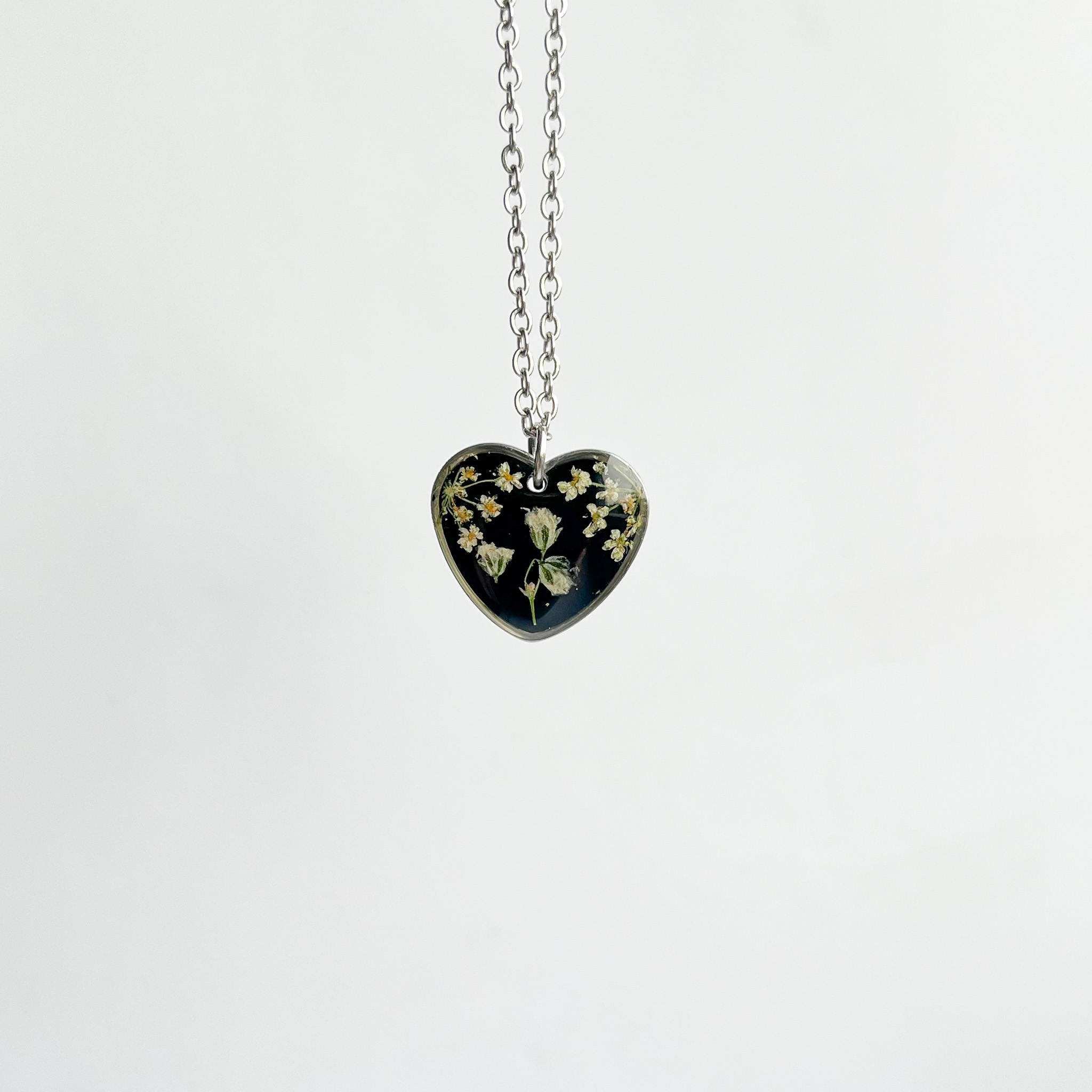 Delikatny, czarny naszyjnik w kształcie serca z gipsówką i koronkową marchwią