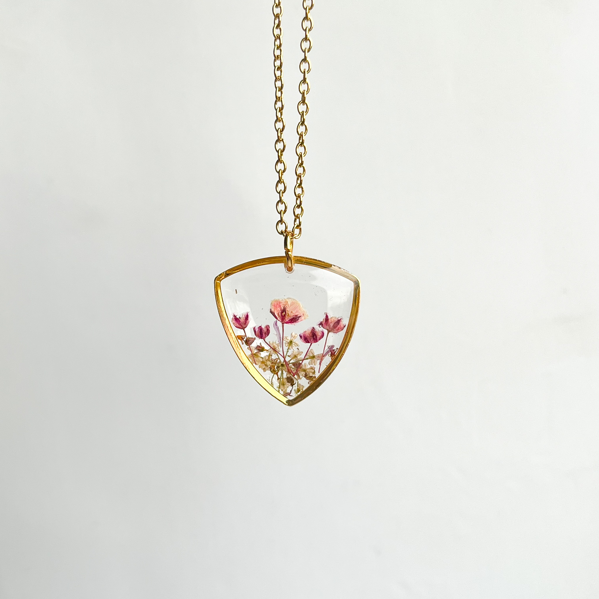 Trójkątny, złoty naszyjnik z różową łąką na przezroczystym tle