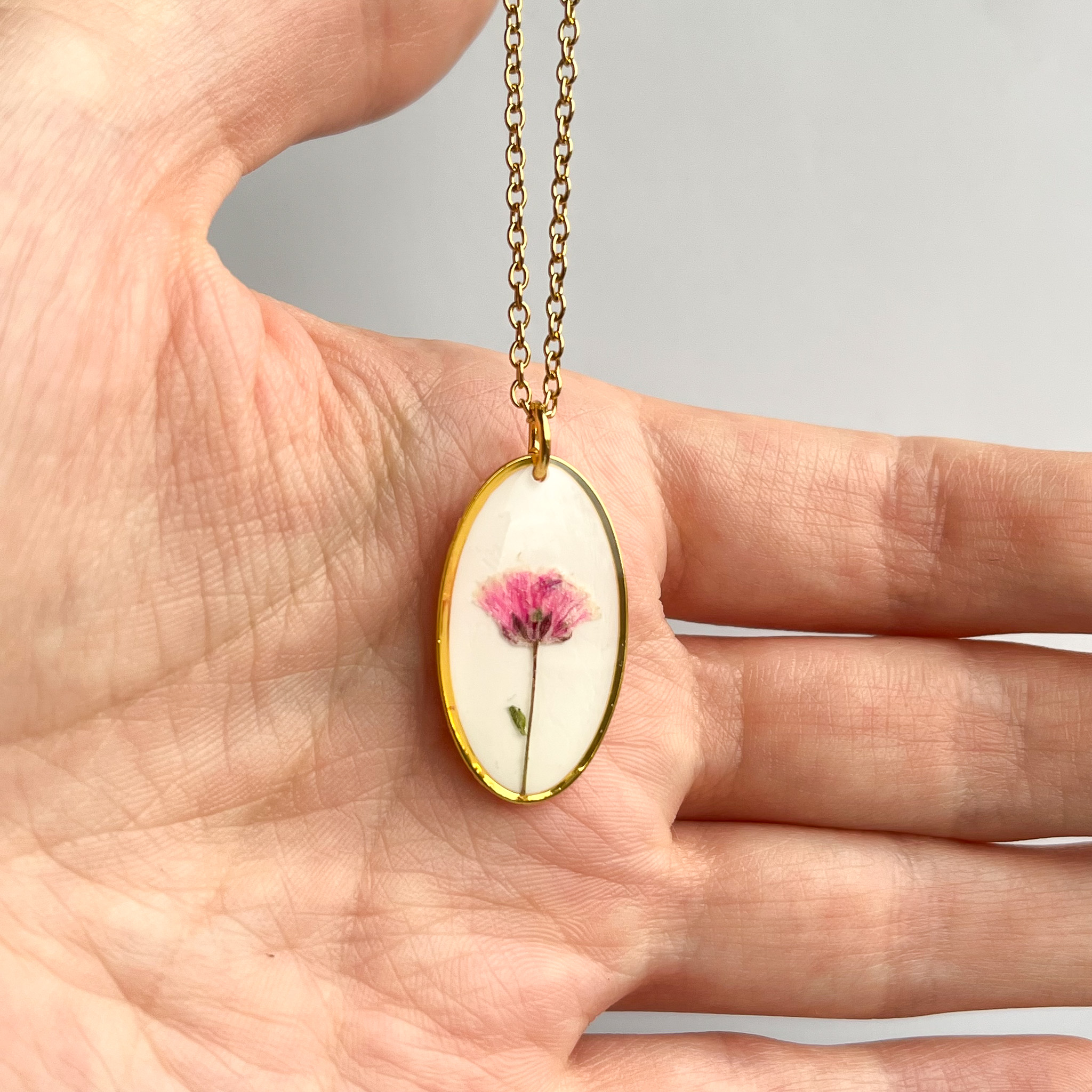 Owalny naszyjnik ala ramka vintage - pojedynczy różowy kwiat z listkiem na białym tle