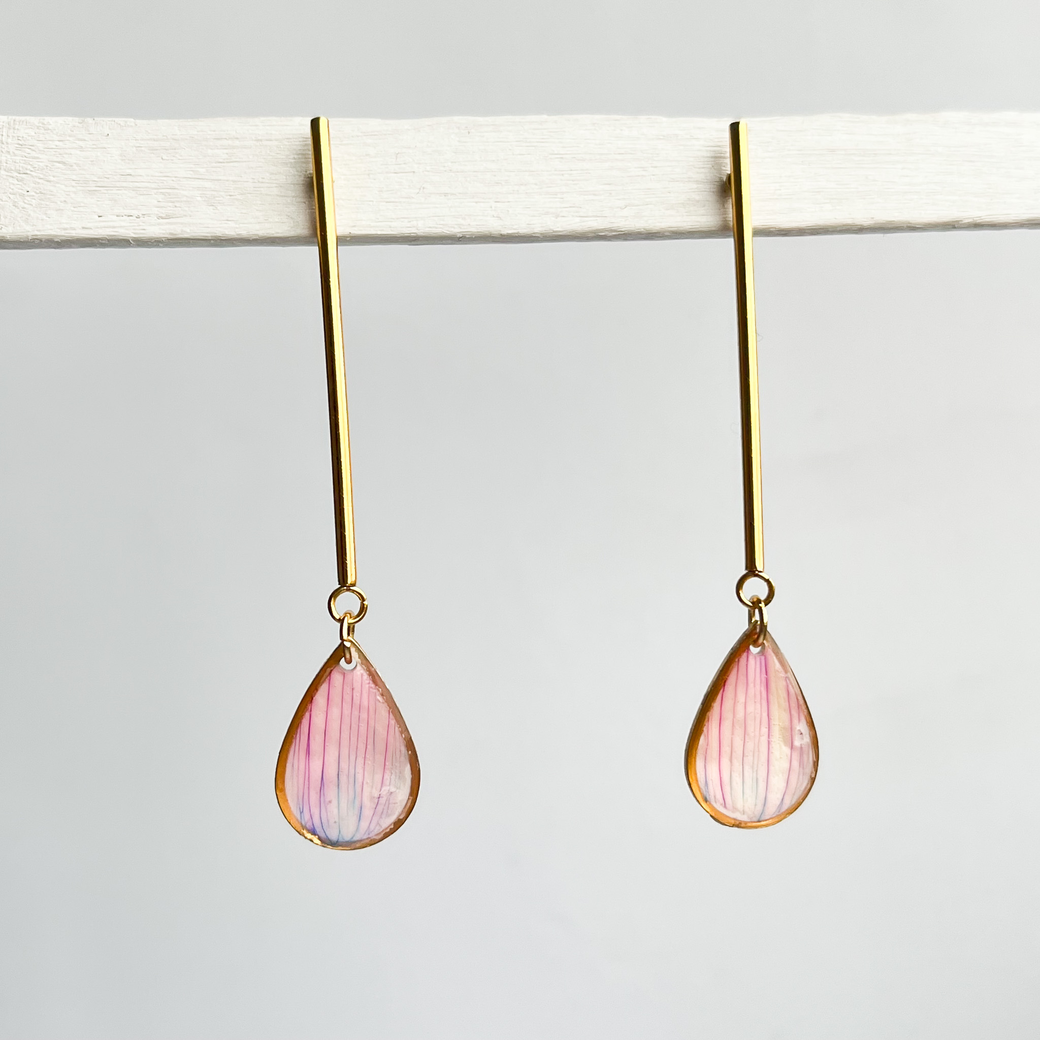Drobne łezki z wyjątkowymi, różowo-niebieskimi płatkami kwiatów na długim, złotym sztyfcie