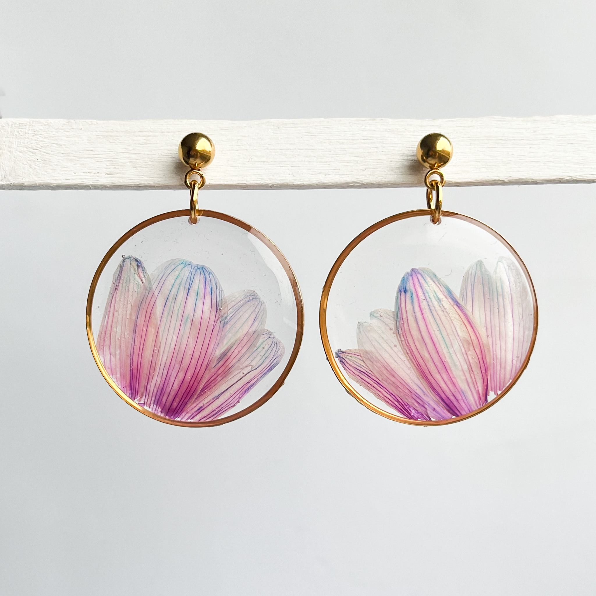 Duże kolczyki w kształcie koła z wyjątkowymi, różowo-niebieskimi płatkami kwiatów