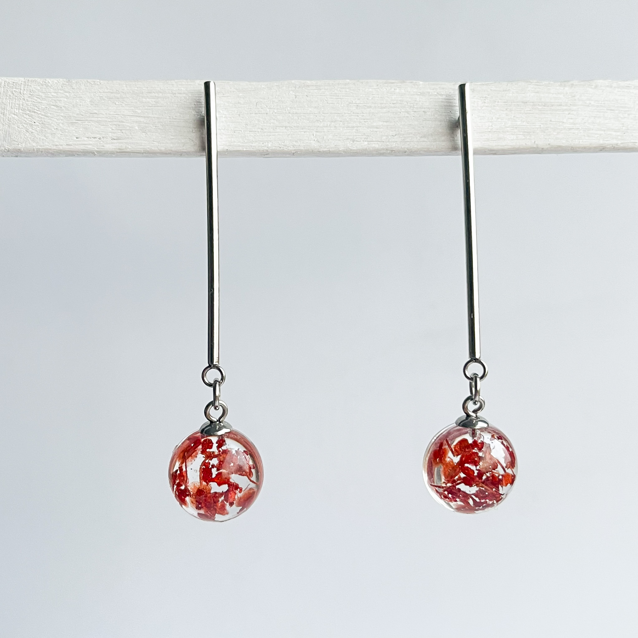 Intensywnie czerwone półkule na długim, srebrnym sztyfcie
