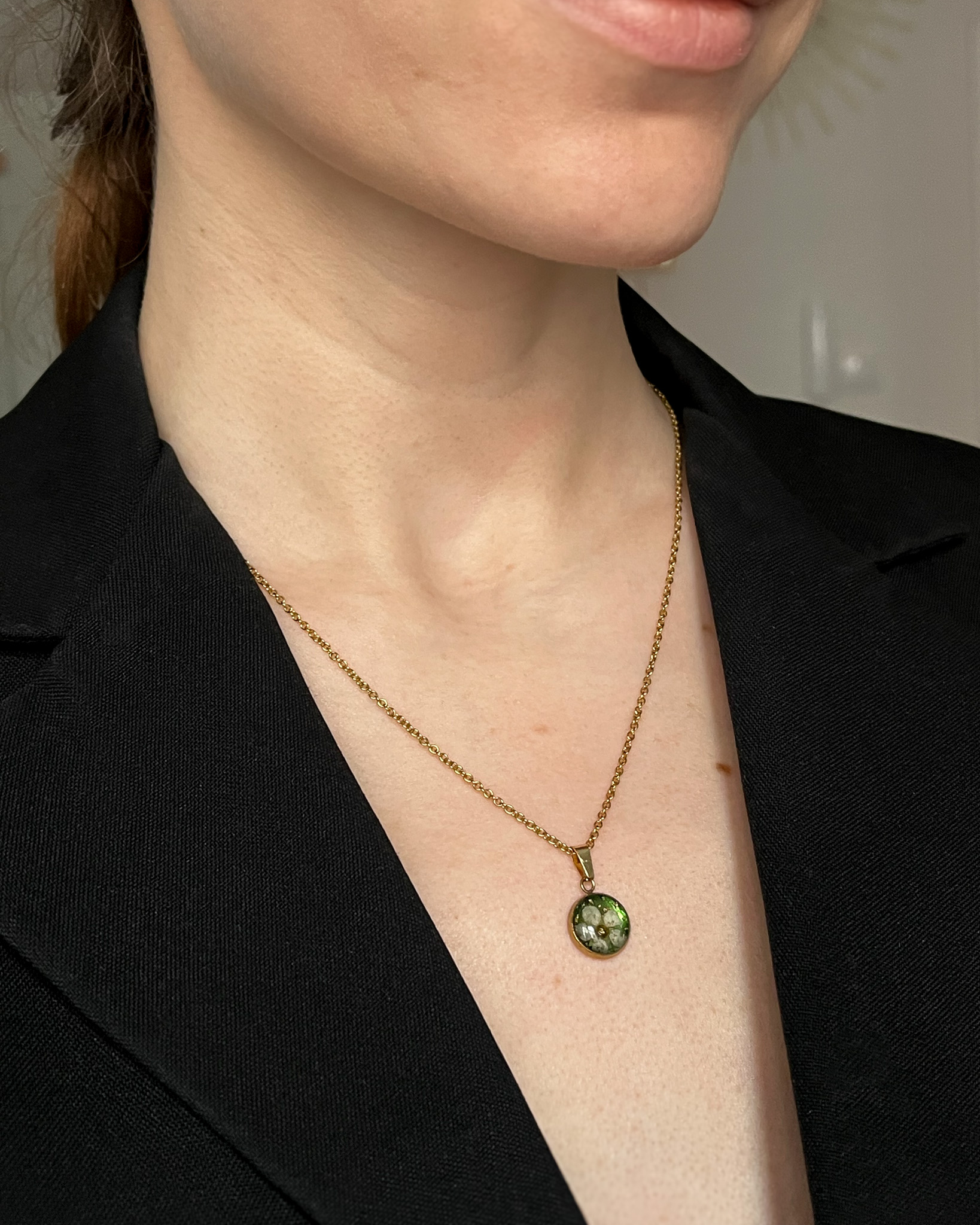 Subtelny medalik z zielonym tłem, białym kwiatkiem tawuły i złotymi drobinkami