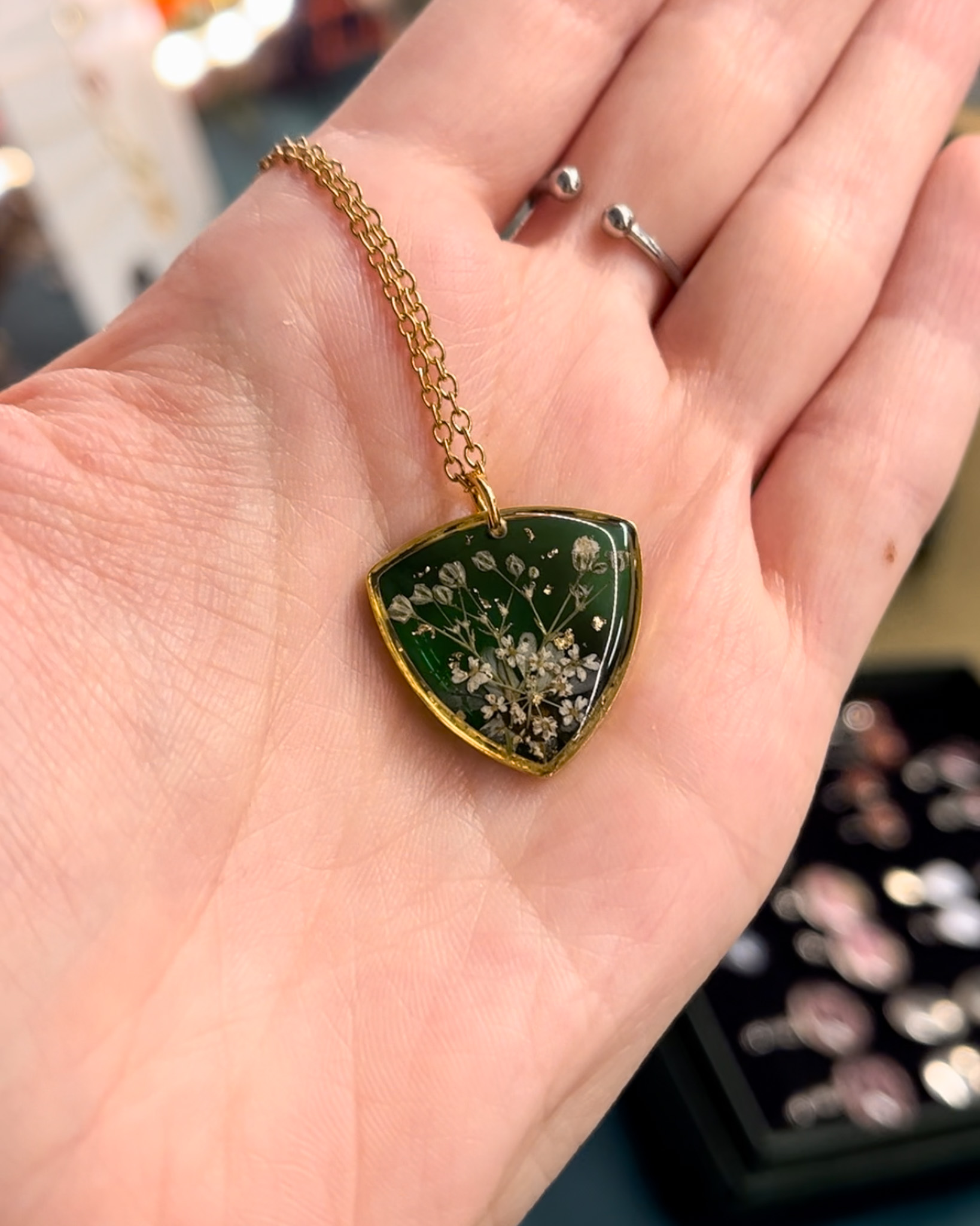 Trójkątny, złoty naszyjnik z zielonym tłem, jasnymi roślinami i złotymi drobinkami