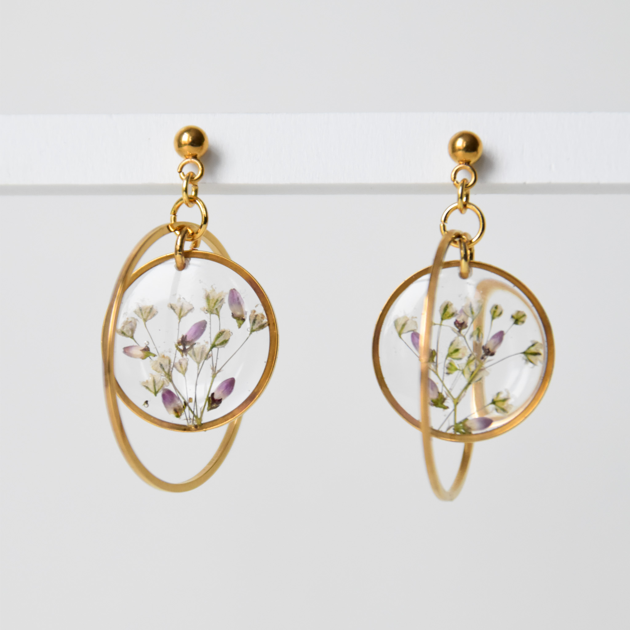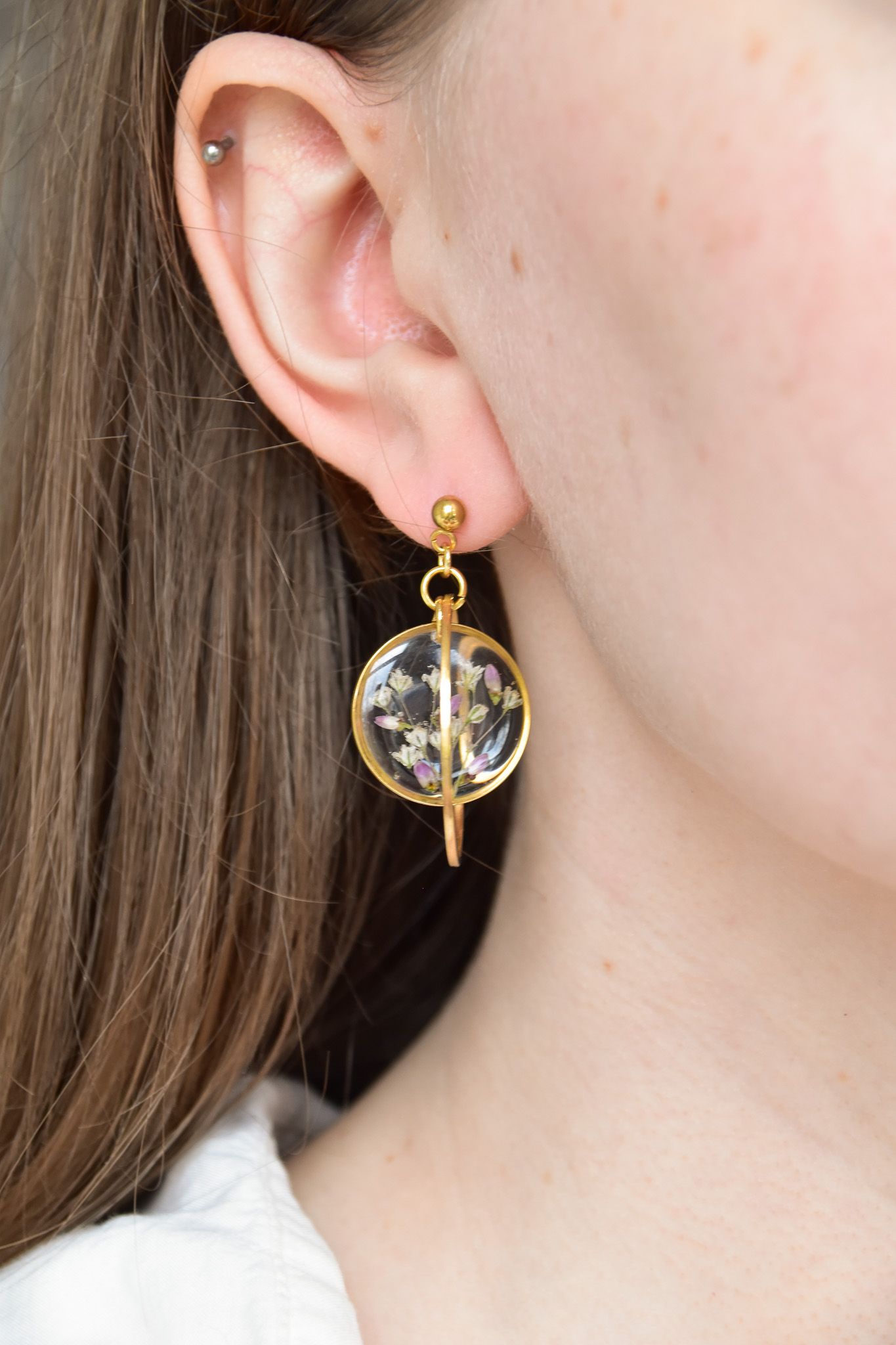 Kolczyki-planety czyli mój autorski hit! Okrągłe zawieszki mają w sobie kwiaty gipsówki i wrzosu, a dodatkowe obręcze, które delikatnie się kręcą przypominają pierścienie Saturna. To jest zdecydowanie coś dla tych, którzy szukają efektu WOW ♡