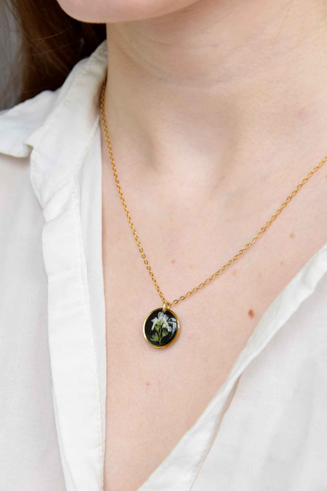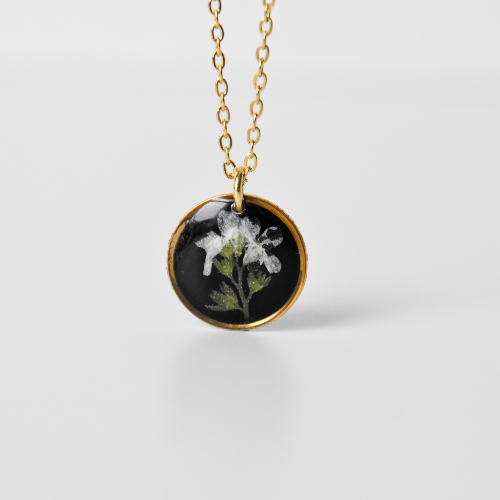 naszyjnik – czarne koło z gałązką białej niezapominajki