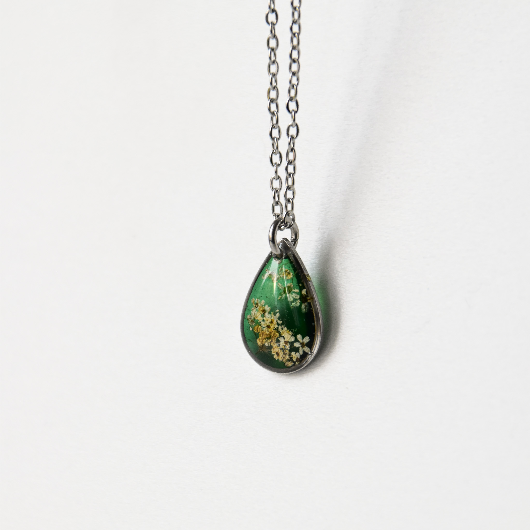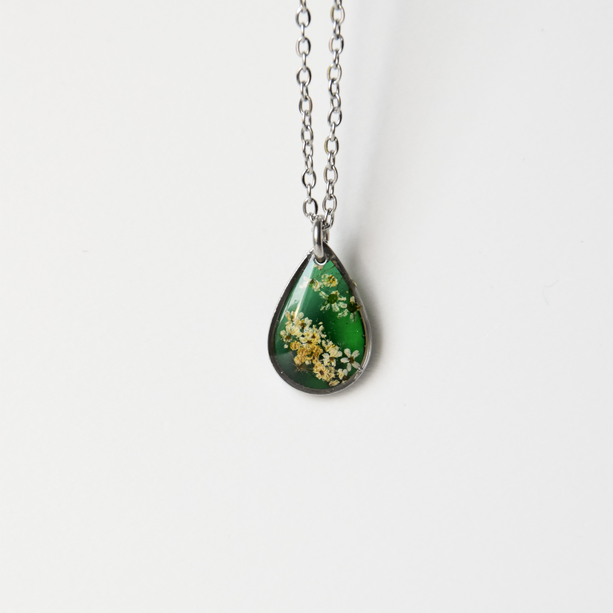 naszyjnik – drobna zielona łezka z jasnymi kwiatami