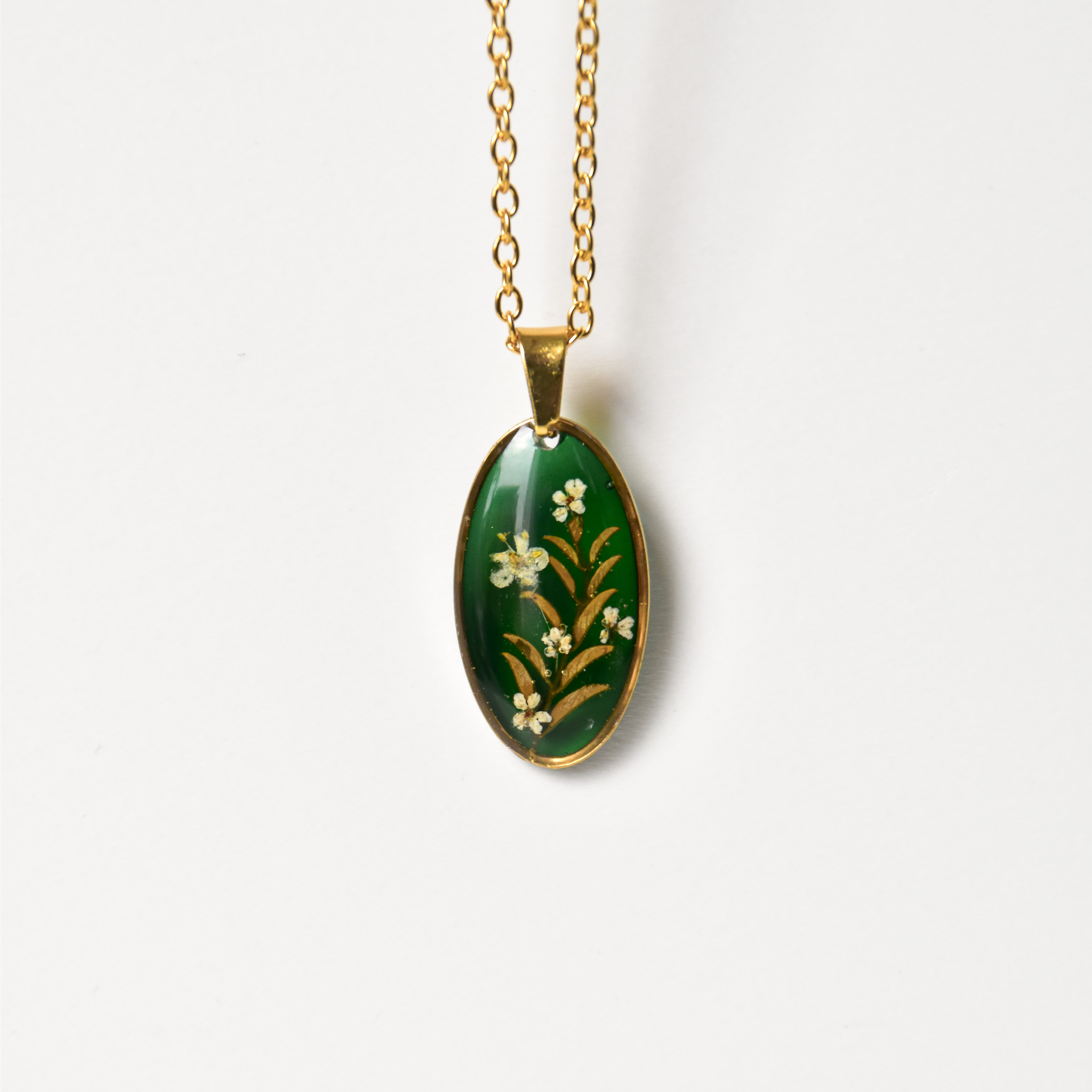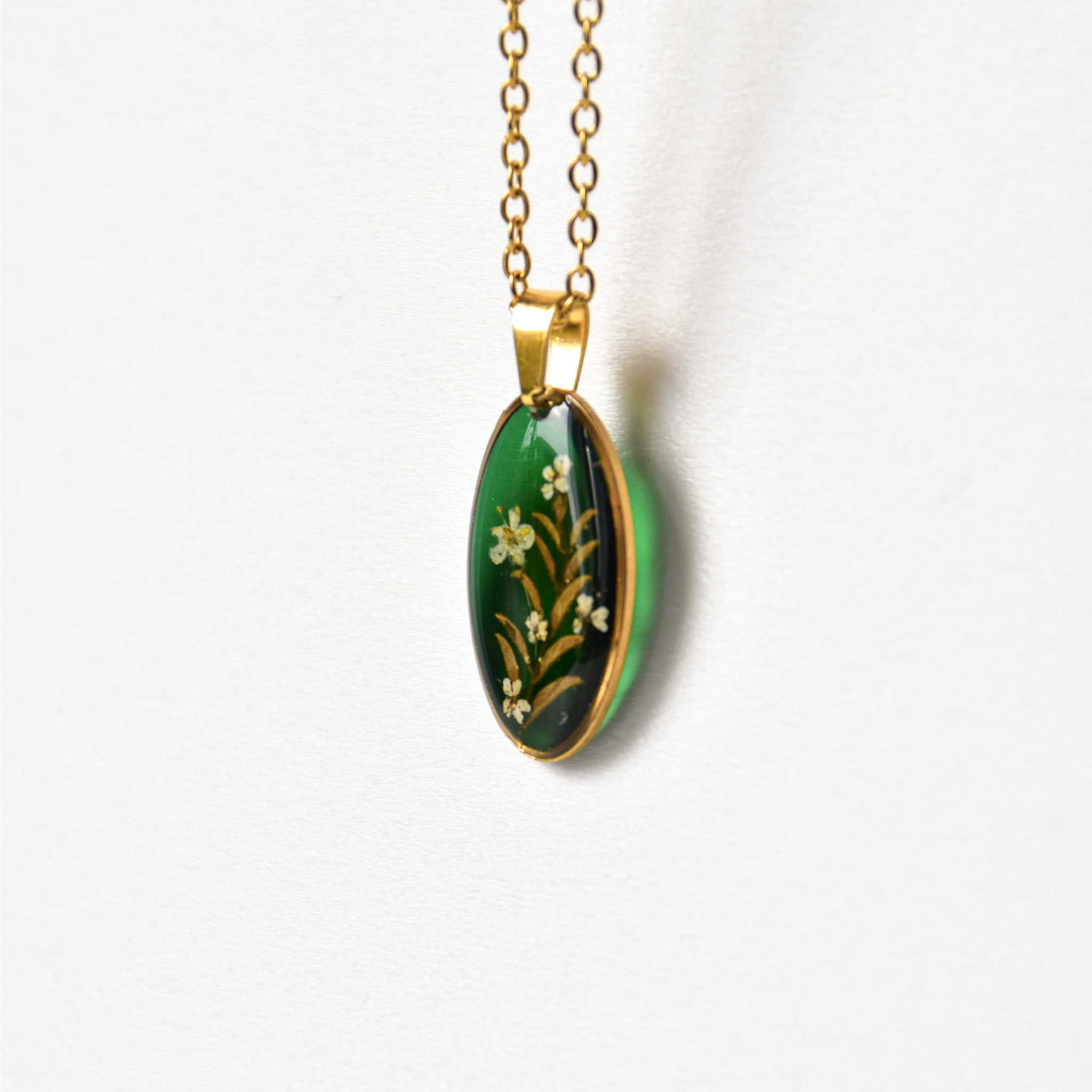 naszyjnik – gałązka z białymi kwiatami na zielonym tle