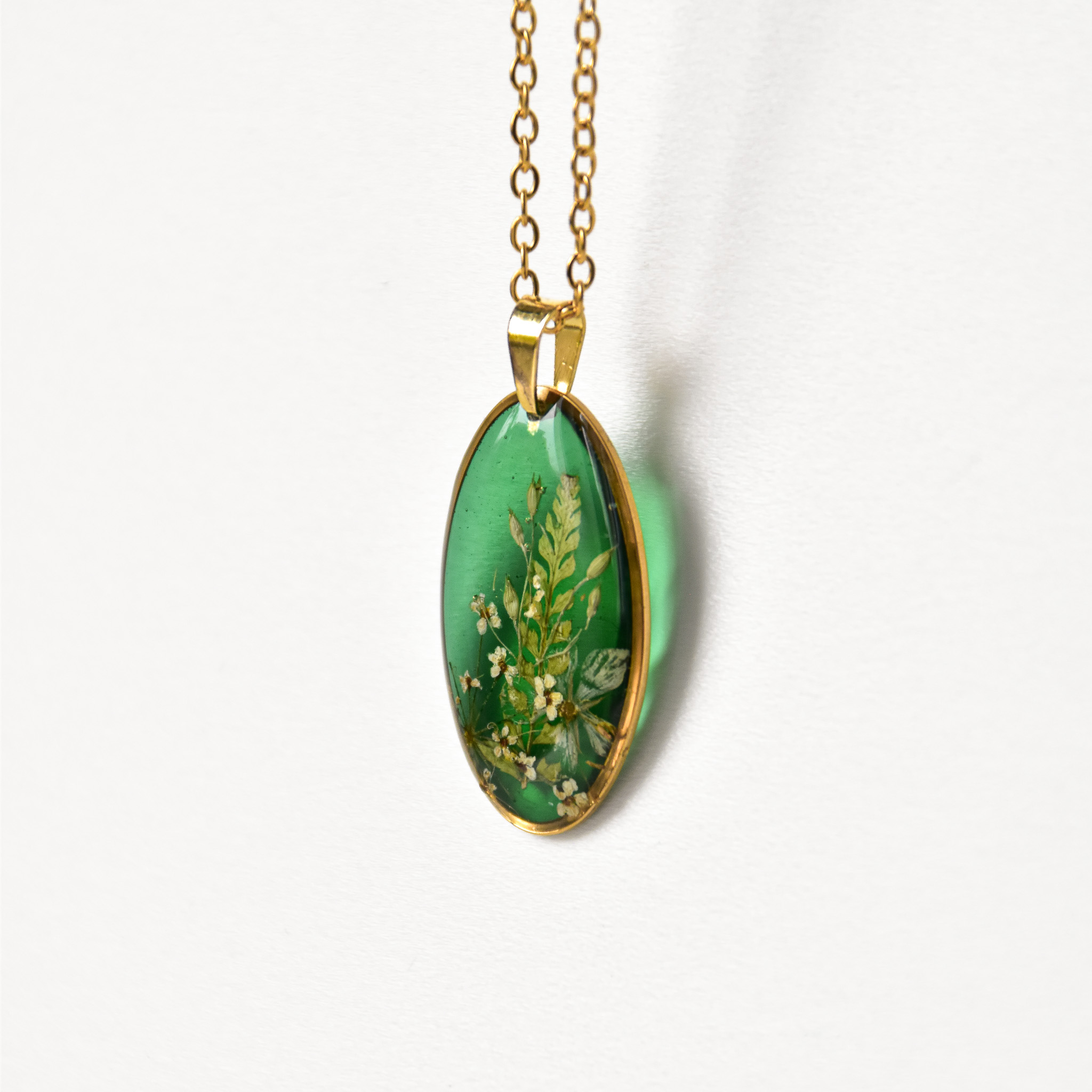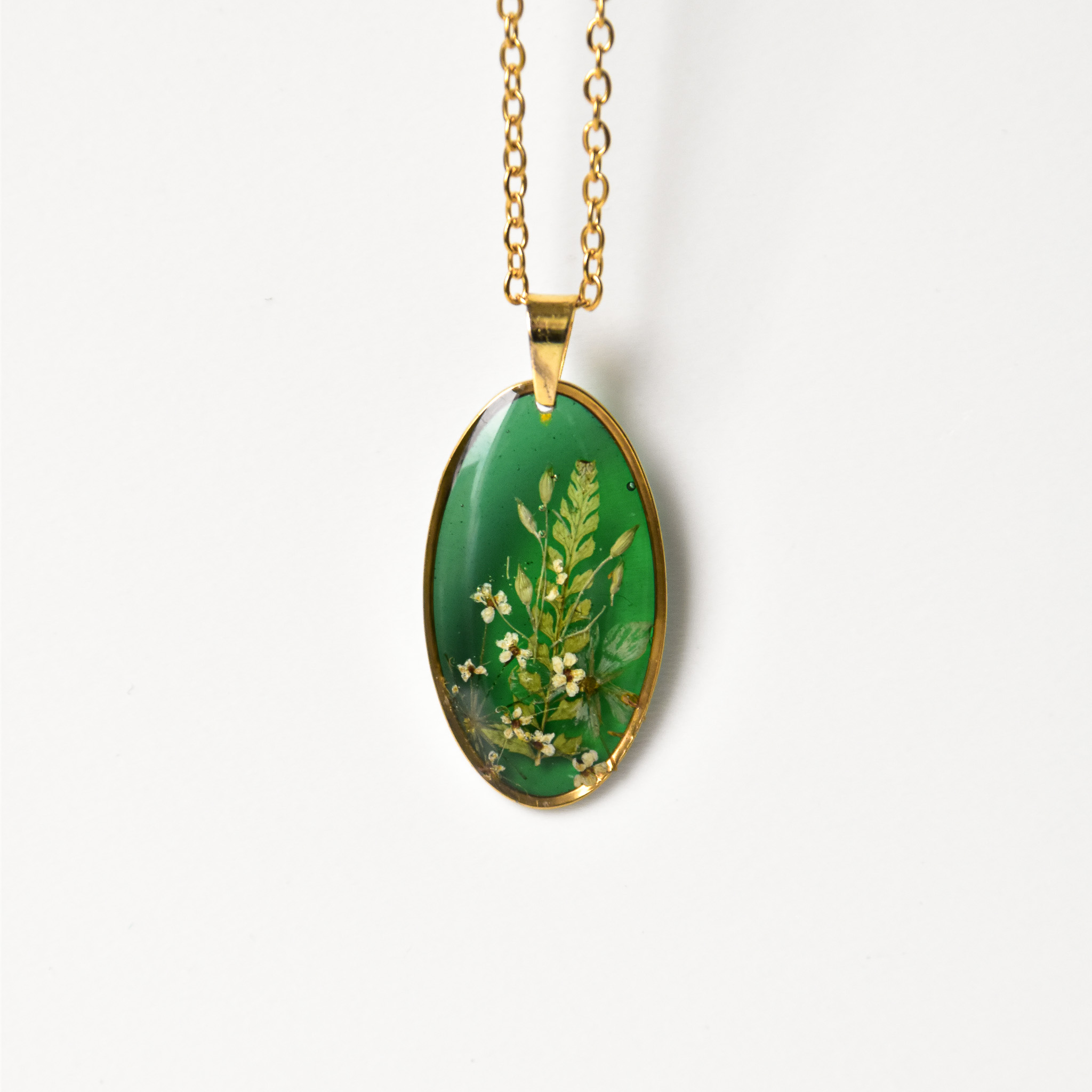 naszyjnik – kompozycja z paprocią i białymi kwiatami