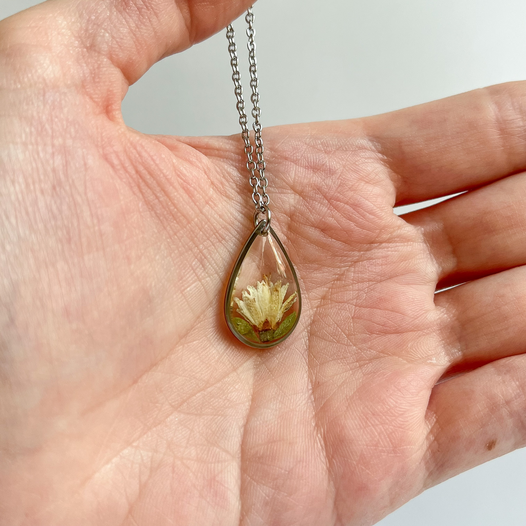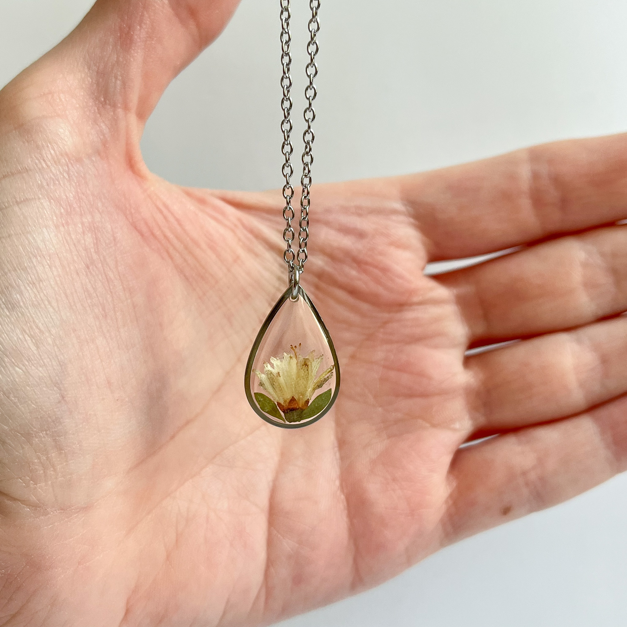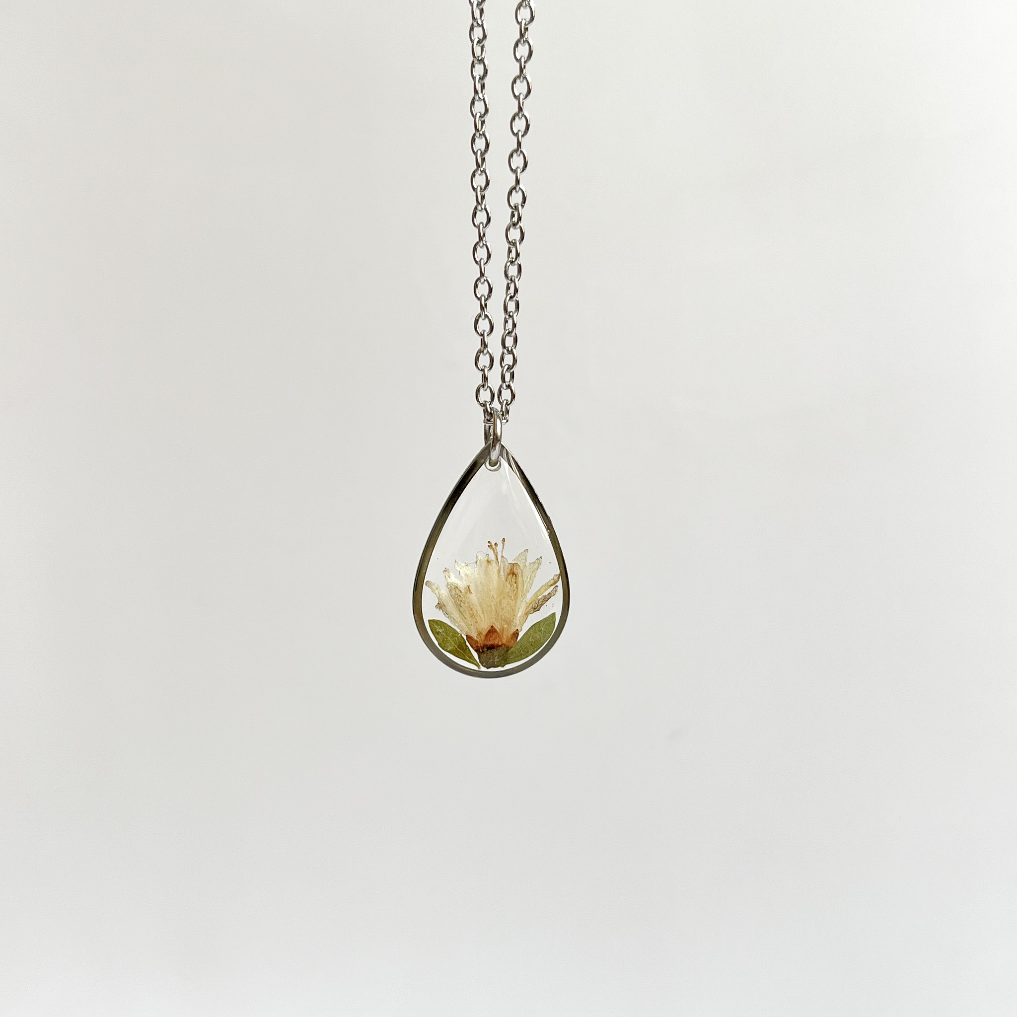 naszyjnik – łezka z białym kwiatem i zielonymi listkami