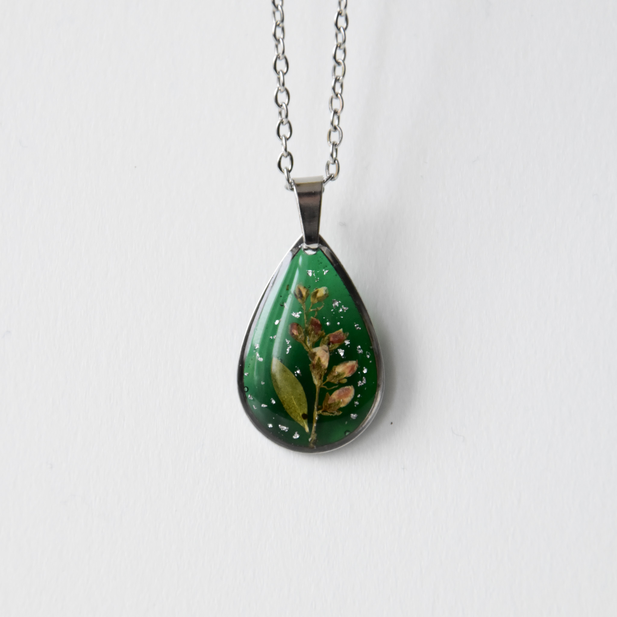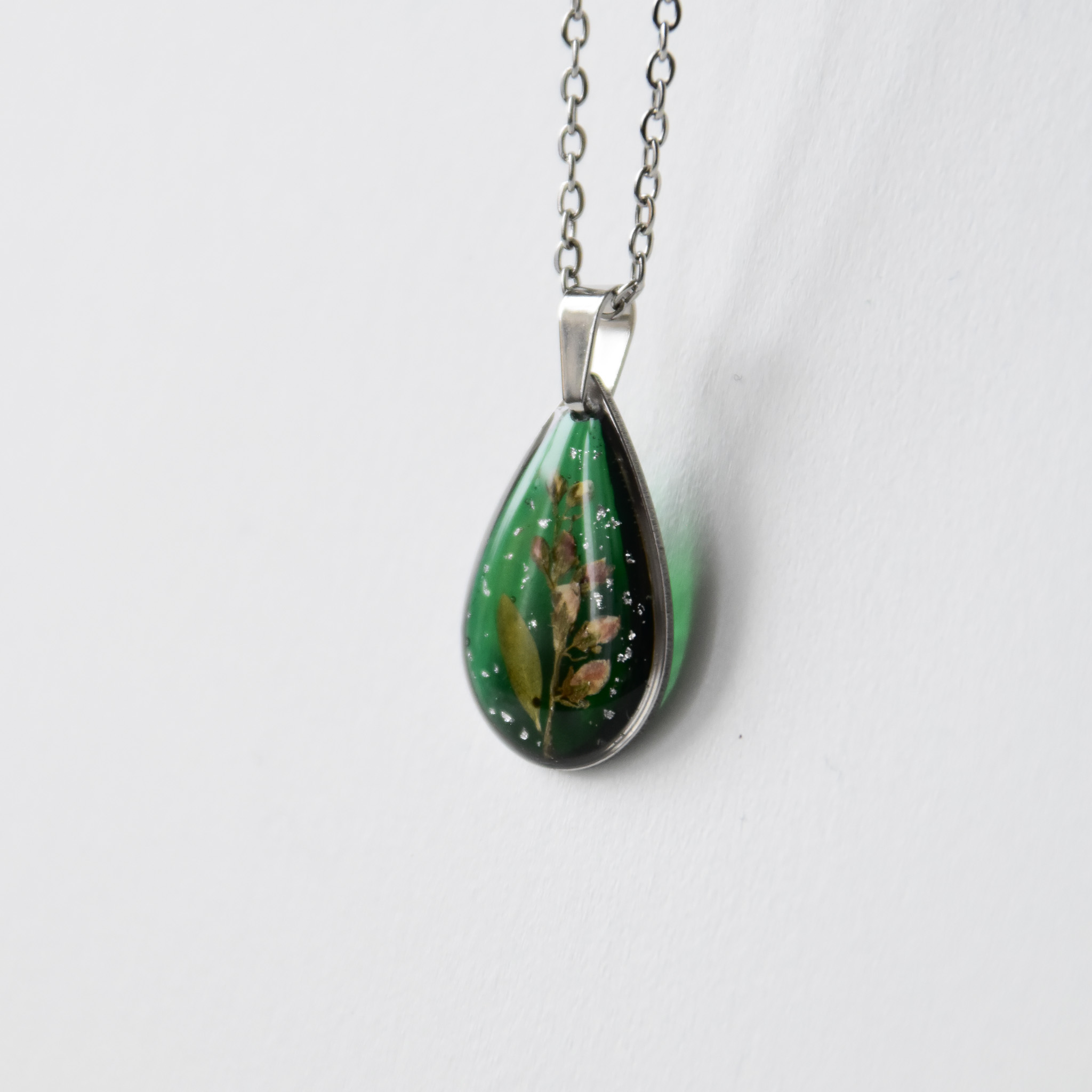 naszyjnik – zielona łezka z gałązką i srebrnym śniegiem