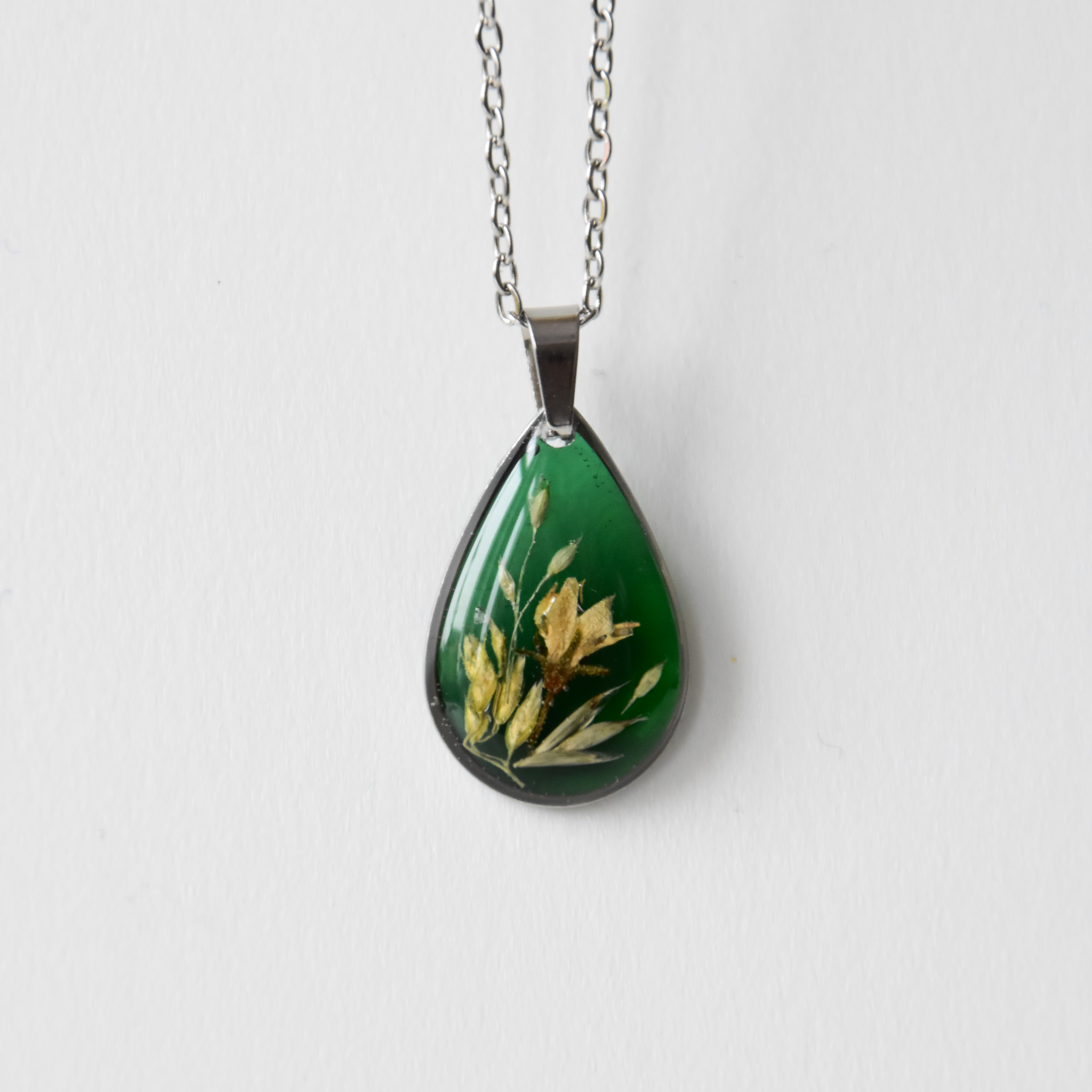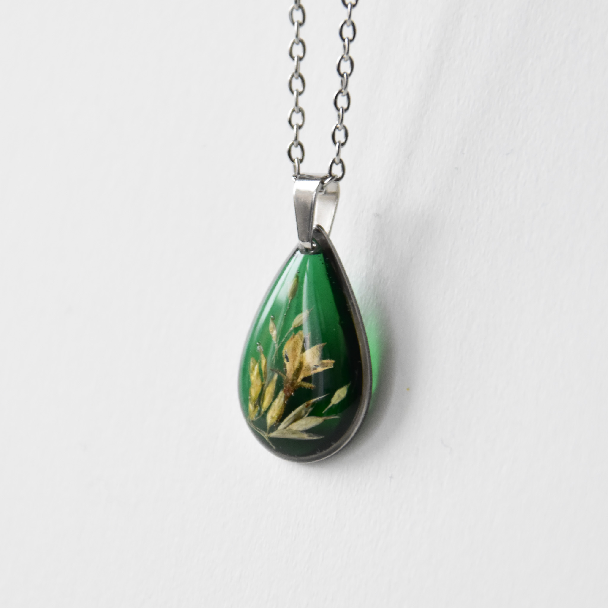 naszyjnik – zielona łezka z jasnymi roślinami